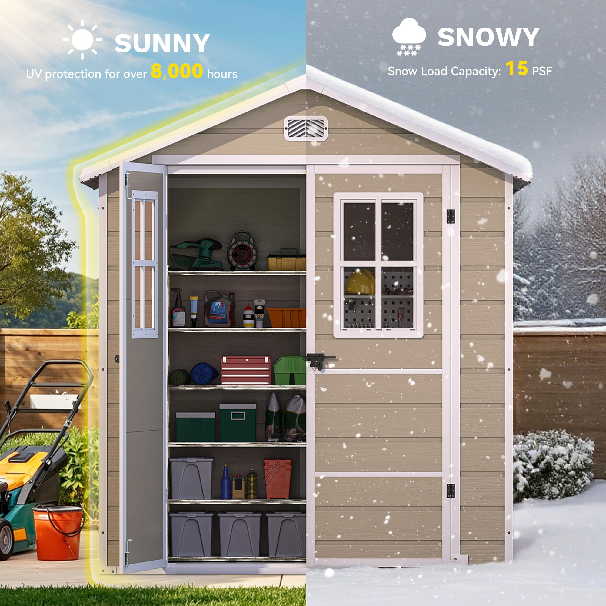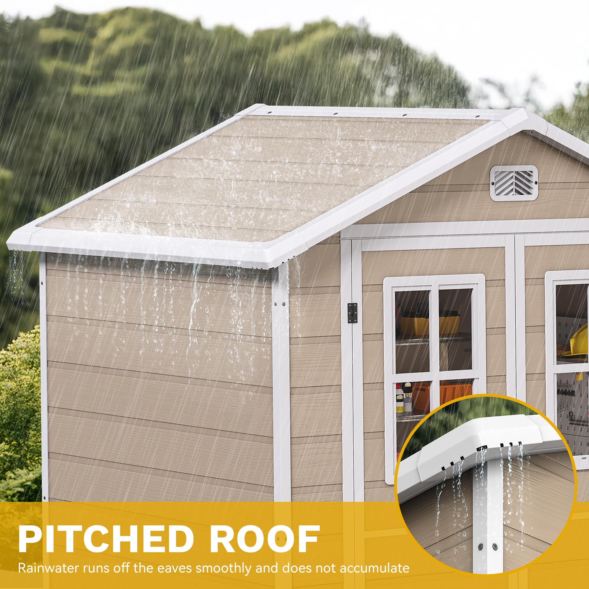 Durable & All-weather Resin Build: Made from 12mm thick extruded polystyrene (XPS), this plastic storage shed ensures long-term use and resists rust, corrosion, and fading while being green. Its UV protection ensures your storage stays vibrant and weatherproof through every season
