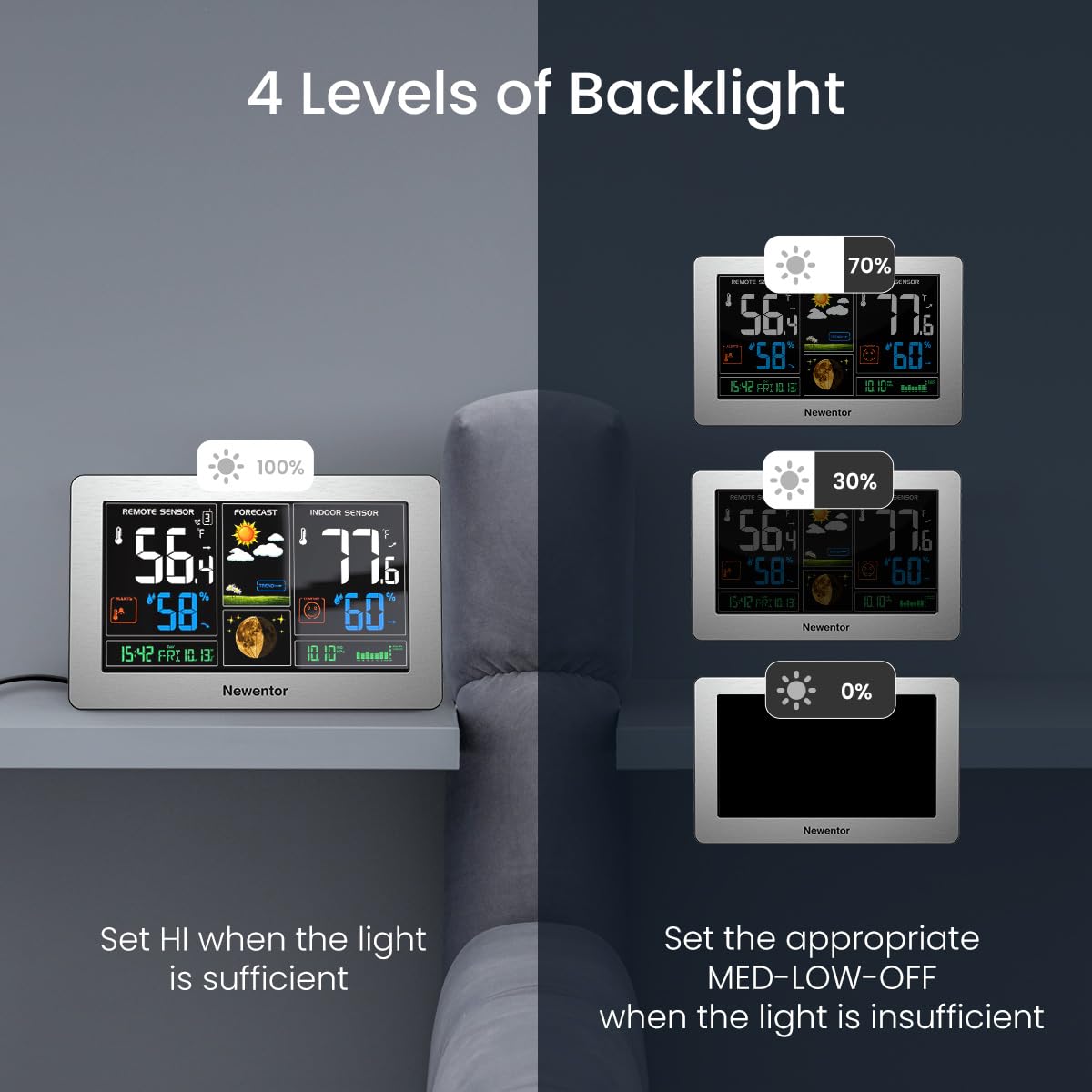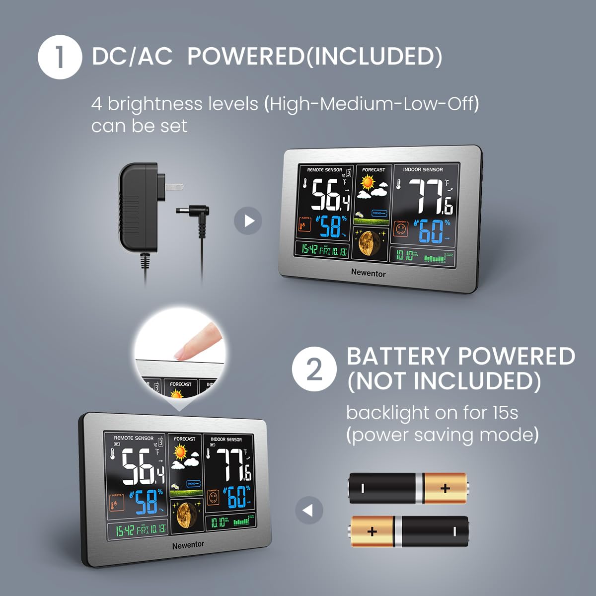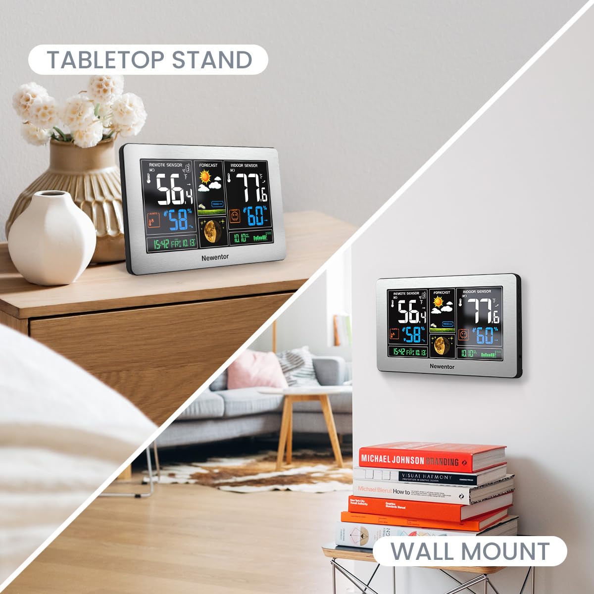 [7.5" LCD Screen Weather Stations] Newentor temperature&humidity monitor with large color display, which shows comprehensive information: inside outside temperature humidity(max/min, hi/lo), customizable alerts, time/date, alarm clock/snooze, weather forecast (next 8-24 hrs) moon phase, barometric pressure.