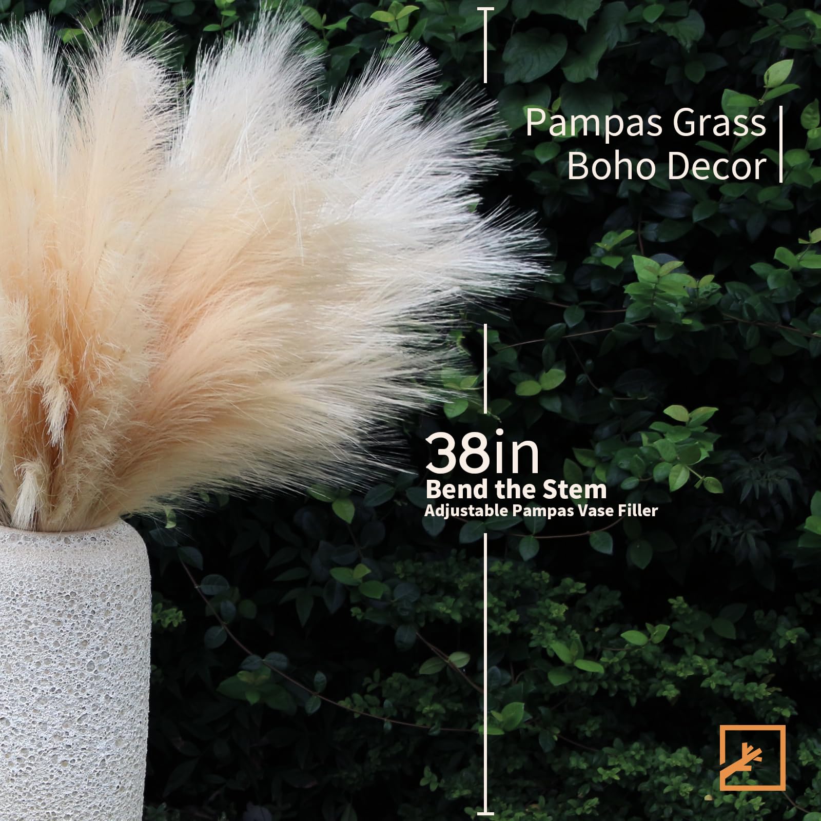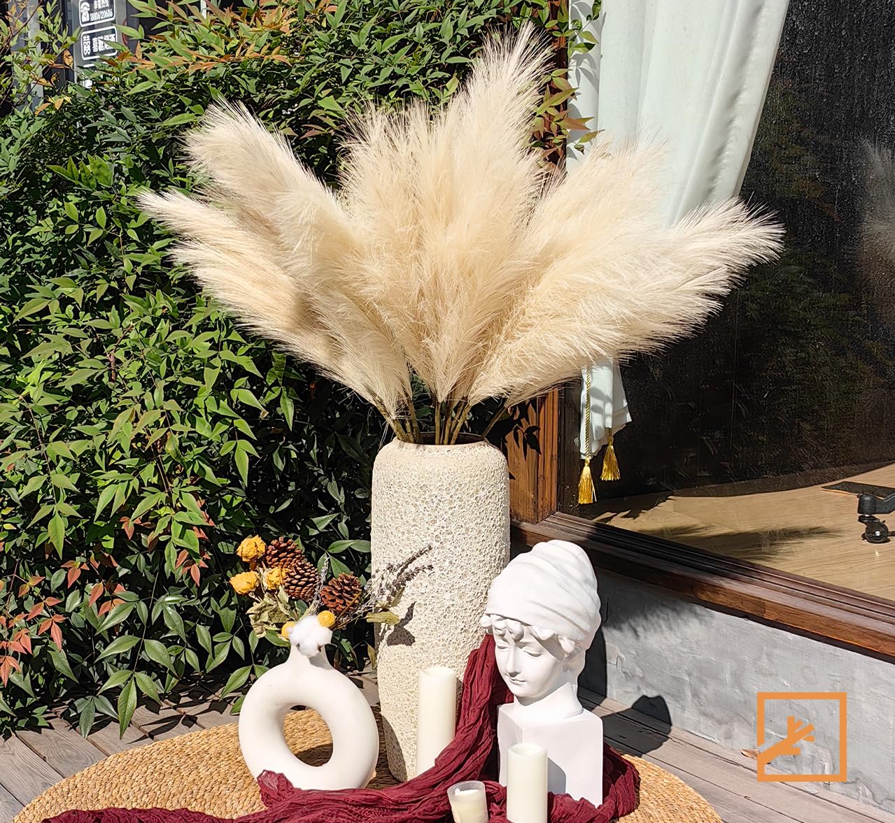 [Fluffy and Durable]: Each stem is full and elegant. The light and feathery plumes gives you the beauty of lush pampas. Simply fluff it up and put it in a vase to add some charm to your home decor. The pampas grass decor requires no maintenance or watering.