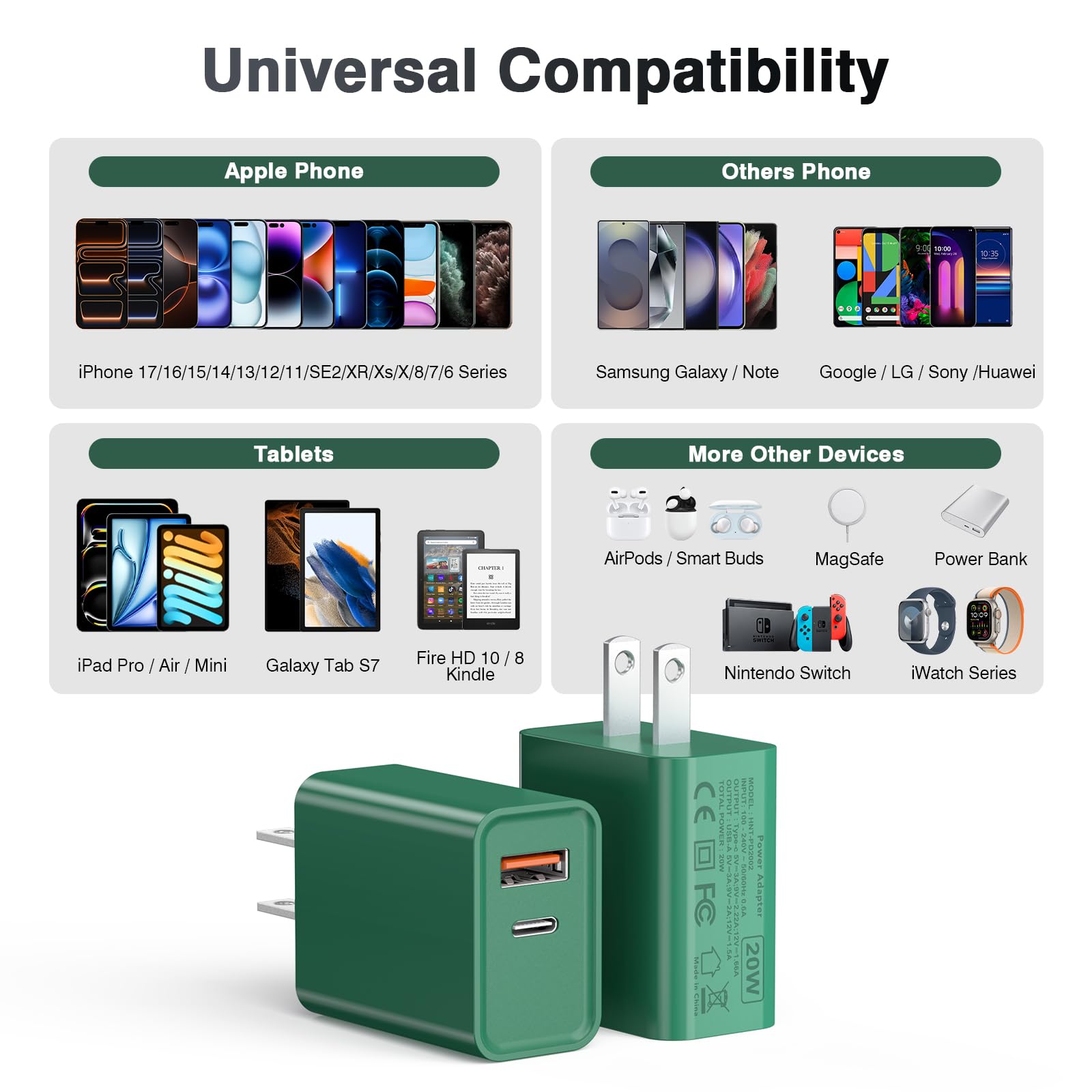 Universal Compatation: Designed for iPhone 17/16/15/14/13/12/11 Pro/Pro Max/Plus. The USB charging adapter is compatible for iPhone, iPad, iPod, smartphone, MP3 / MP4 players, play equipment, GPS devices, PC tablet, Google Nexus Tablet, Samsung Galaxy Tab and other digital devices compatible