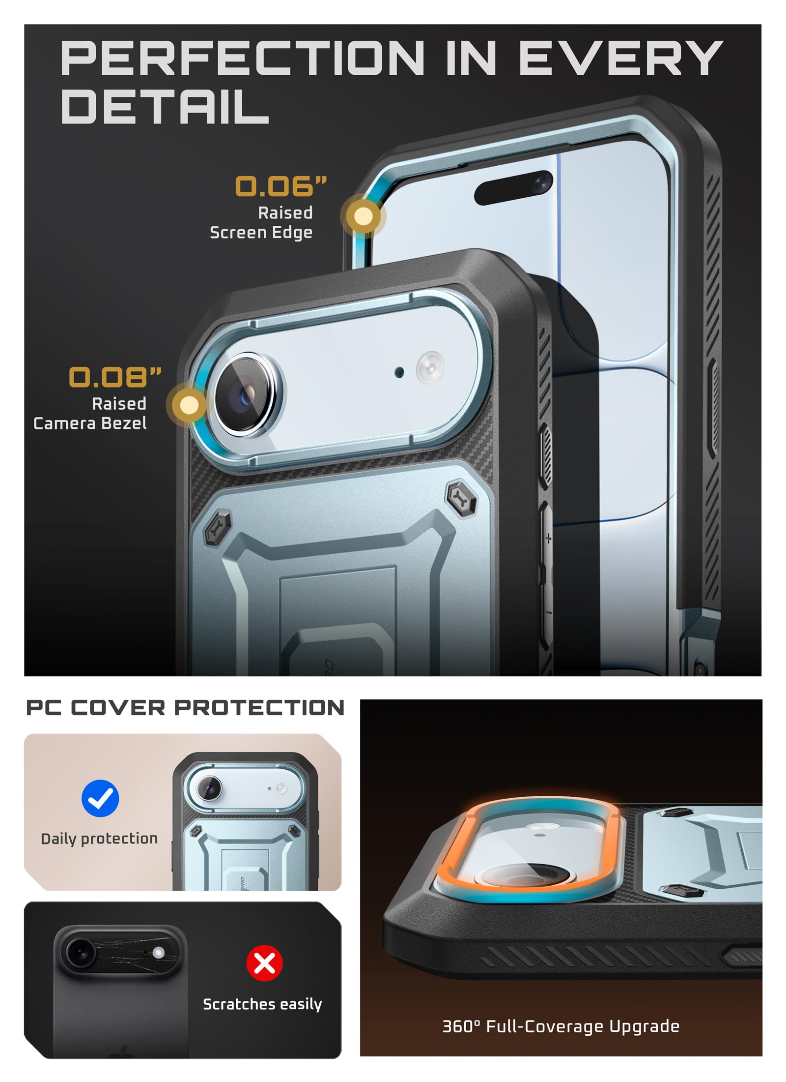 Engineered for Ultimate Defense: Survives drops up to 20 ft (6 m) with military-grade impact resistance (MIL-STD-810H-516.6 certified). Built with a hybrid TPU + PC frame, reinforced corner airbags, and a PET built-in screen protector. Precision-raised edges (1.5 mm camera lip, 2 mm screen lip) and an ultra-slim ~3.94 mm back profile keep your device safe.