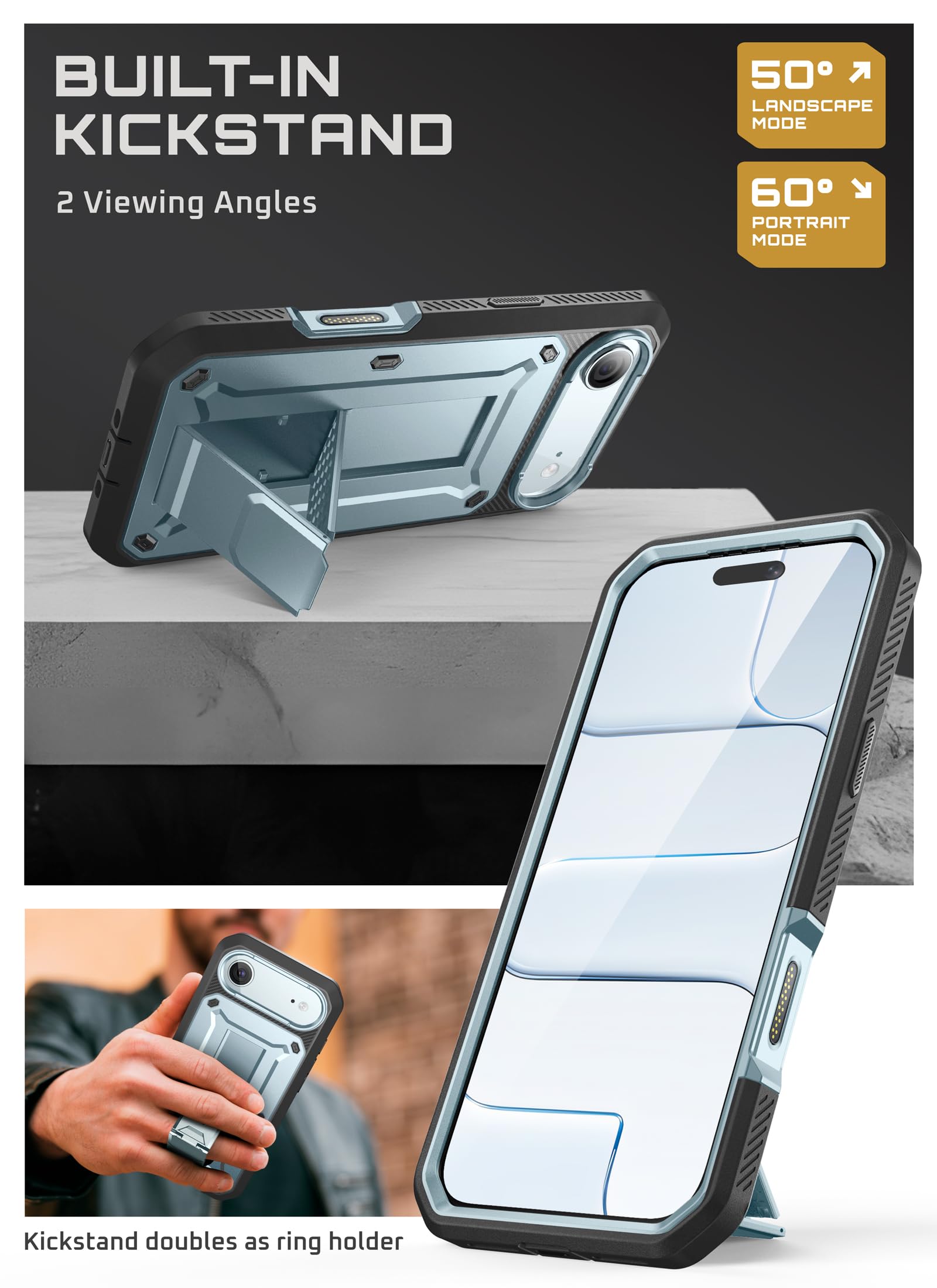Enjoy hands-free viewing in any orientation. The built-in kickstand provides stable, multi-position support—provide 50° for landscape or 60° for portrait. The easy-access design pops open instantly.
