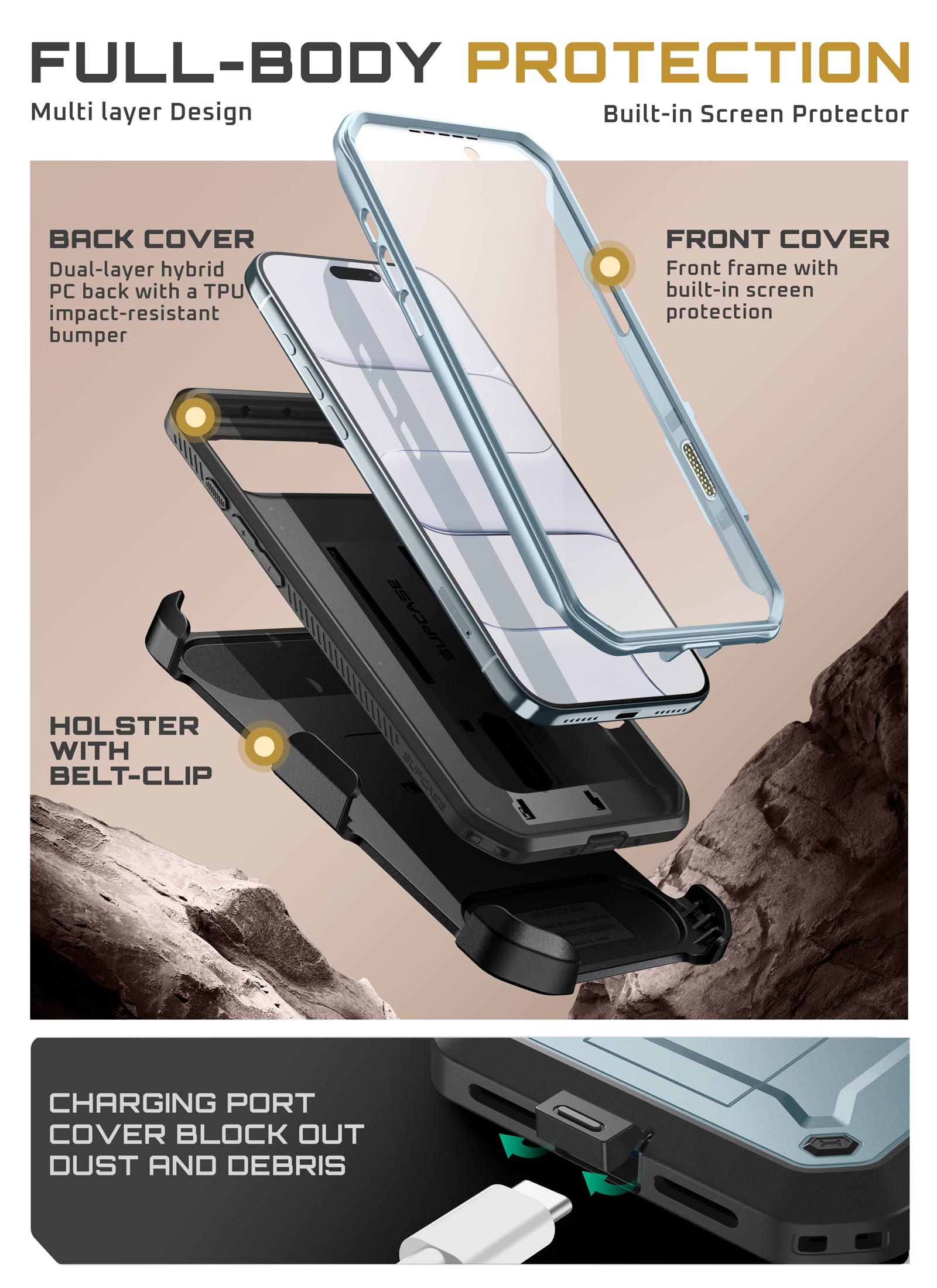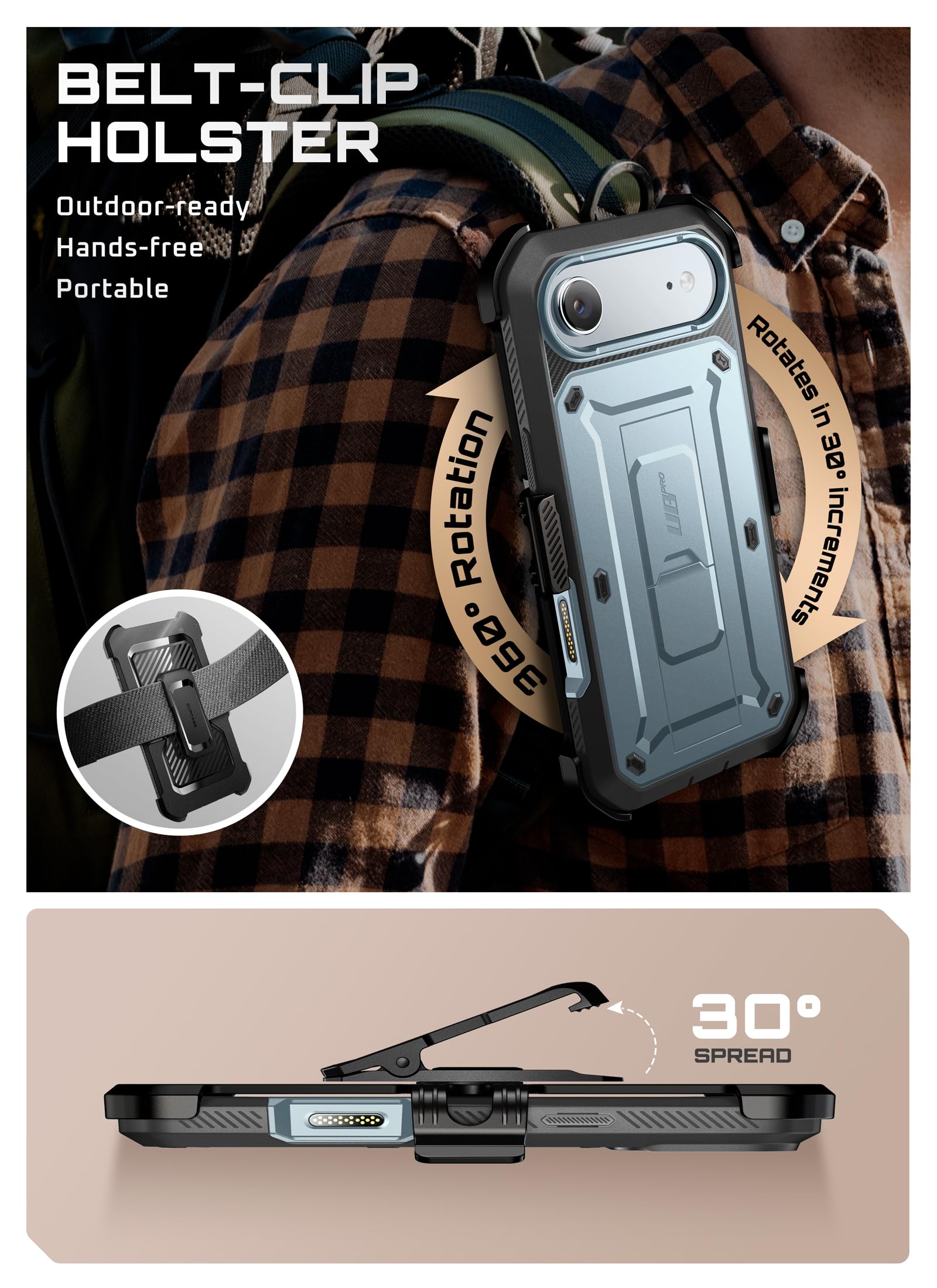 A detachable 360° belt clip is included. The fully rotating holster provides hands-free convenience, while secure side clasps let you snap the case on and off effortlessly. Ready for work, travel, and outdoor adventures.