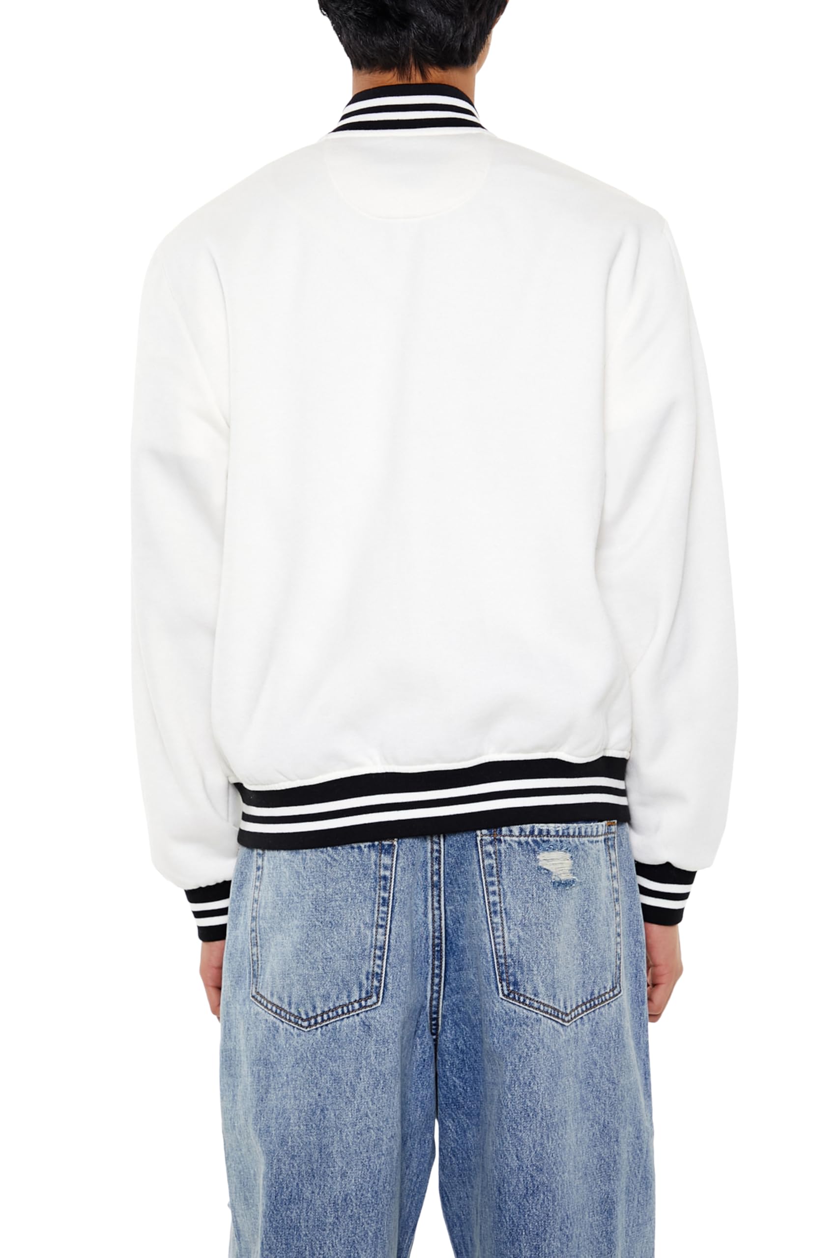 Description A fleece bomber jacket featuring varsity-striped trim, long sleeves, snap-button front closures, and slant front pockets.