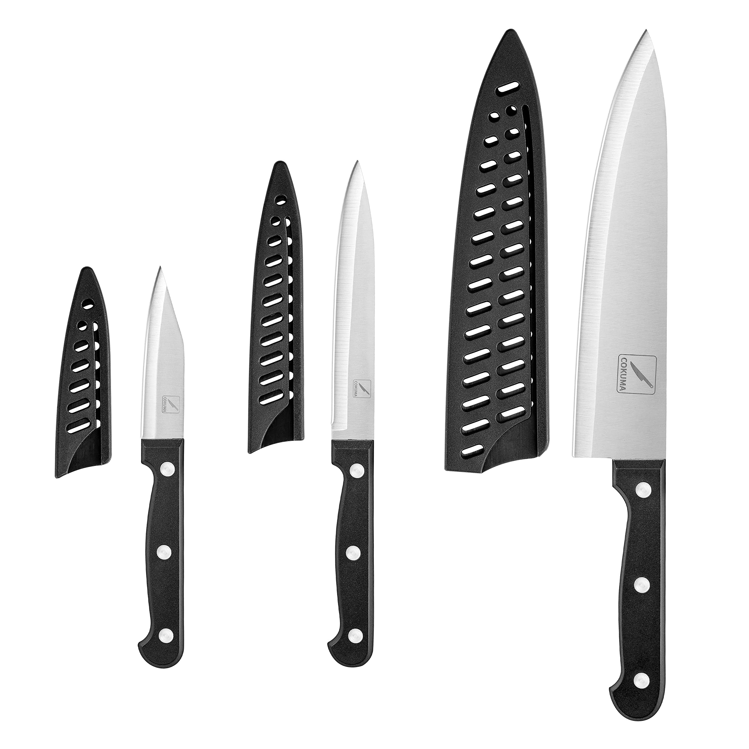 5. What you got: 8 Inch chef’s Knife, 4.5 Inch utility Knife, 4 Inch paring knife and three matching Knife cover. Both Knives and Sheaths are 100% BPA free and lead free. Hand wash is recommended for best performance.