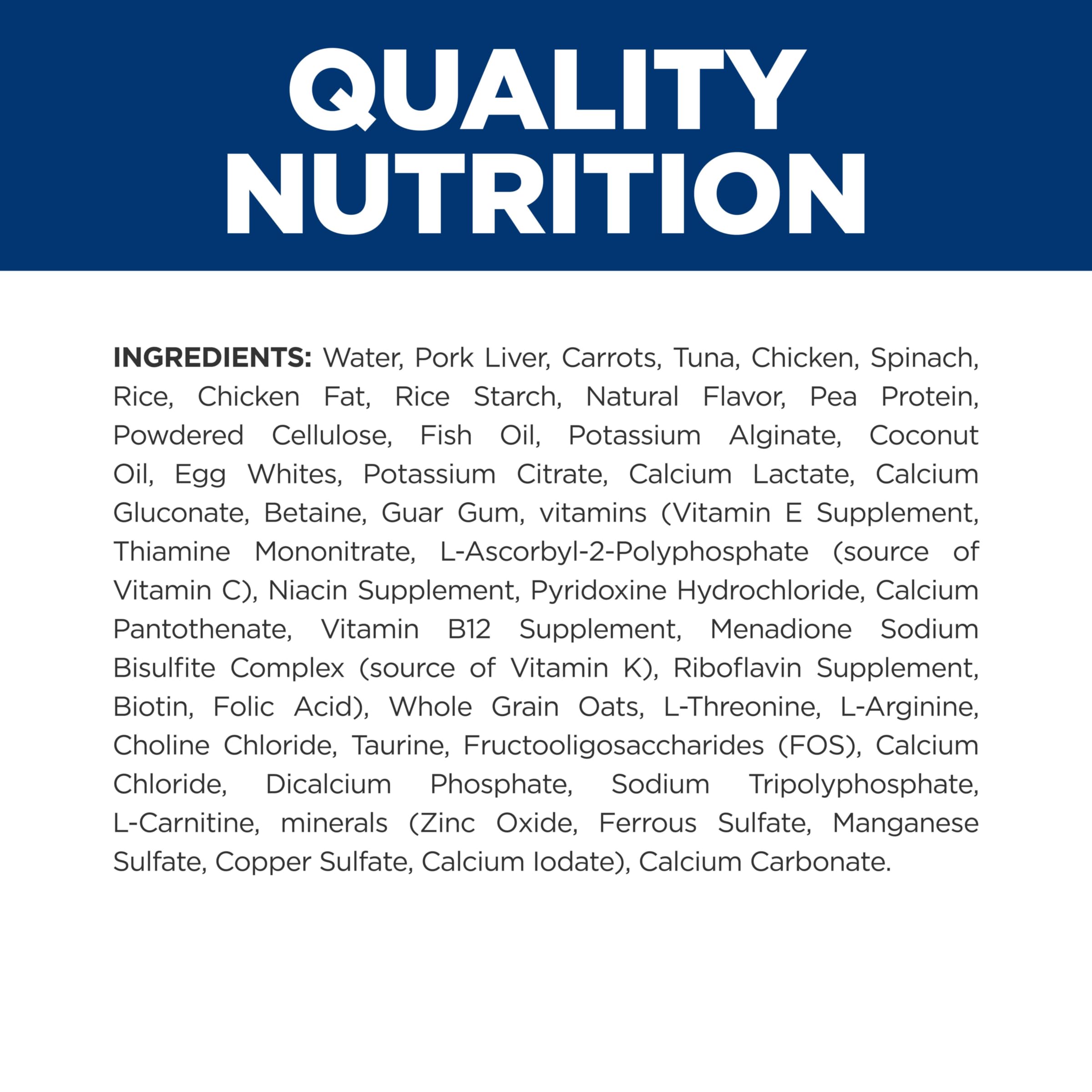 Prescription Diet k/d Kidney Care Vegetable & Tuna Stew Cat Food is clinical nutrition proven to improve and lengthen quality of life in cats. Formulated with ActivBiome+ Kidney Defense, a proprietary blend of prebiotics shown to activate the gut microbiome to help protect kidney function.It’s made in the USA with global ingredients you can trust, and was developed by Hill’s nutritionists and veterinarians. This food contains a high level of essential amino acids, the building blocks of muscle protein. It is also formulated to promote a urinary environment that reduces the risk of developing struvite and calcium oxalate crystals. Please consult your veterinarian for further information on how Prescription Diet foods can help your cat continue to enjoy a happy and active life.
