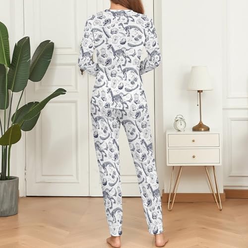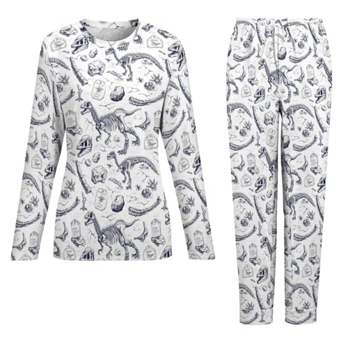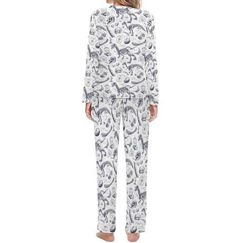 Pajama Sets for Women 2 Piece: This Sketch Dinosaur Skull Print pajamas for women set features a timeless round neck long sleeve top and a pair of pants with handy pockets. Fashion-forward yet comfortable, this pj sets for woman is perfect whether you're winding down at home or just getting ready to sleep. Its versatility makes it an ideal choice for fall pajamas women collections