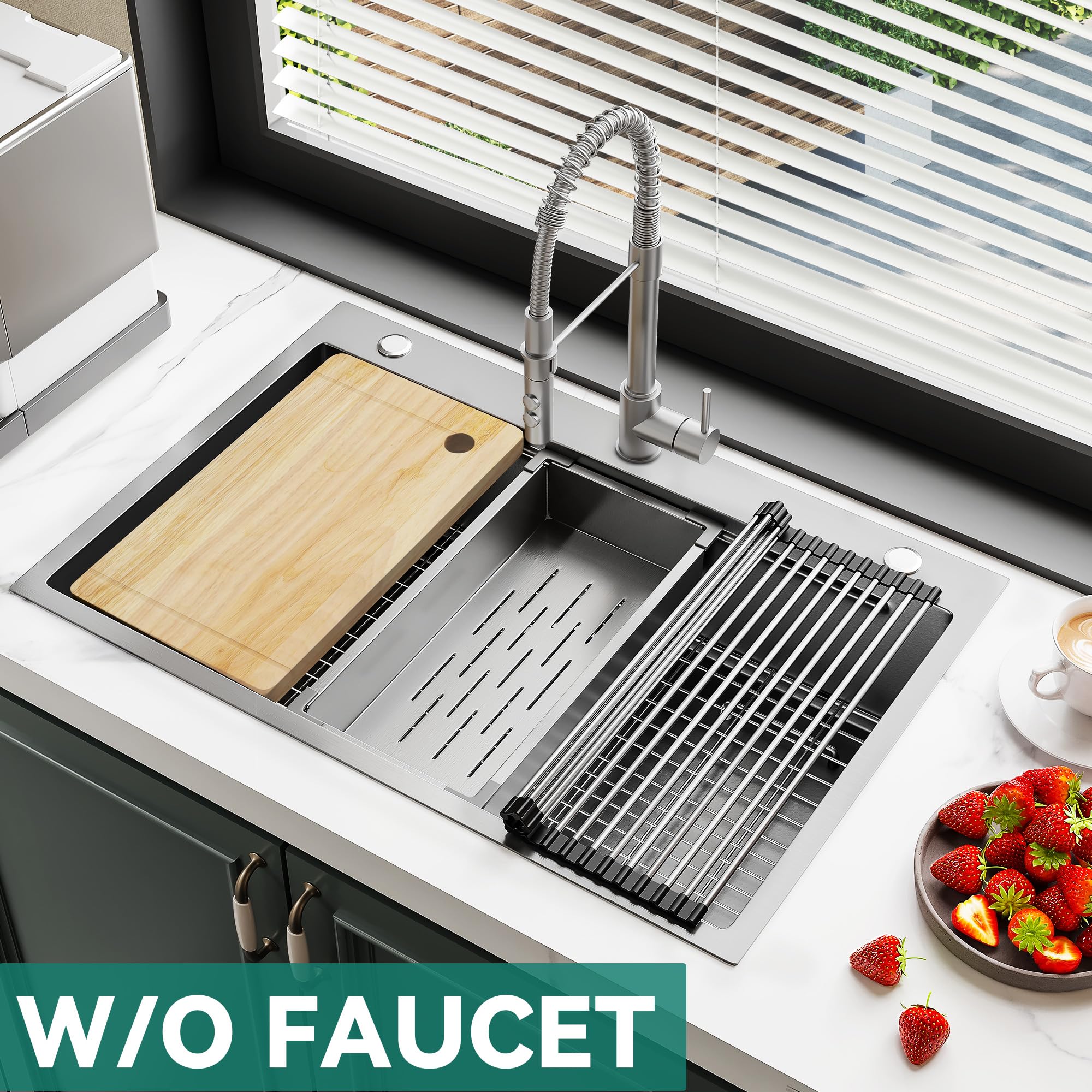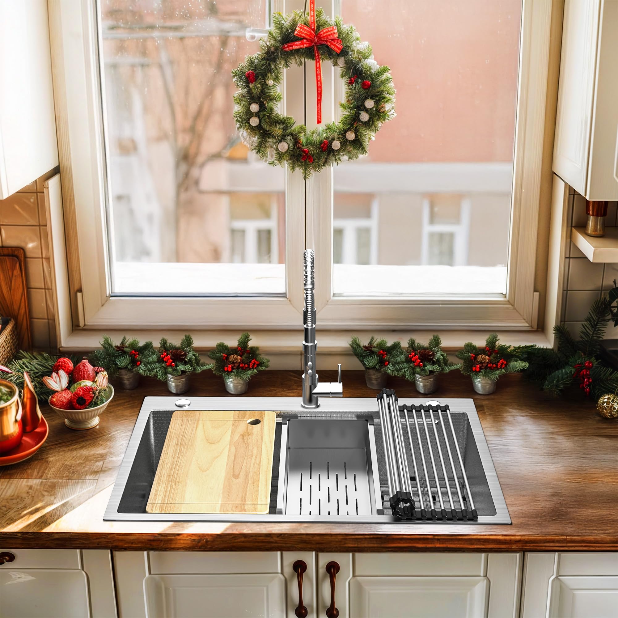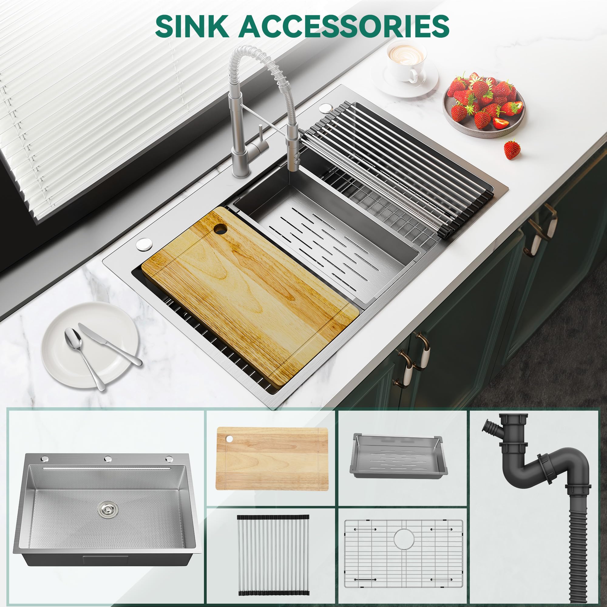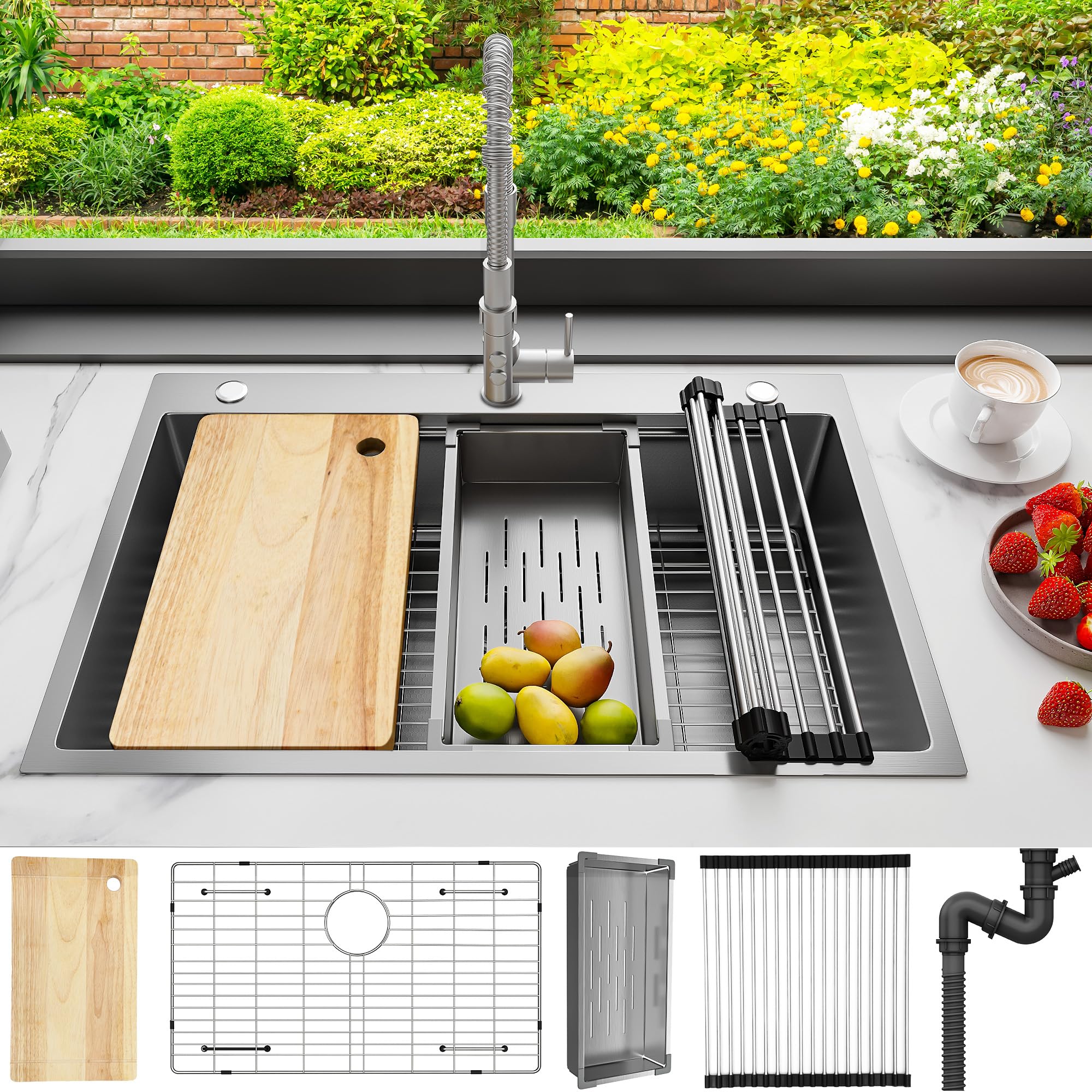 Ultimate Workstation Sink: Transform your single sink kitchen into a prep hub with accessories like a sliding ledge, cutting board, drainage basket, roll-up rack, bottom grid, and basket strainer; Great for homes, businesses, bars, or RVs (faucet not included)