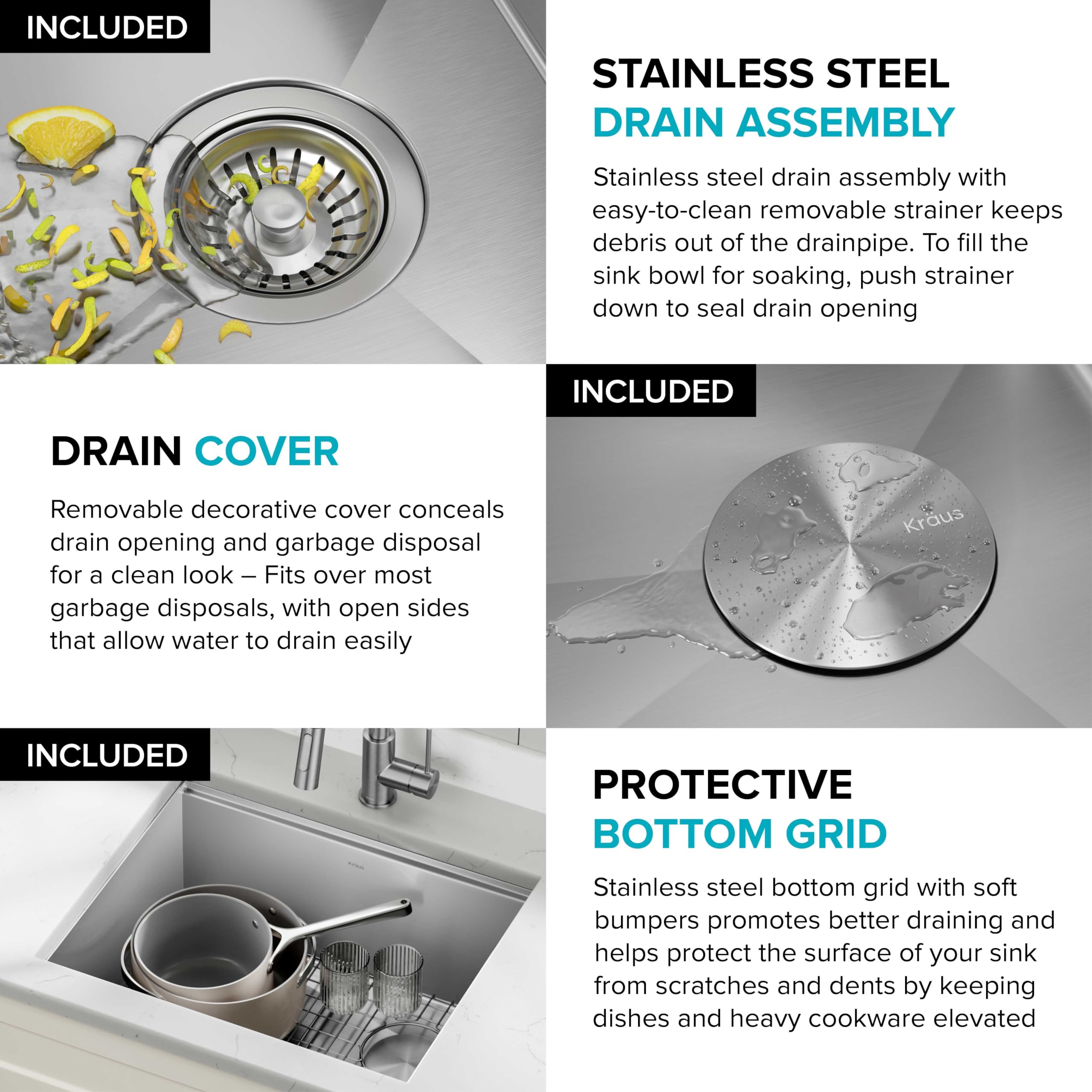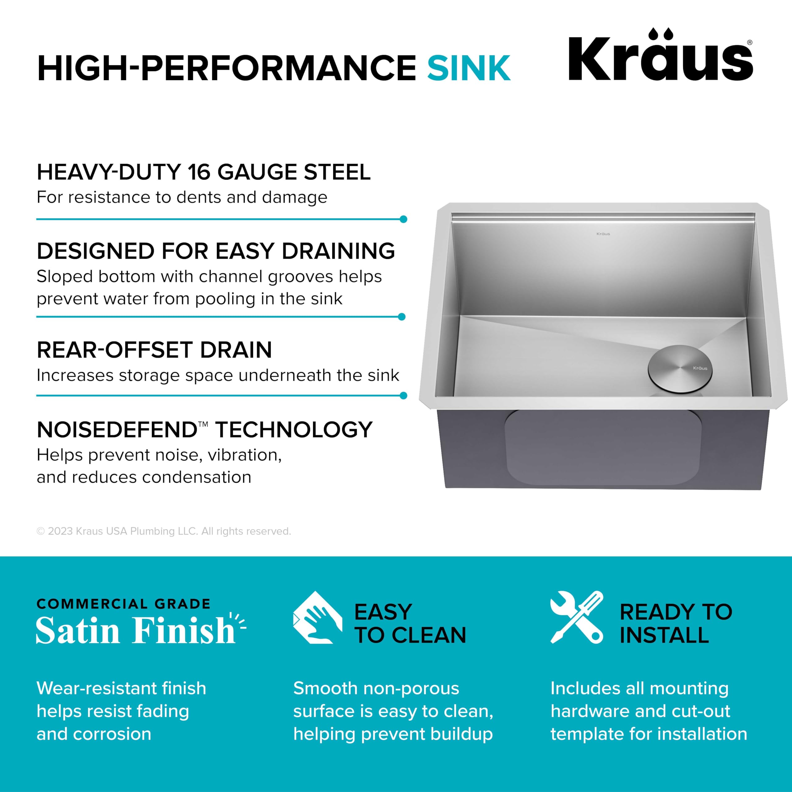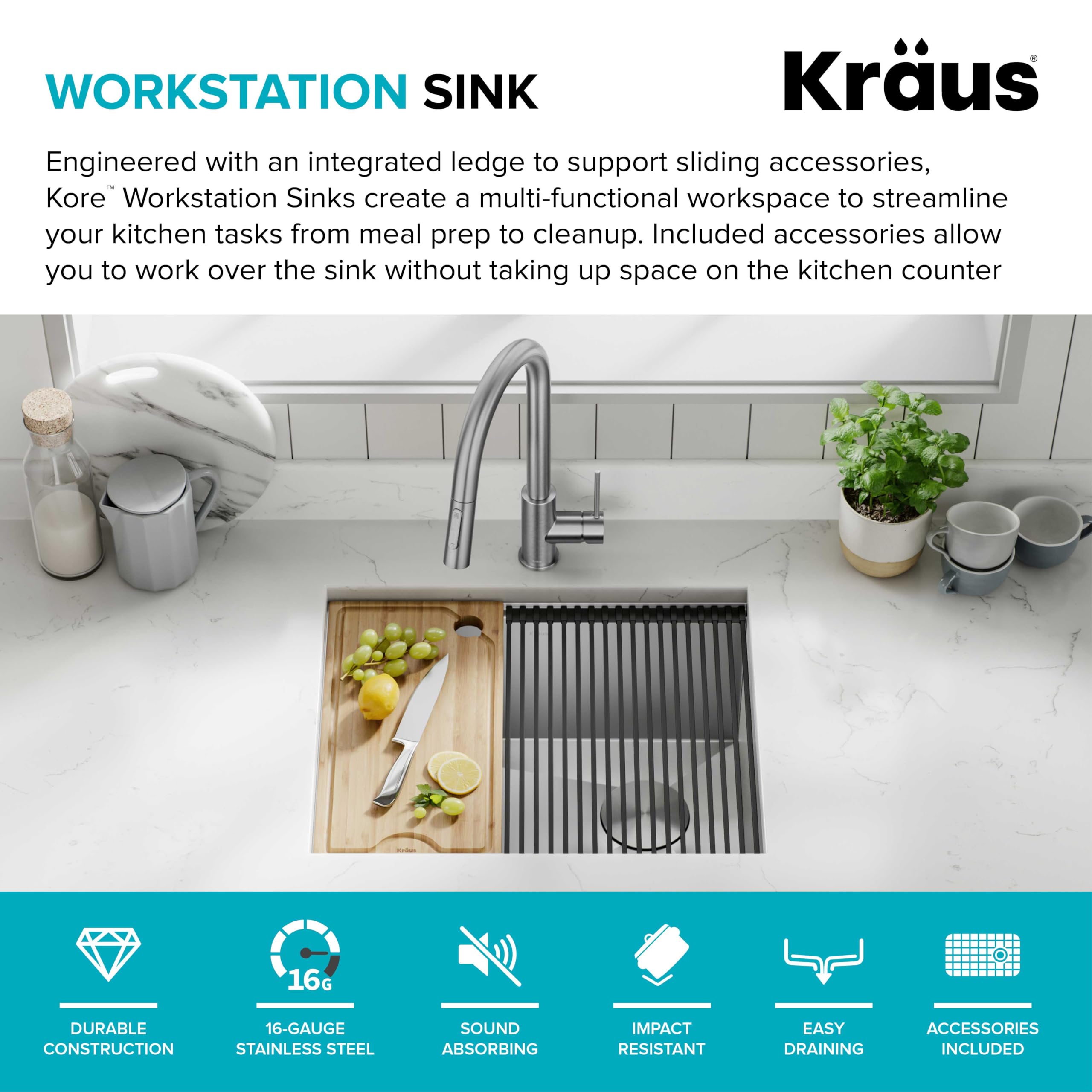 The Kore workstation sink is engineered with an integrated ledge for accessories, creating a multifunctional workspace that minimizes clutter around the sink. Kit includes cutting board and roll-up dish rack that allow you to work right over the kitchen sink. Thick 16-gauge stainless steel sink offers maximum durability. Undermount sink installation creates a seamless transition from sink to countertop for a modern look and easy cleaning. Large NoiseDefend sound dampening pads reduce sink noise for a quieter kitchen. Smooth satin finish makes the stainless steel kitchen sink easy to keep clean, with channel grooves for better draining. Sink for kitchen comes with grid, drain, and hardware for undermount kitchen sink installation. Also available in drop in sink design.