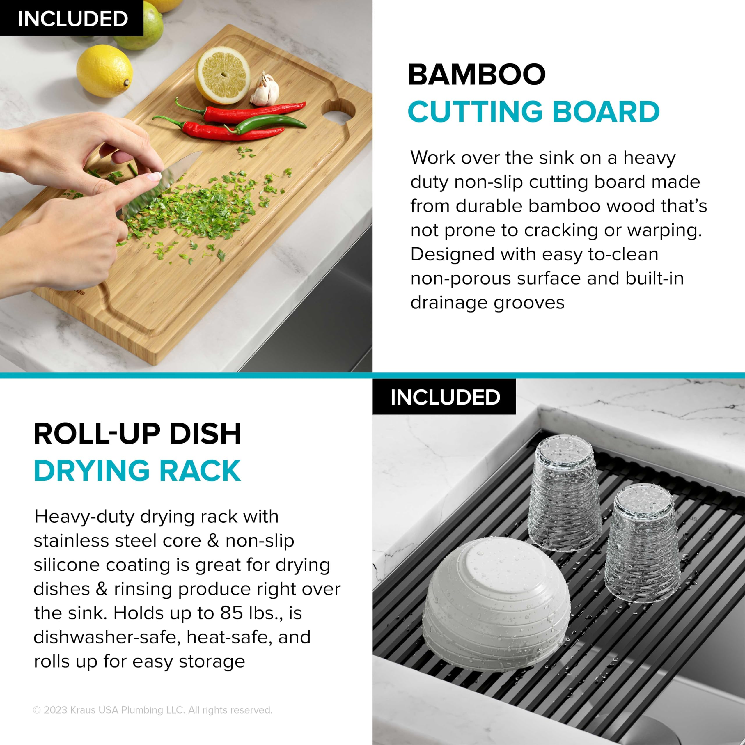 WORKSTATION SINK with integrated ledge for sliding accessories allows you to work right over the sink while minimizing clutter on the kitchen counter – Chop and slice on the durable bamboo cutting board or dry dishes on the heavy-duty rolling mat