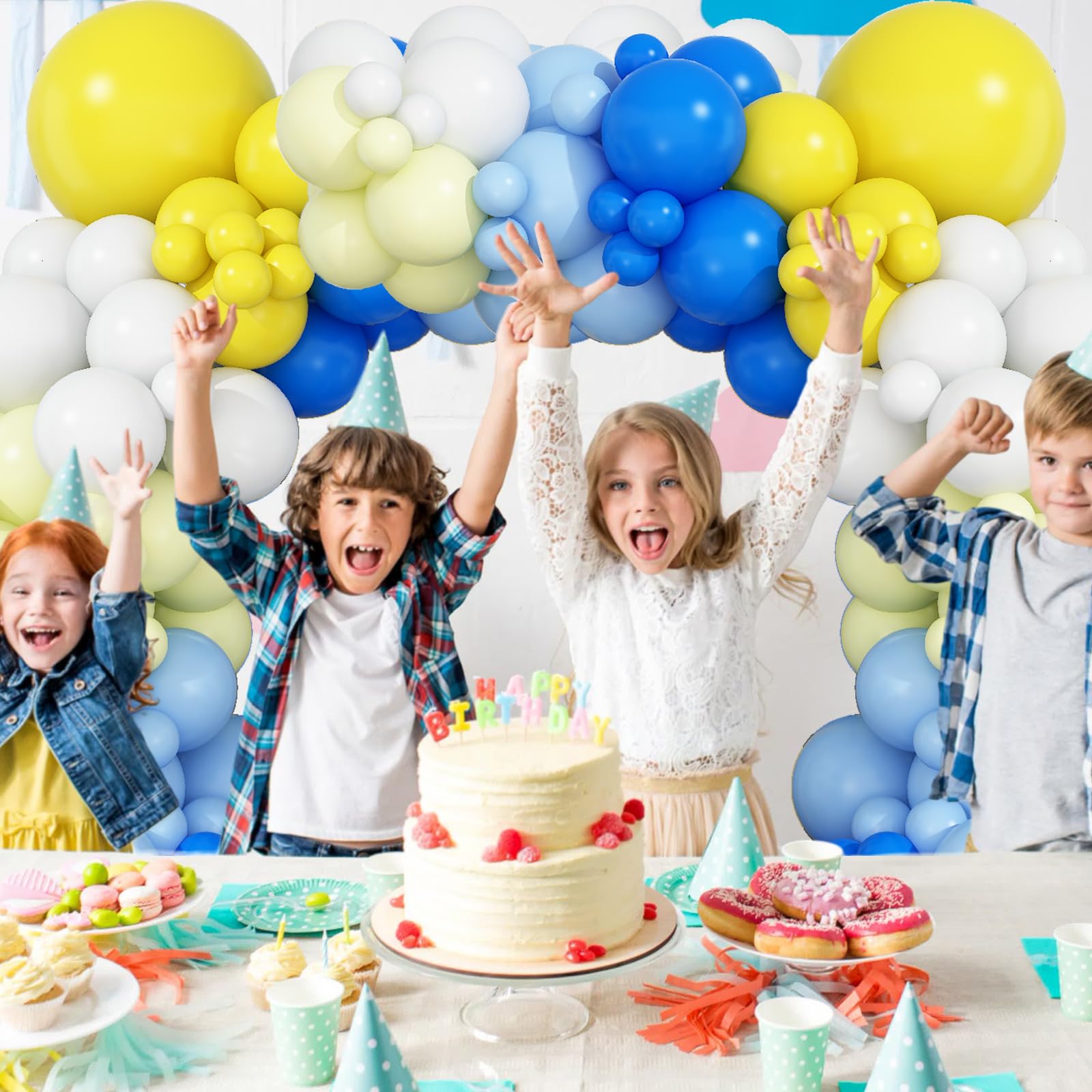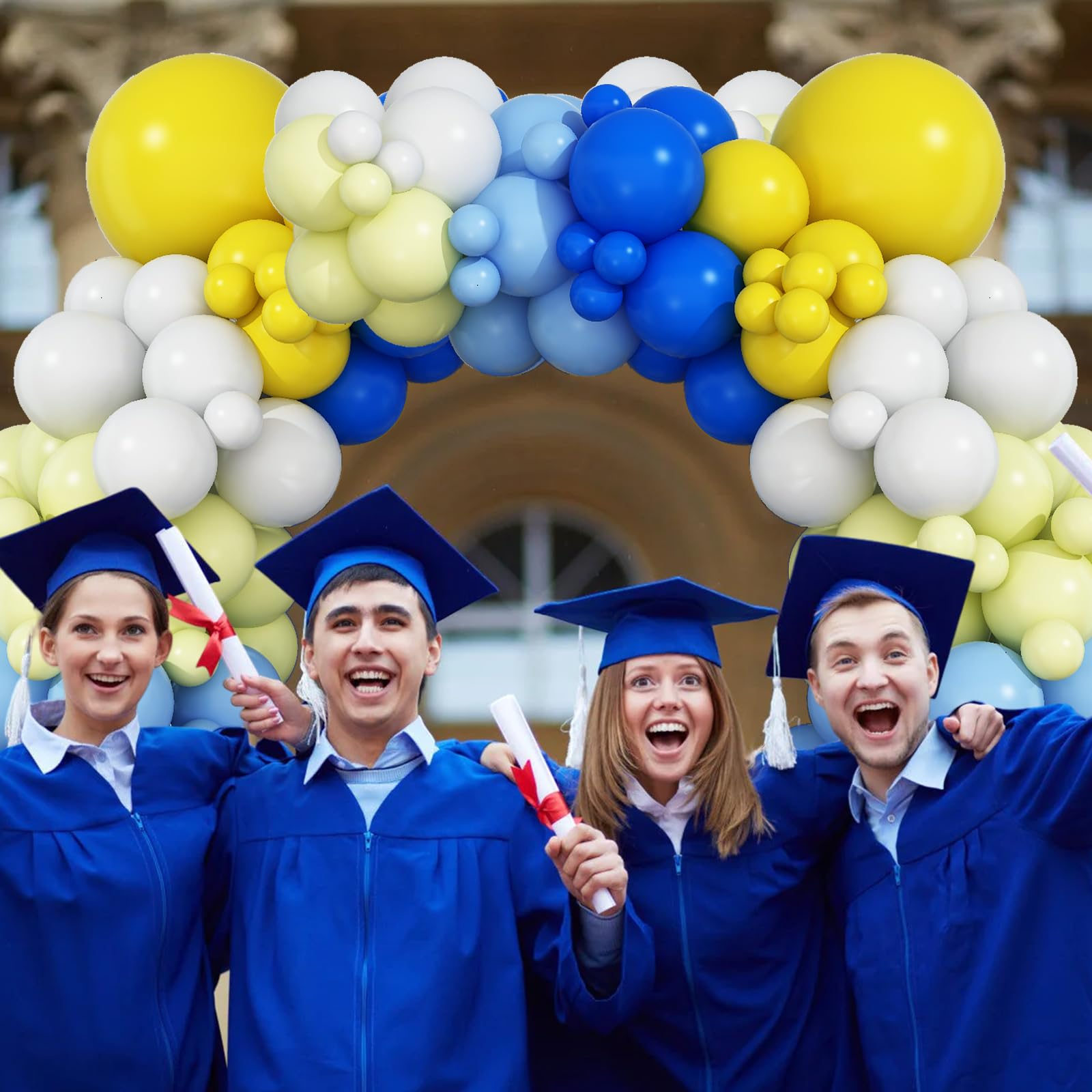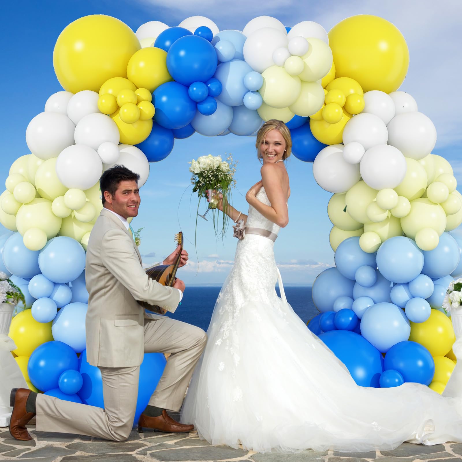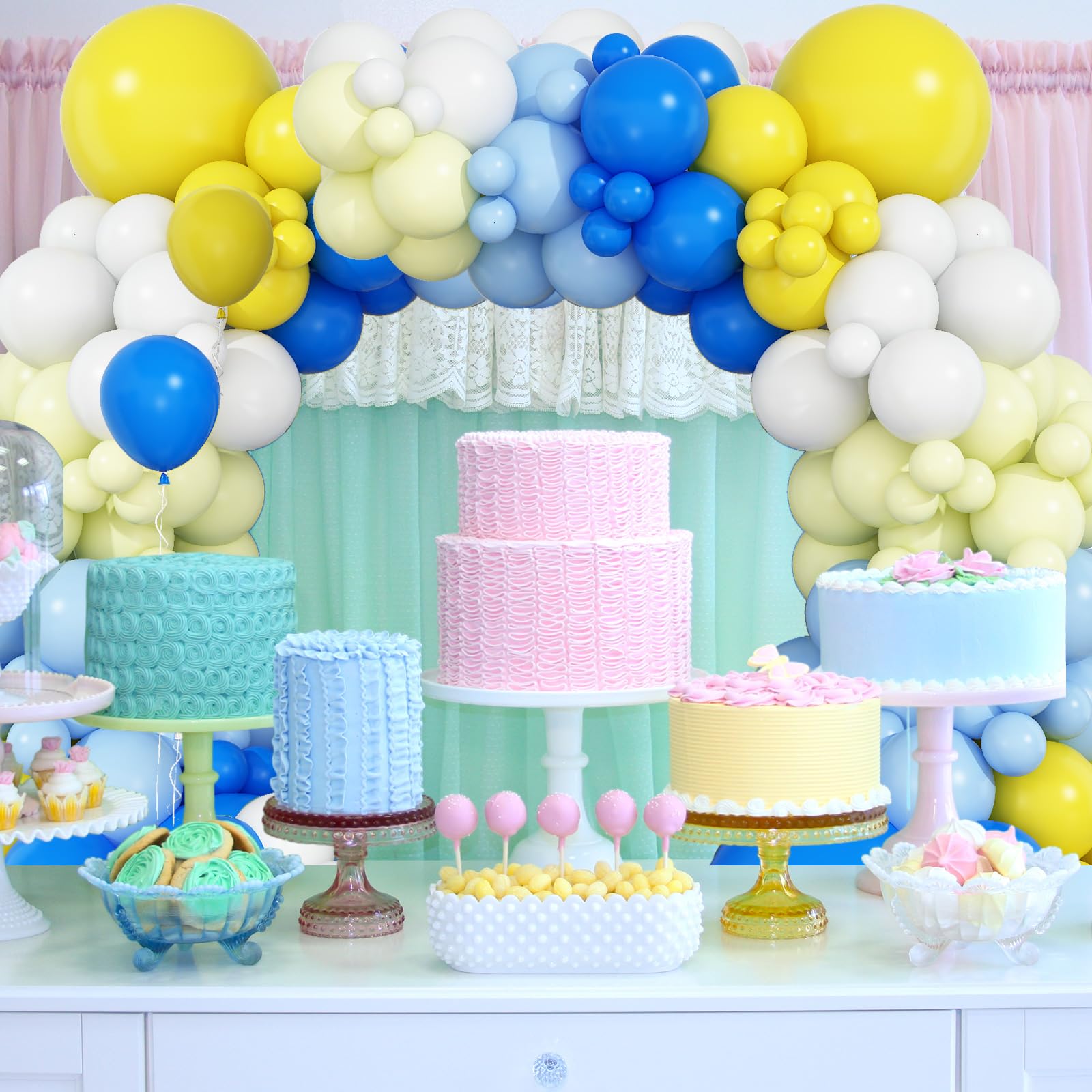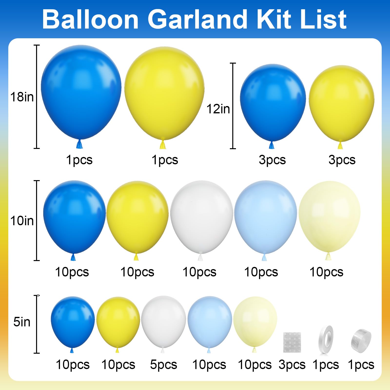 šćBlue Balloon ArchćThe yellow blue balloons garland kit consists of 5/10/12/18-inch latex balloons, including dark blue latex balloons*24, yellow latex balloons*24, pastel blue latex balloons*20, pastel yellow latex balloons*20, white latex balloons*15, 5m balloon chain, sticky dots, 10m balloon ribbon.;