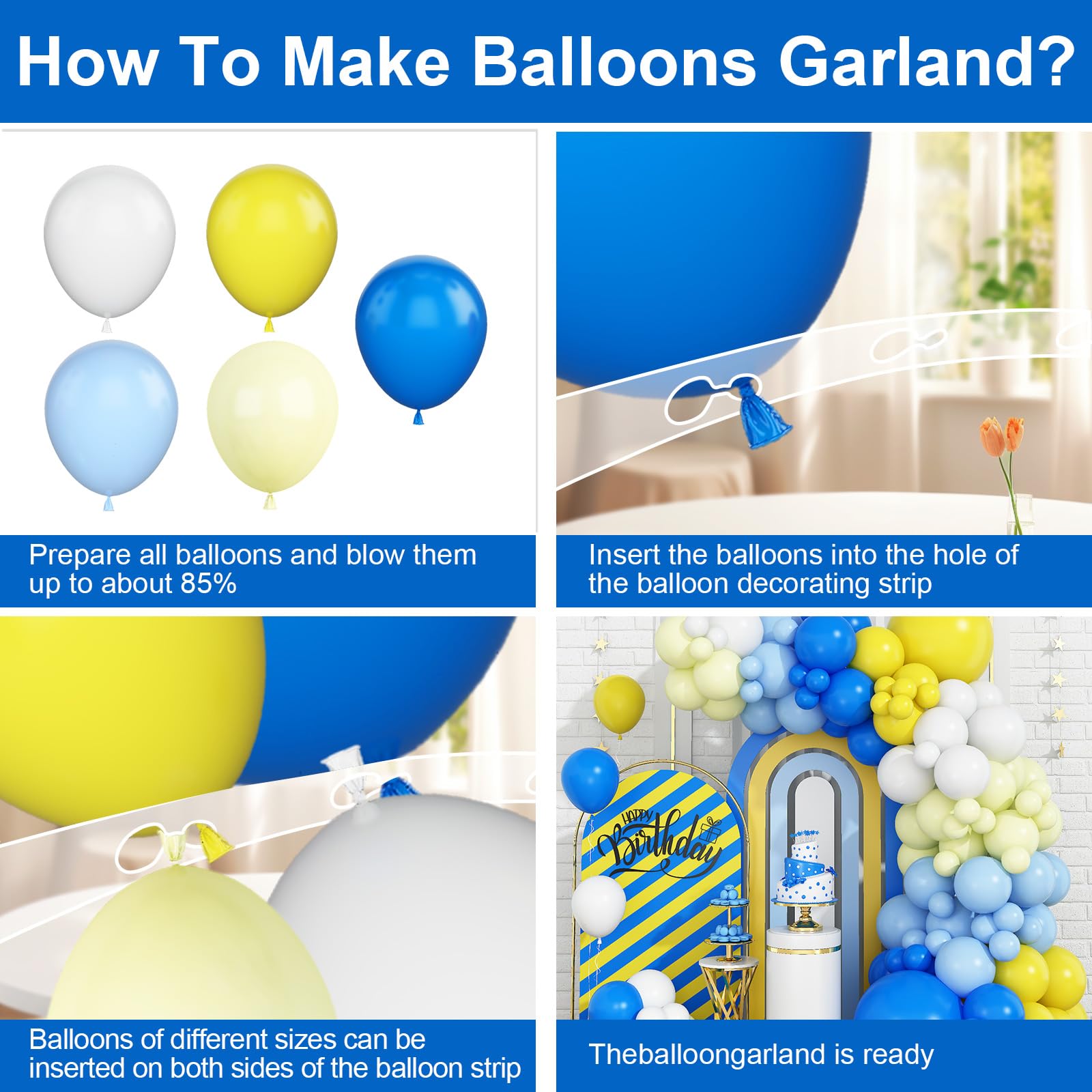 šćEasy To AssemblećJust inflate the latex balloons to different sizes, secure them with knot ties, and use tape and dots of glue to design the blue and white balloons garland you want. These latex balloons can be filled with air or helium to decorate any indoor or outdoor party.;