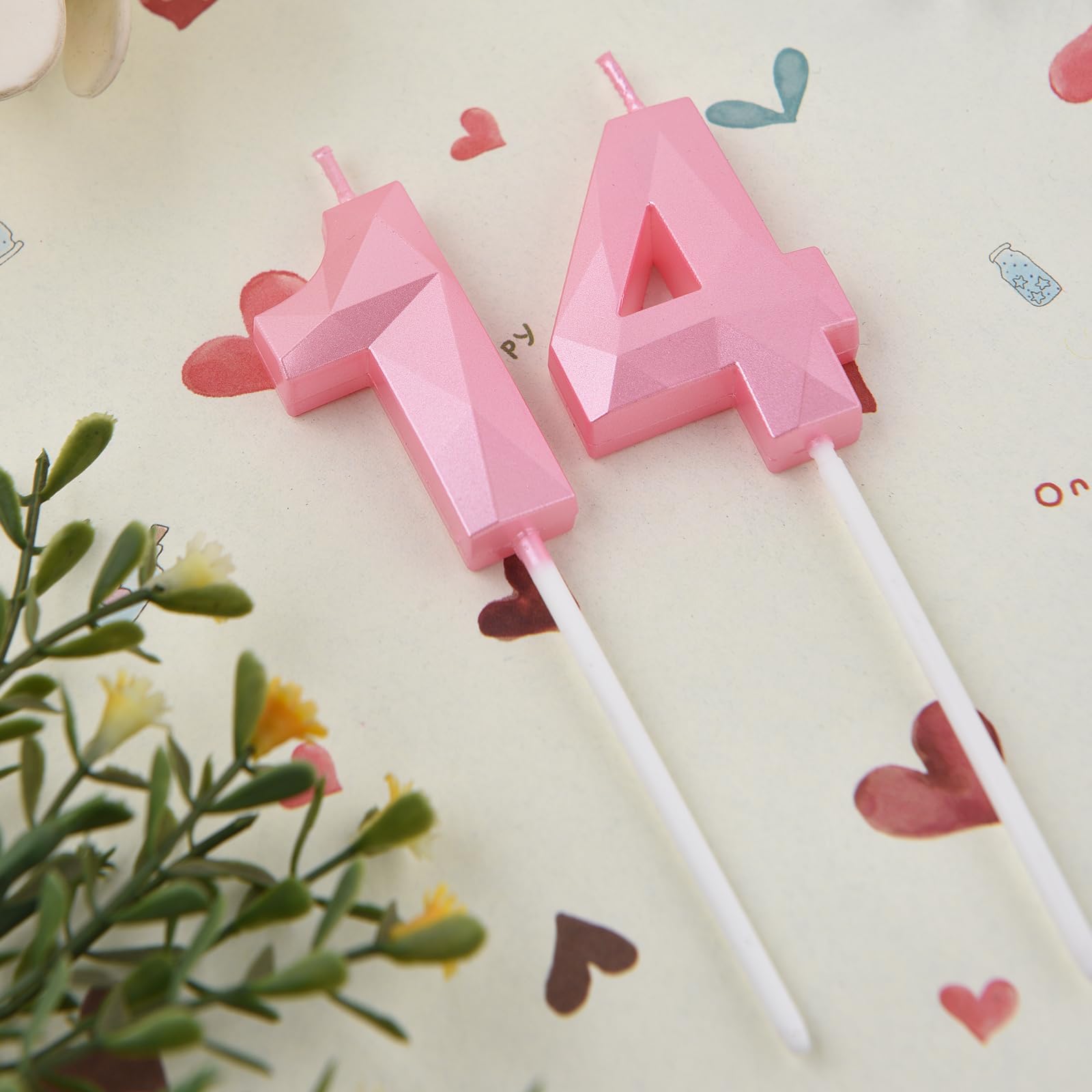 INSTRUCTIONS: Package Include: 2 pcs candles,Number 14 birthday candles Color : Glitter Pink Material : quality wax ,smokeless and non-toxic Size: Width:1.4 in. Number height: 1.97 in. Total height: 4.9 in Please Note : Warm Note:Please keep the candles in shade away from the fire