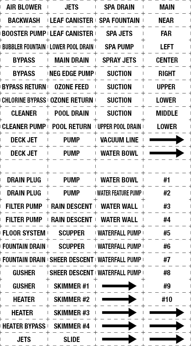 CRAFTMARK Premium Grade Sheet-Form pool & spa markers are perfect for marking piping and equipment on any new or existing pool. Markers are printed on ultra-durable, indoor-outdoor, extended life, pressure sensitive adhesive vinyl. Markers come pre-cut and ready to peel-off the sheet for ease of application to any clean and dry pipe or equipment surface.