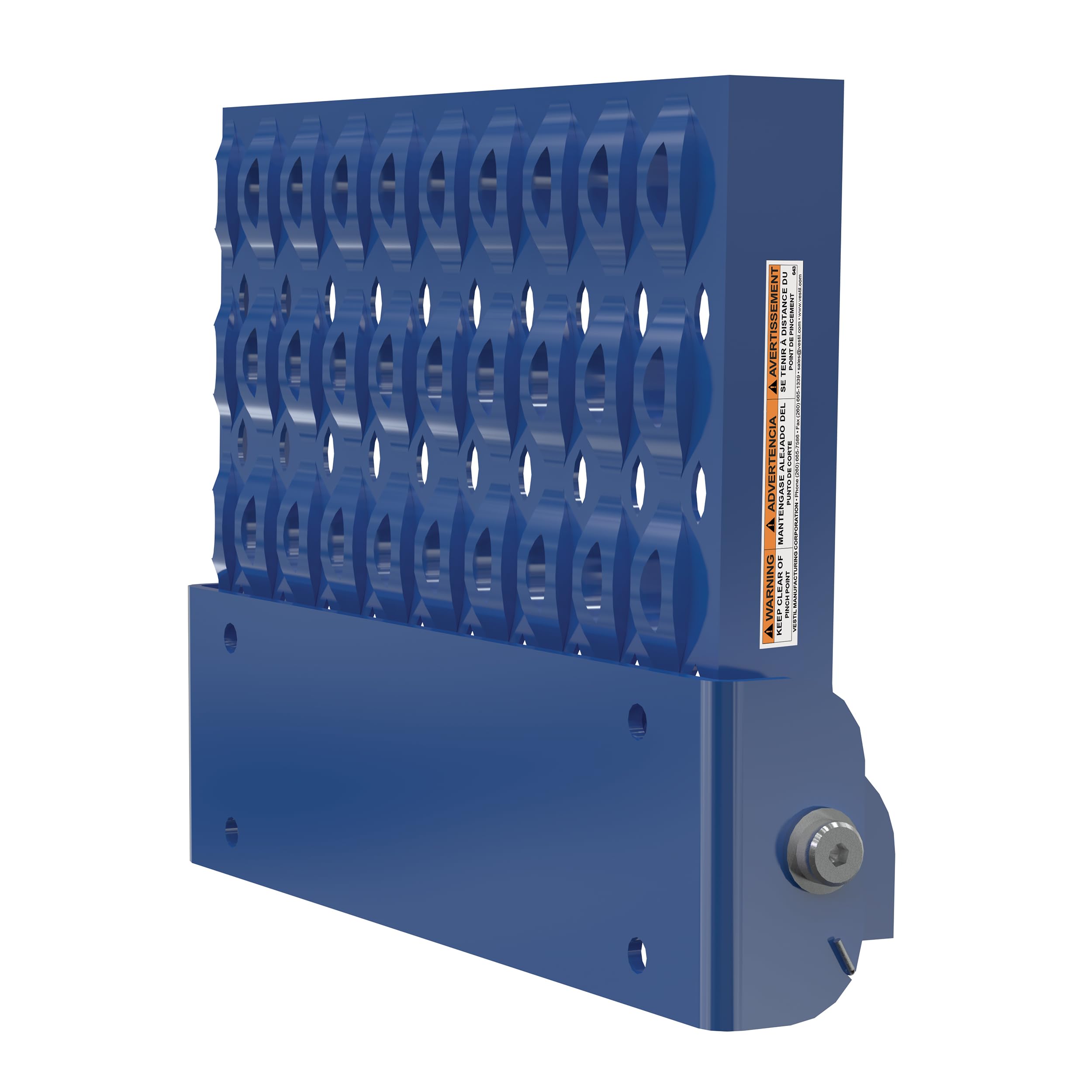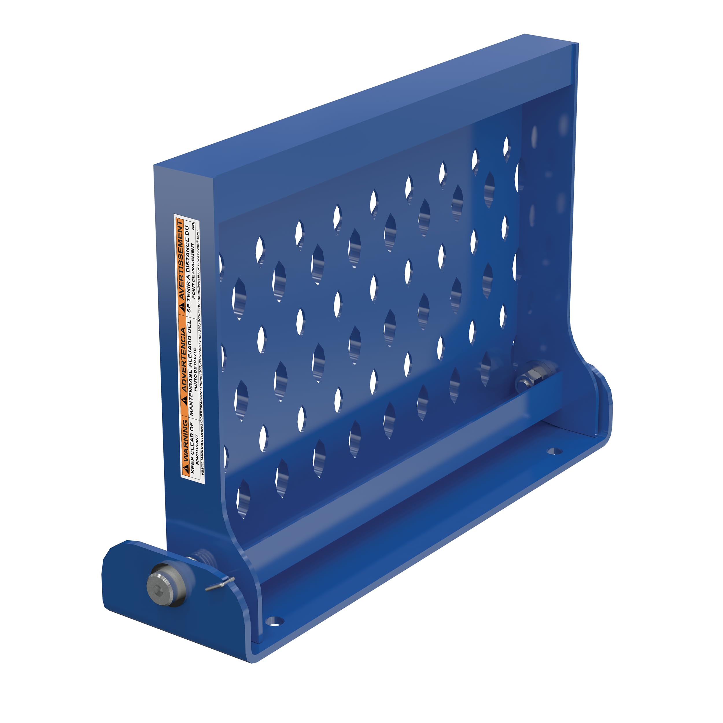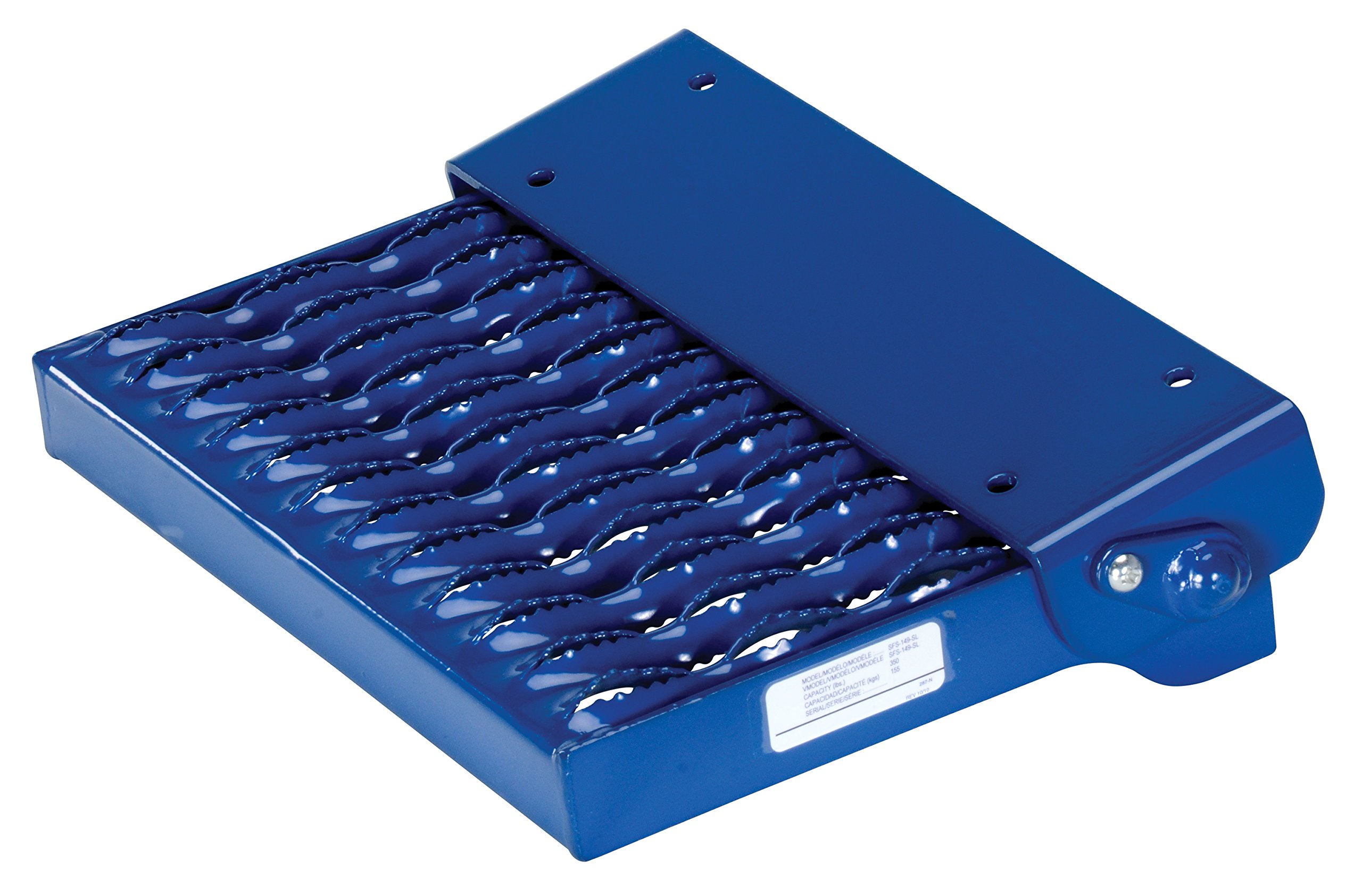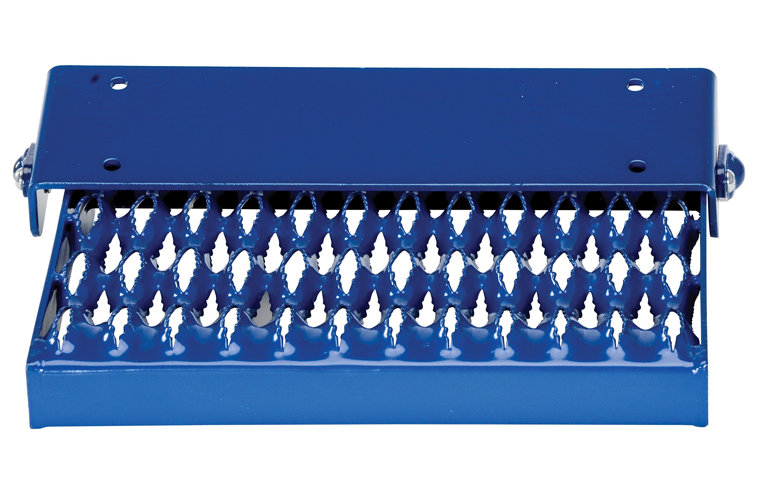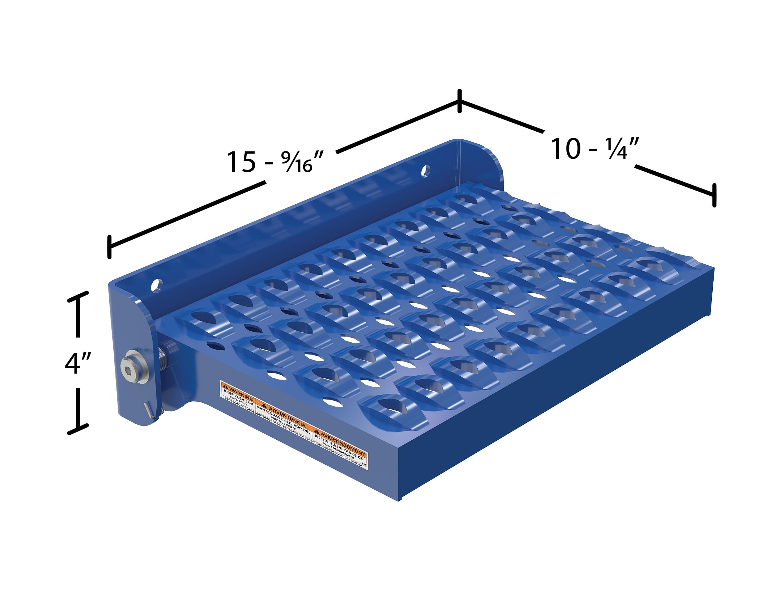 Easily rotate step to vertical position when not in use. Step is steel with powder coat blue finish and has a serrated surface for traction. Two 7/16" diameter mounting holes included. Fasteners are not included. Available in spring loaded design. Powder coated blue finish. Fold up step measures 14" width by 9" depth.