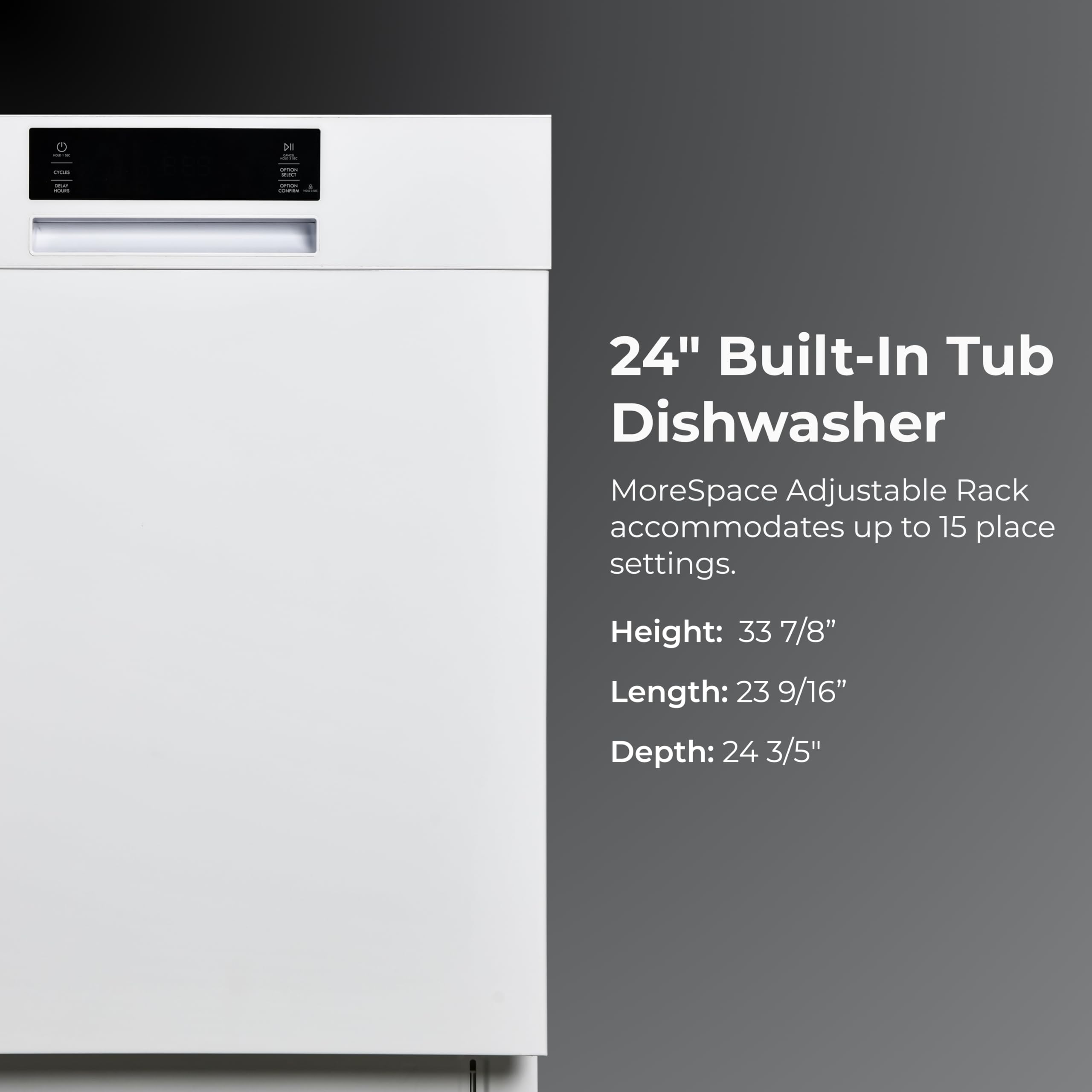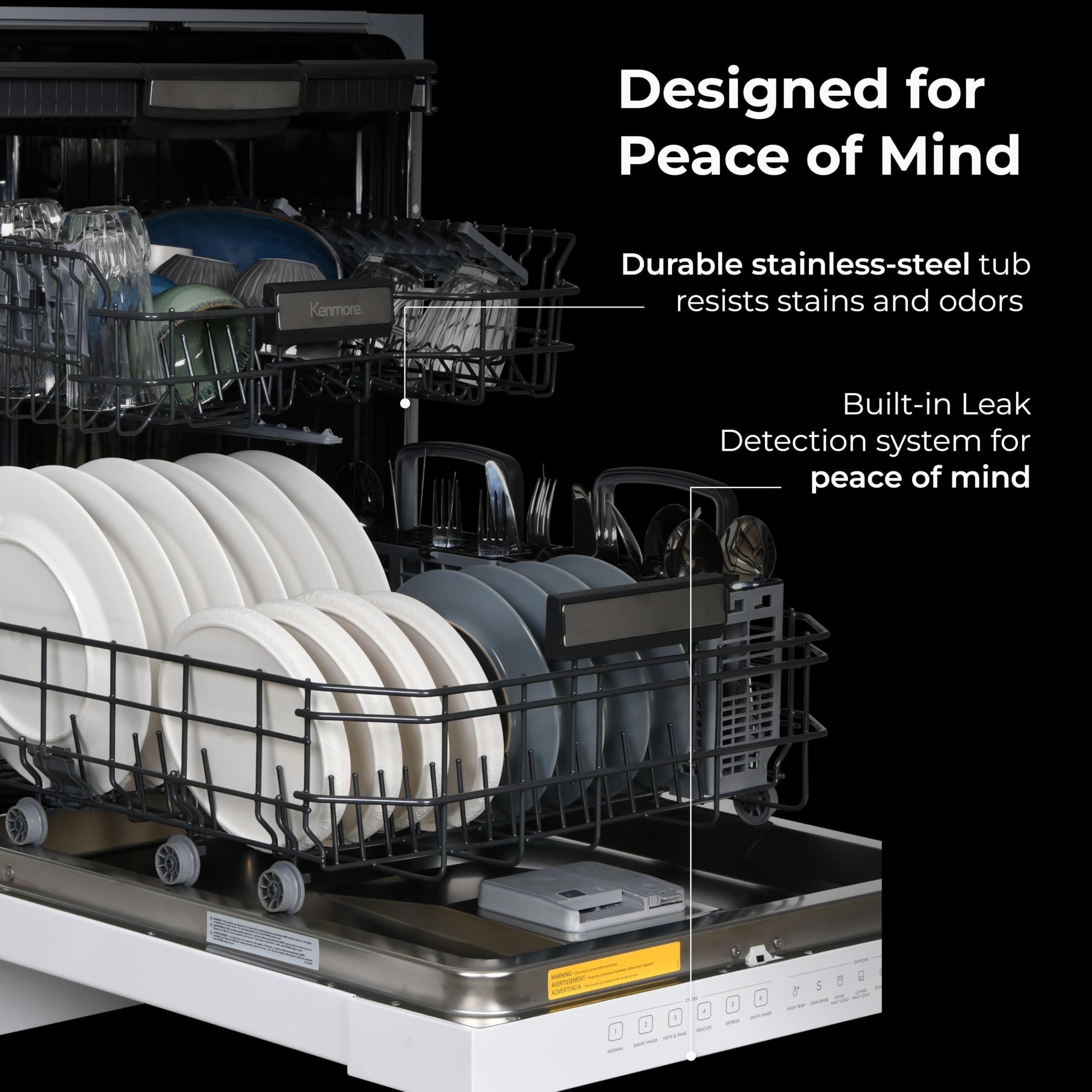 The Kenmore 24" Built-In Dishwasher delivers powerful, efficient cleaning with whisper-quiet performance. UltraWash Plus blasts away stuck-on food with pressurized spray arms and filtered water, while the SmartWash cycle adjusts to soil level for the best clean. TurboDry uses a built-in fan and heating element to ensure every dish comes out dry - no towel needed. The EasyFlex Third Rack adds 35% more space for cooking tools, and the MoreSpace Adjustable Rack lifts or lowers to fit large or awkward items. With space for 15 place settings, running at 45 dBA with a Quiet Wash option, and Delay Start flexibility, it’s built for everyday life. ENERGY STAR Certified and equipped with Leak Detection for added peace of mind.