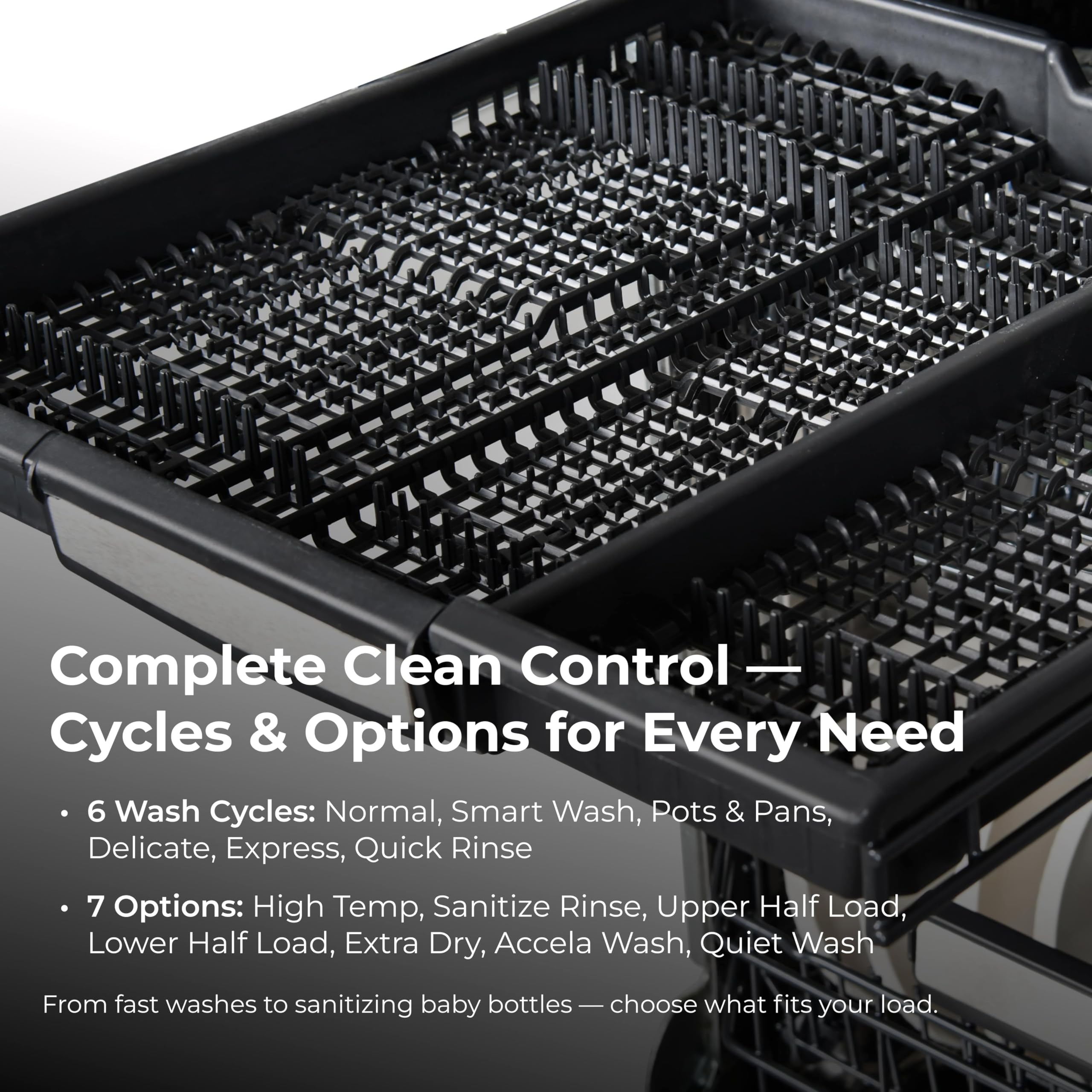 UltraWash Plus Power Cleaning: 3 pressurized spray arms clean dishes from every angle using fresh, filtered water. Accela Wash cleans fast when you're in a hurry. Sani Rinse option gets dishes seriously clean