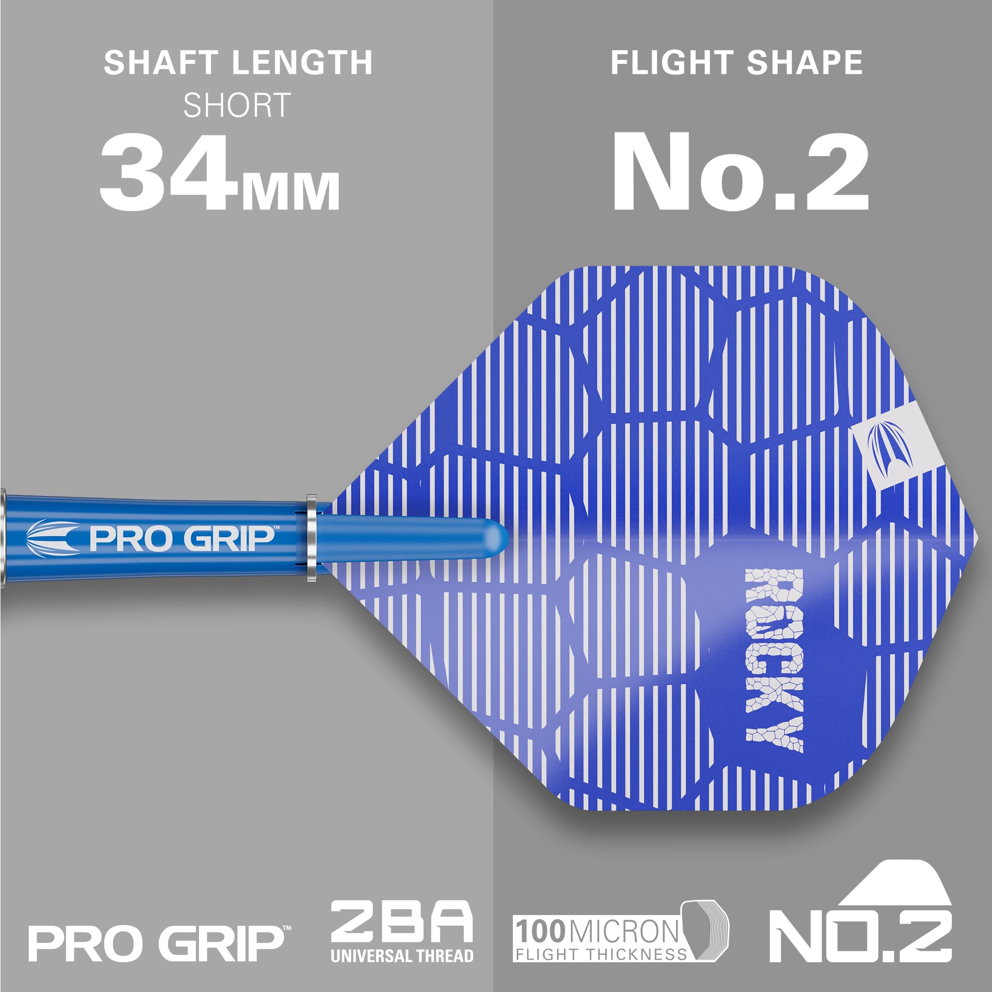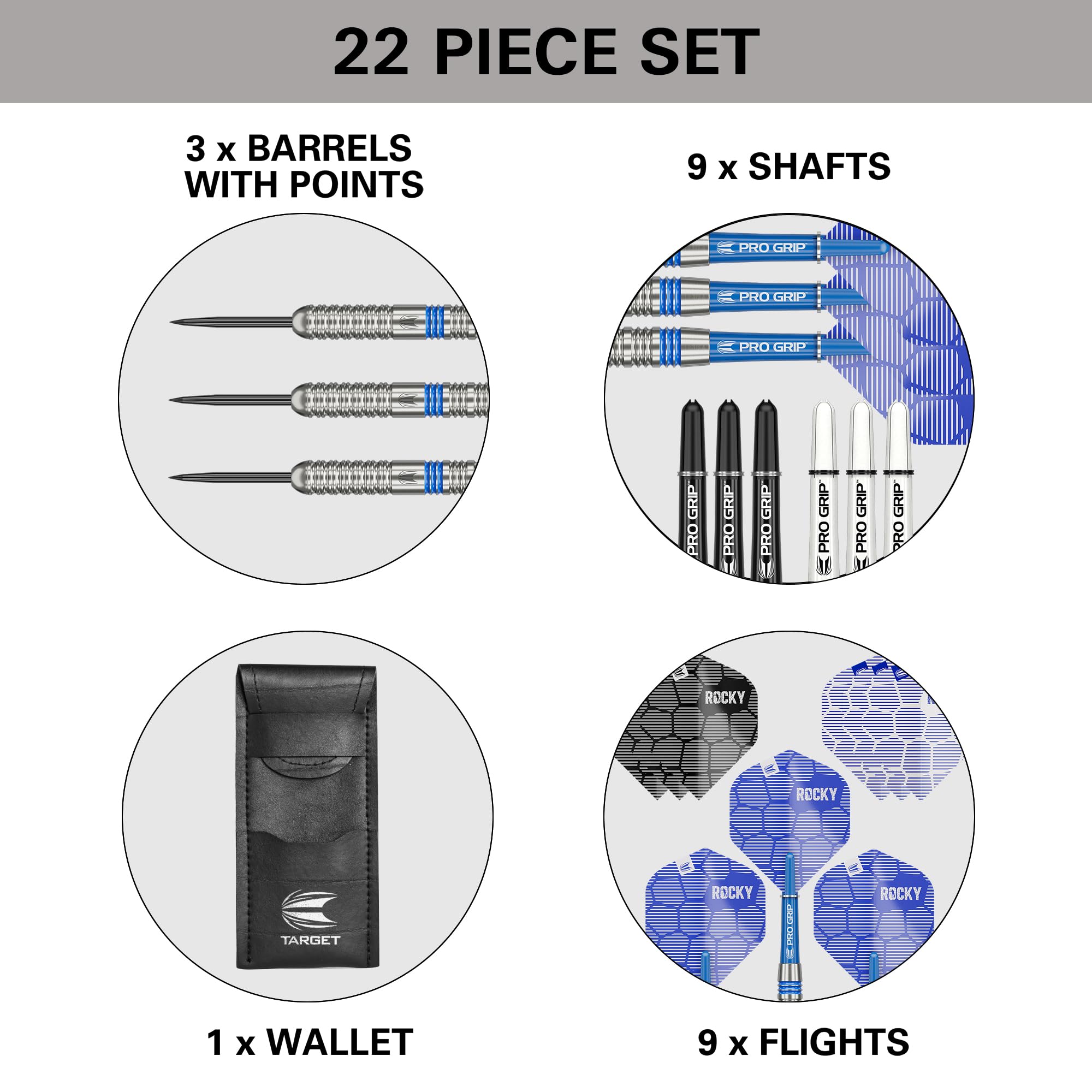 PACK CONTAINS: 3x 80% Tungsten Dart Barrels with fixed black Nickel points (26mm), 9x Pro Grip Shafts (Short, 34mm) – White, Black, and Blue, 9x No.2 Pro Ultra Flights – White, Black, and Blue, and 1x Bar Wallet, and a 1 Month DartCounter App Subscription.