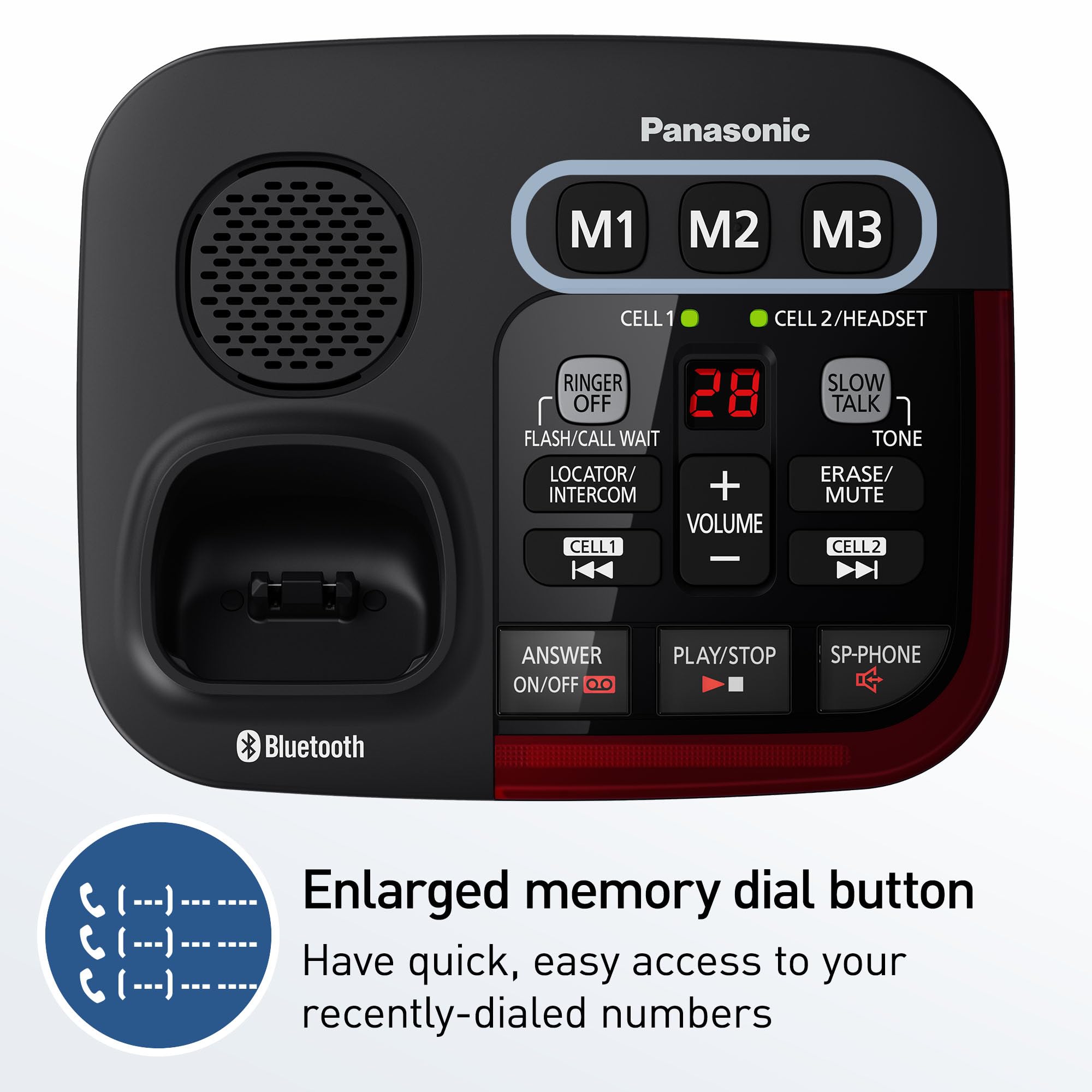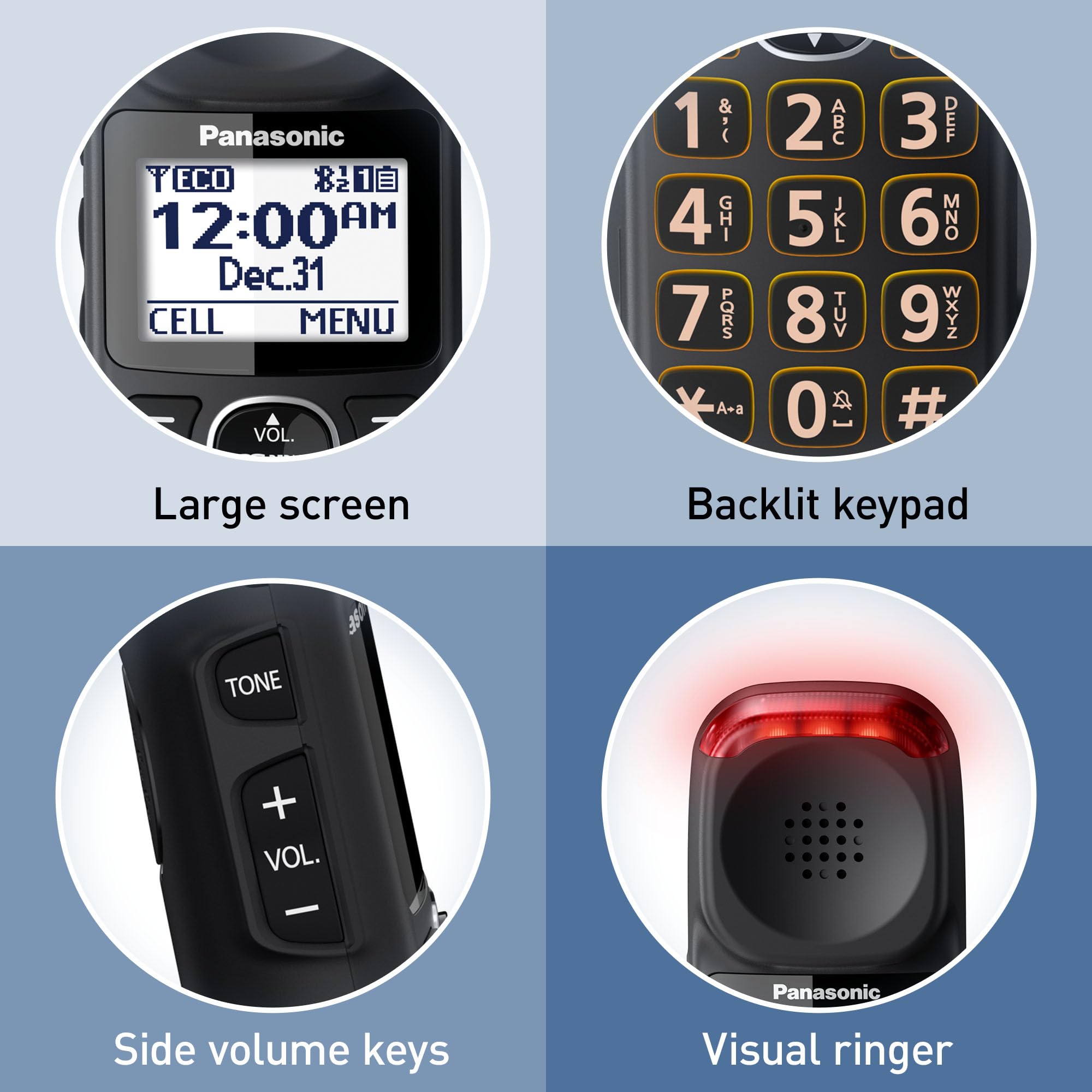 Clearly See Who's Calling: A large, bright white backlit LCD display screen of 1.8" (4.4 cm) that displays caller information, with enlarged memory dial buttons; bright red LED visual ringers on base unit and handset make sure you always see when the phone is ringing