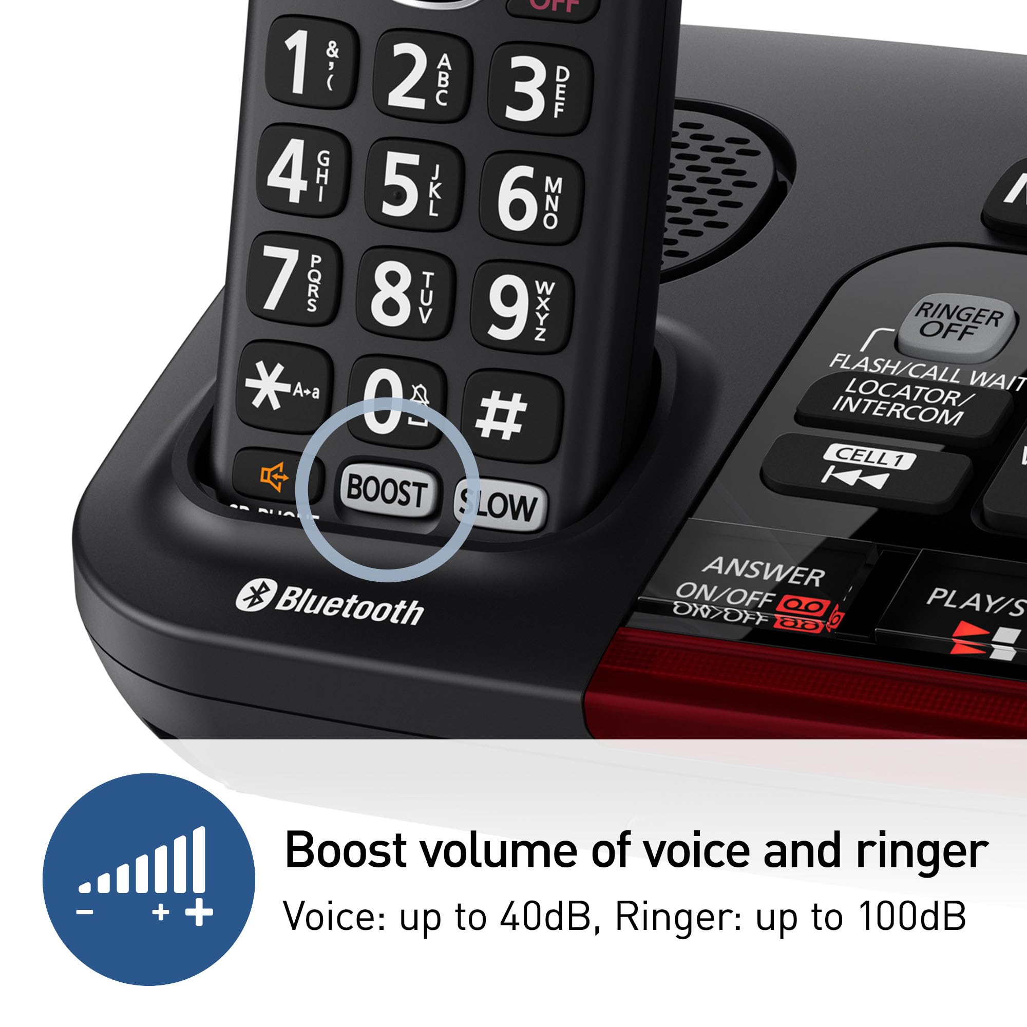 Hear and Be Heard, Loud and Clear: Boost the volume of the call (up to 40 dB); includes six voice Tone Settings and a loud base unit ringer (up to 100 dB)