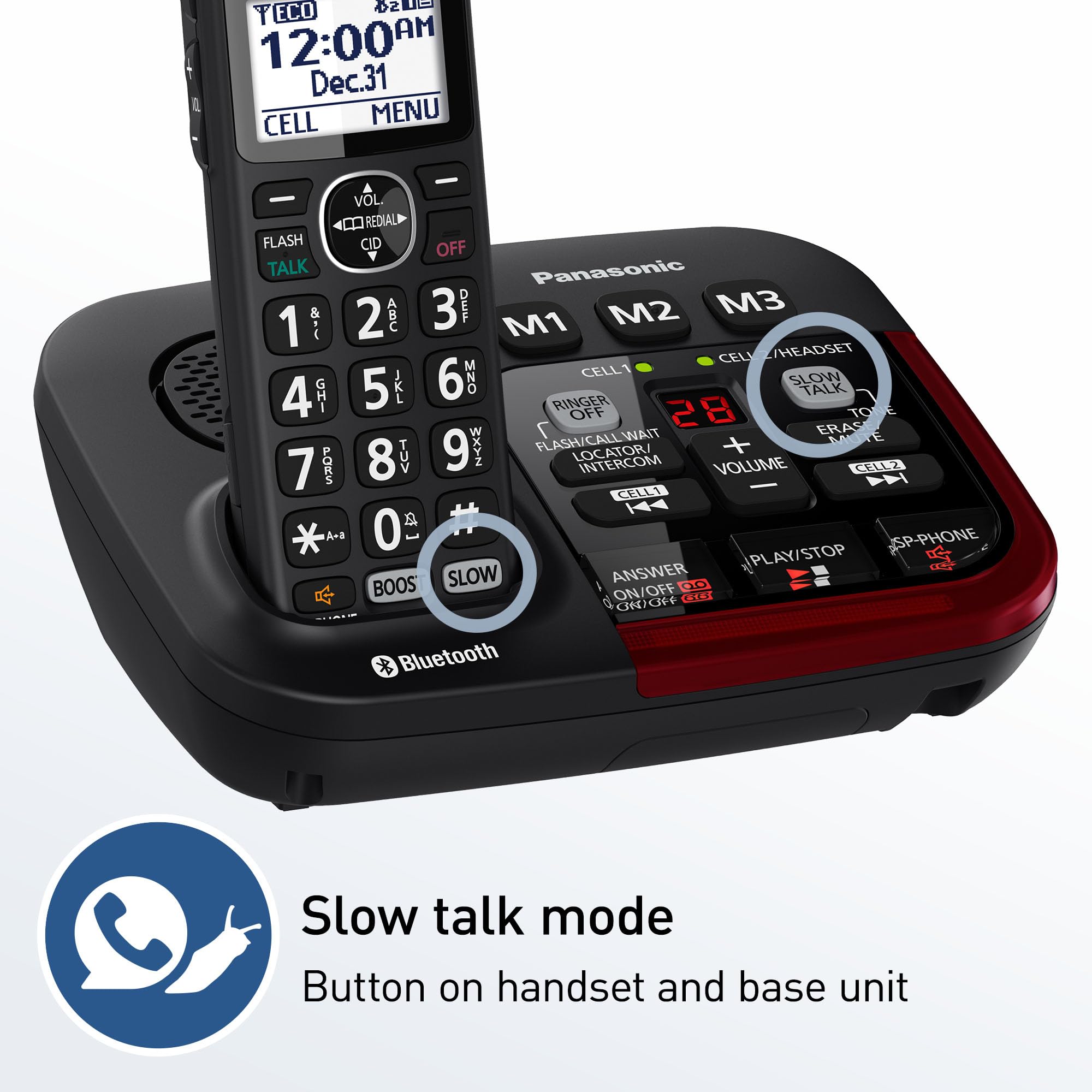 Features Tailored to Voice Assistance: Speakerphone, Talking Caller ID, Noise Reduction, Talking Keypad, 3000-item Phonebook, and Intercom; 9 Speed Dials and 250-number Call Block; expandable to 6 handsets; includes accessories, and power backup