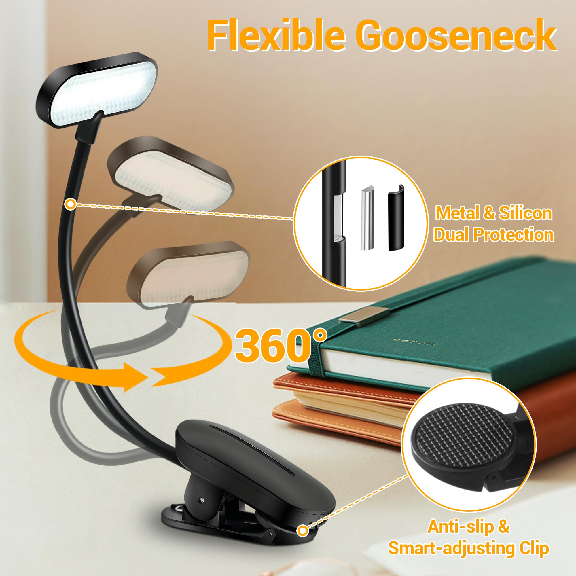 【3 Color Modes & Stepless Dimming】The reading light experience with 3 color modes and smooth 10%-100% dimmable brightness.The clip on book light securely fastens to books, serving as ideal book light for reading in bed with shadow-free light that won’t disturb sleeping partners