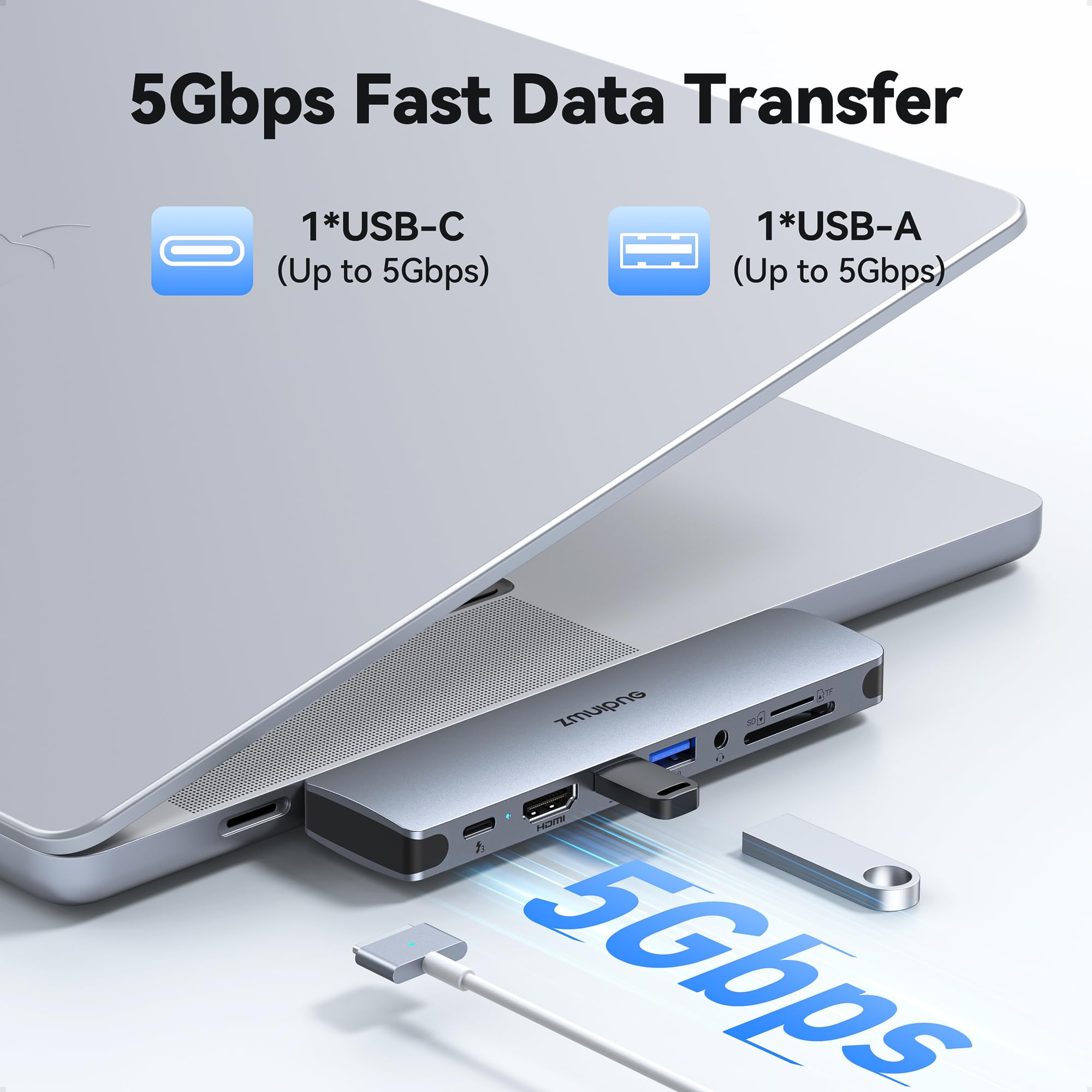 【Dual SuperSpeed USB 3.0&USB 2.0 Ports】This MacBook pro usb adapter comes with two usb 3.0 ports which transfer speed can up to 5Gbps, usb 2.0 port up to 480Mbps, your can connect usb keyboard, mouse, usb driver, usb hard disks to your laptop easily via this macbook air adapter. Notice: this is macbook pro dongle only allow connect 1 HDD/SSD at the same time, and this macbook usb c adapter is not compatible with Logitech's mouse and keyboard.
