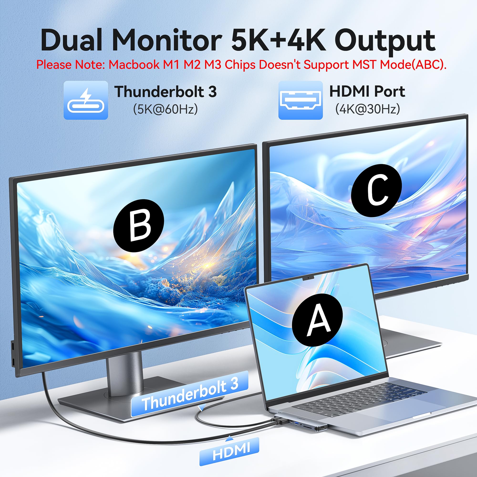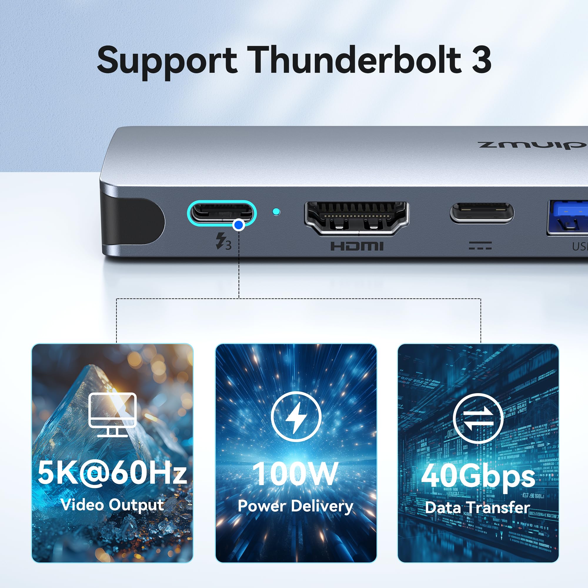 【Dual USB C Female Port】The first usb c port is a original thunderbolt 3 port like the macbook itself which support data transfer up to 40Gb/s, up to 5K display and up to 100W power; Another usbc port is a data transfer port which speed can up to 5Gbps, a best port for USB C Device like ssd hdd,etc. Notice: The second usb c port of this usb c hub doesn't support HDMI output and charging function.