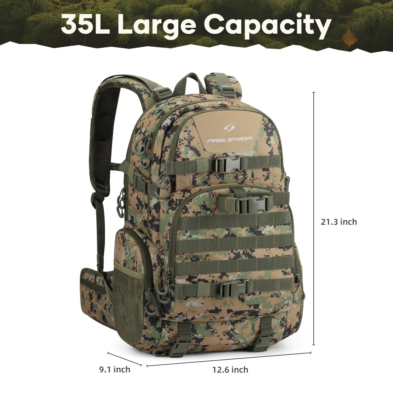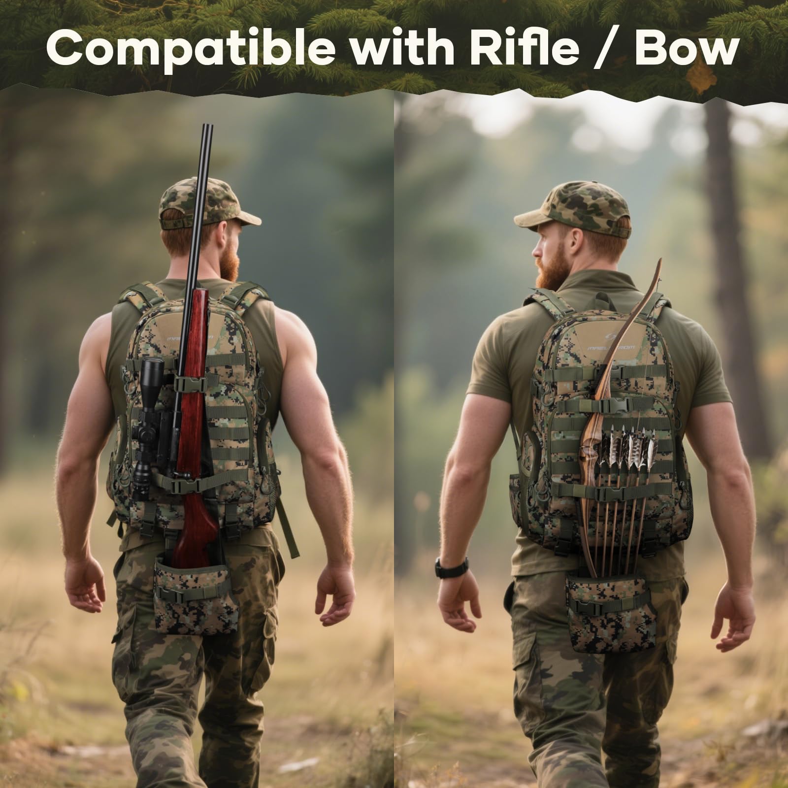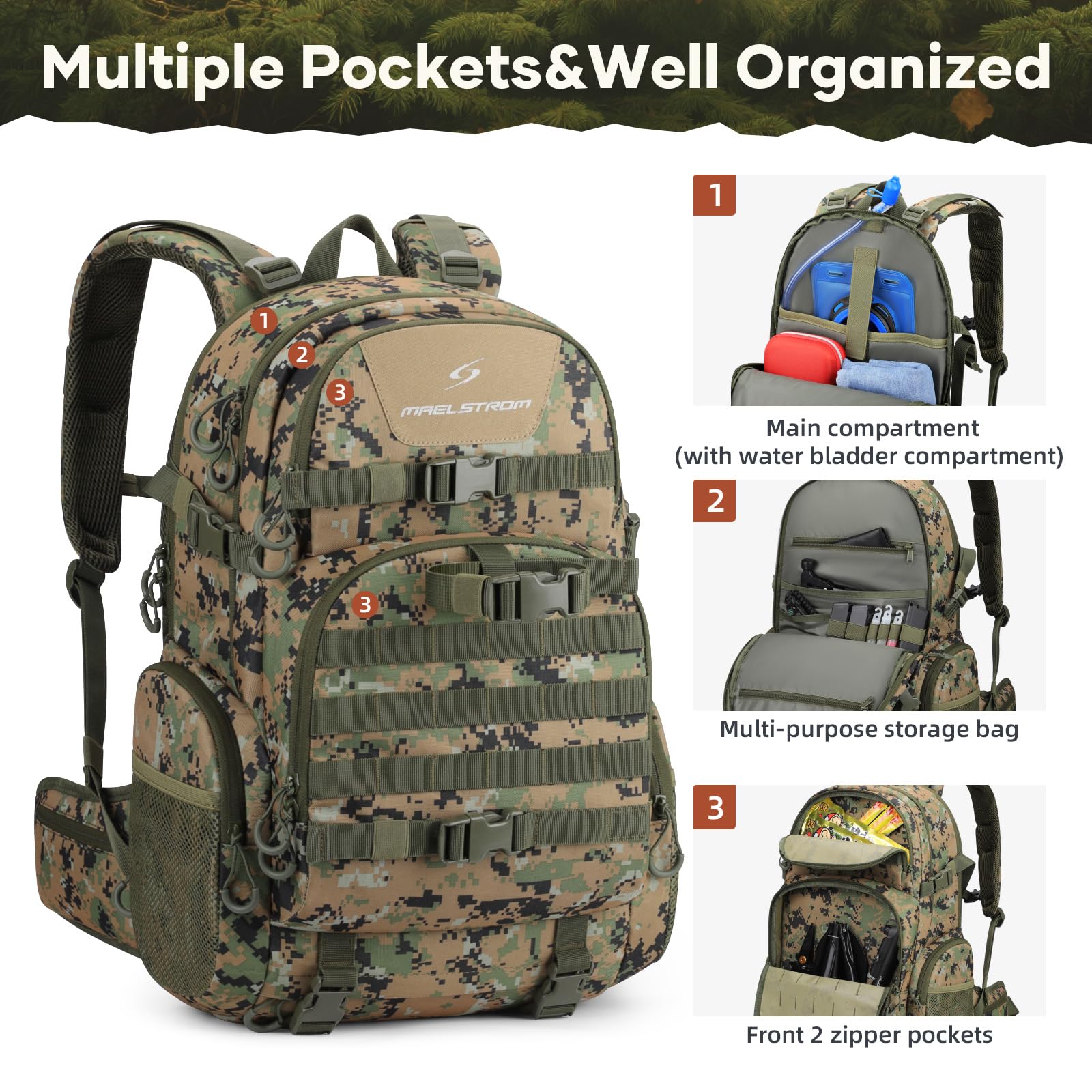 Durable & Stealthy Design: Made with 900D reinforced polyester, Maelstrom hunting backpack is rugged, quick-dry, and abrasion-resistant. Tactical backpack camo pattern ensures optimal concealment during hunts.