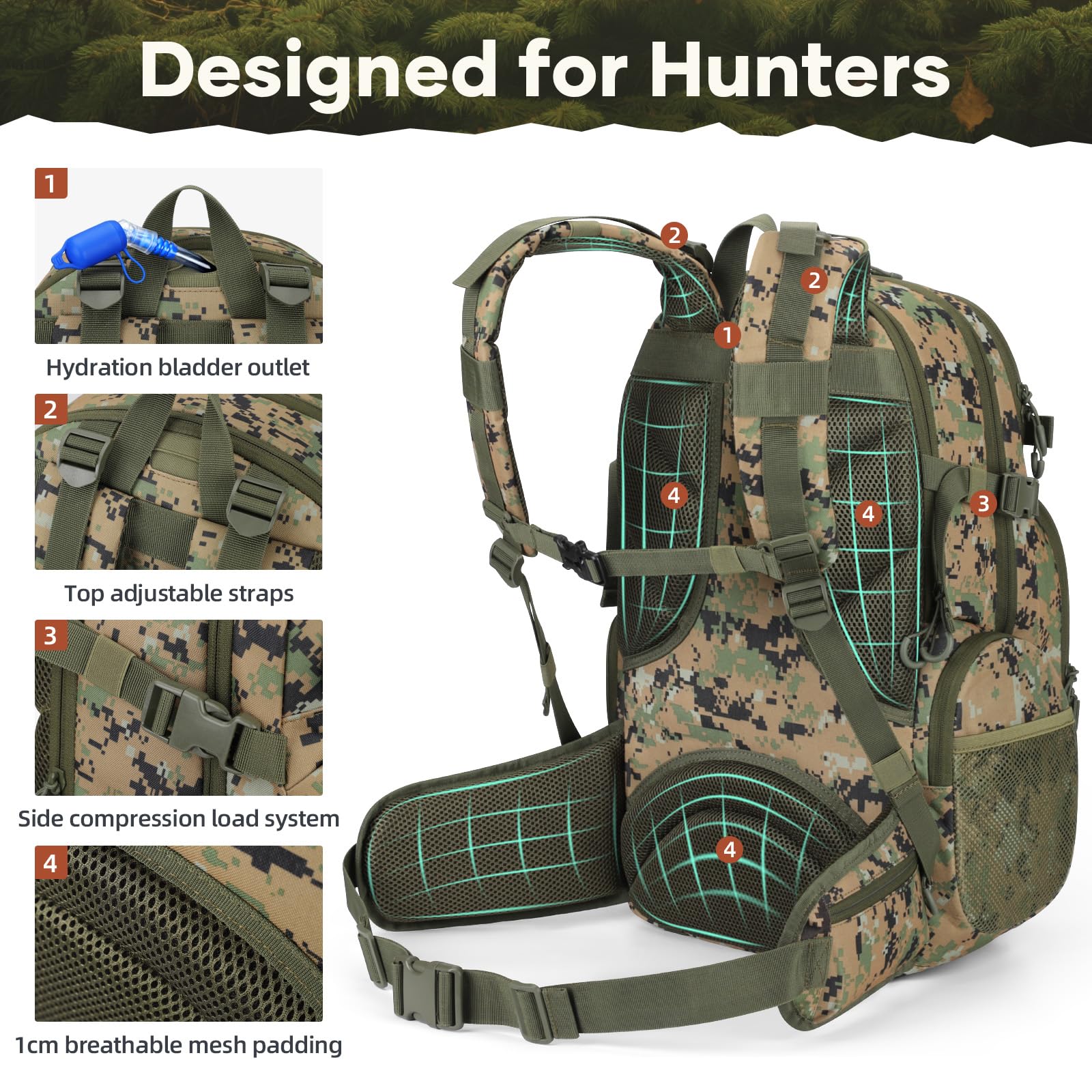 Versatile Outdoor Companion: This tactical backpack for hunting has top hydration port for water bladder. Hunting pack rugged construction of the camouflage backpack is ideal for hunting, hiking, and survival adventures.