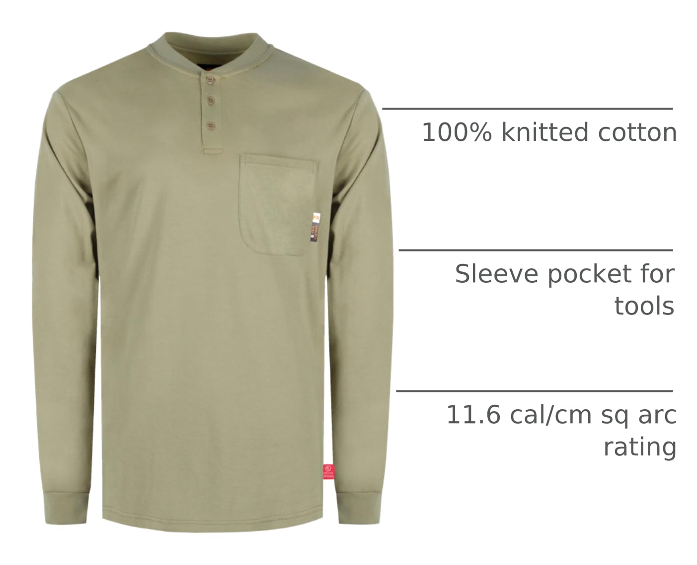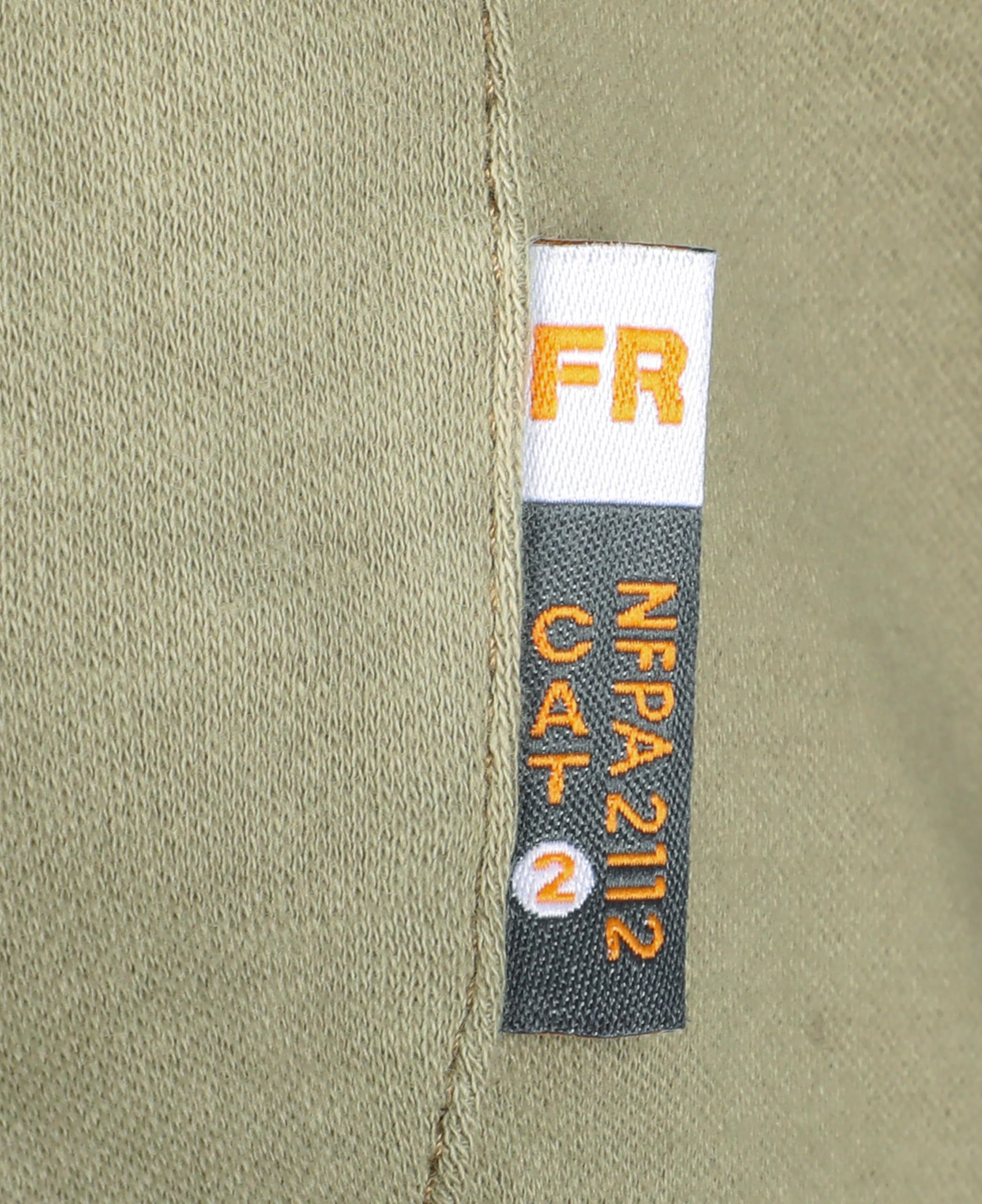 FR PERFORMENCE:Flame Resistant,100% Knitted Cotton,Mid-weight Fabric.Fabric weight is 7.1 oz/sq yd.The fabric complies with ASTM F1506 for Arc Flash protection and NFPA 2112 (ASTM F1930) for Flash Fire protection.The minimum Arc Flash rating(ATPV) is 11.6cal/cm sq and it meets the HRC 2 rating.The garment is complaint with NFPA 2112/HRC 2 and is UL Certified.