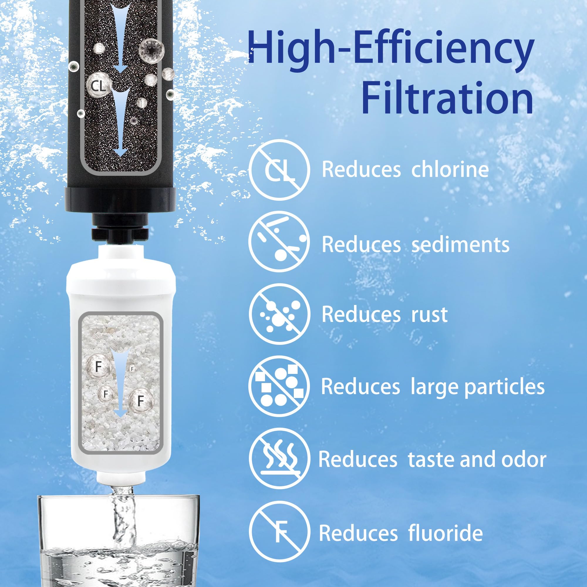 【High-Efficiency Purification】: Renami Black carbon filters are made of Coconut Shell Activated Carbon, and the upgraded White fluoride filters use a natural mineral synthesis material Carbonate Apatite as the filter medium. Efficient absorption of 99% residual chlorine and fluoride, effective filtration of various impurities, such as sand, rust, sediment, bad taste.