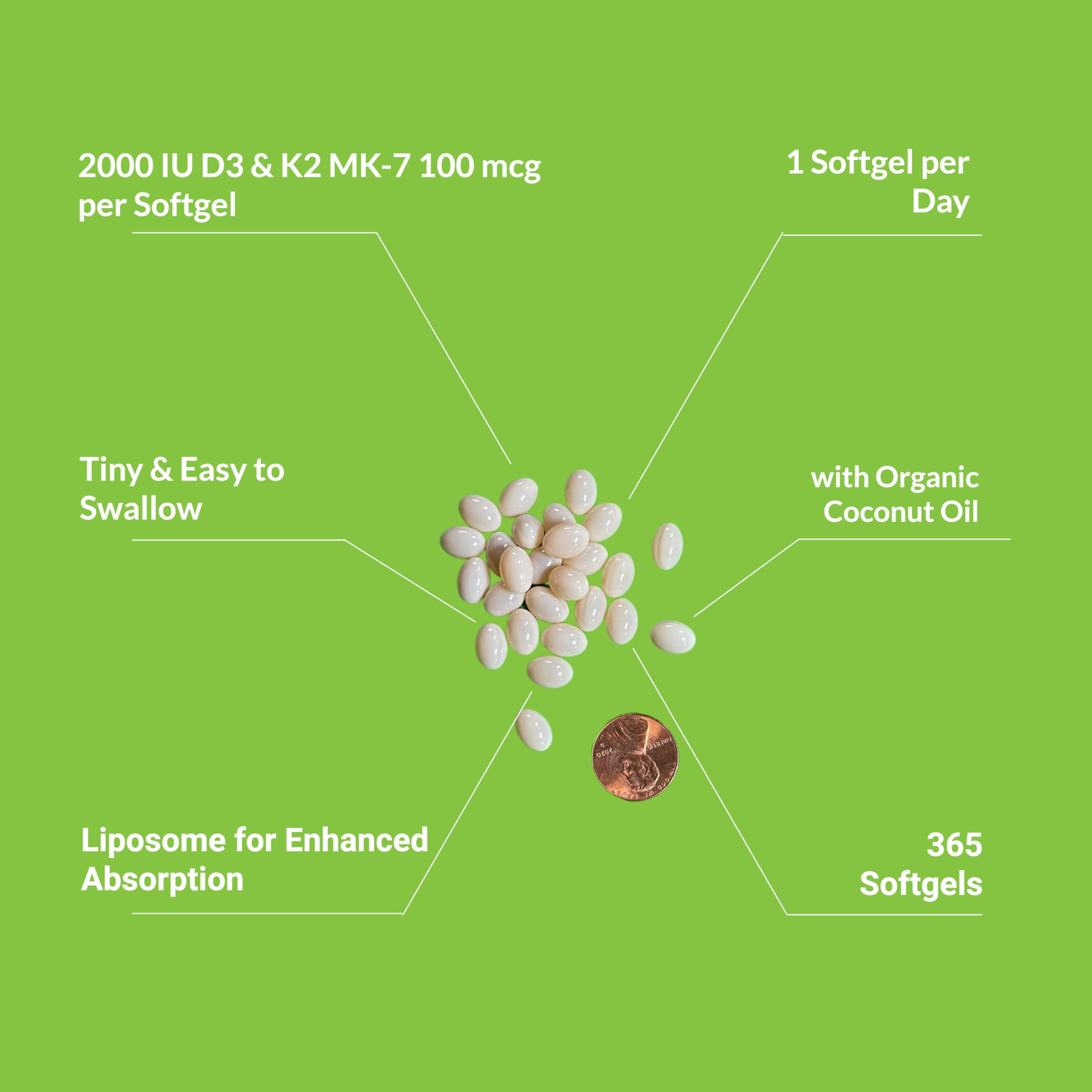 UpNourish Liposomal Vitamin D3 K2 2000 IU with K2 MK-7 100 mcg - 365 Vitamin D3 k2 (Vitamina D3 con K2) Mini Softgels with Organic Coconut Oil - Easy to Swallow K2 D3 Vitamin Supplement