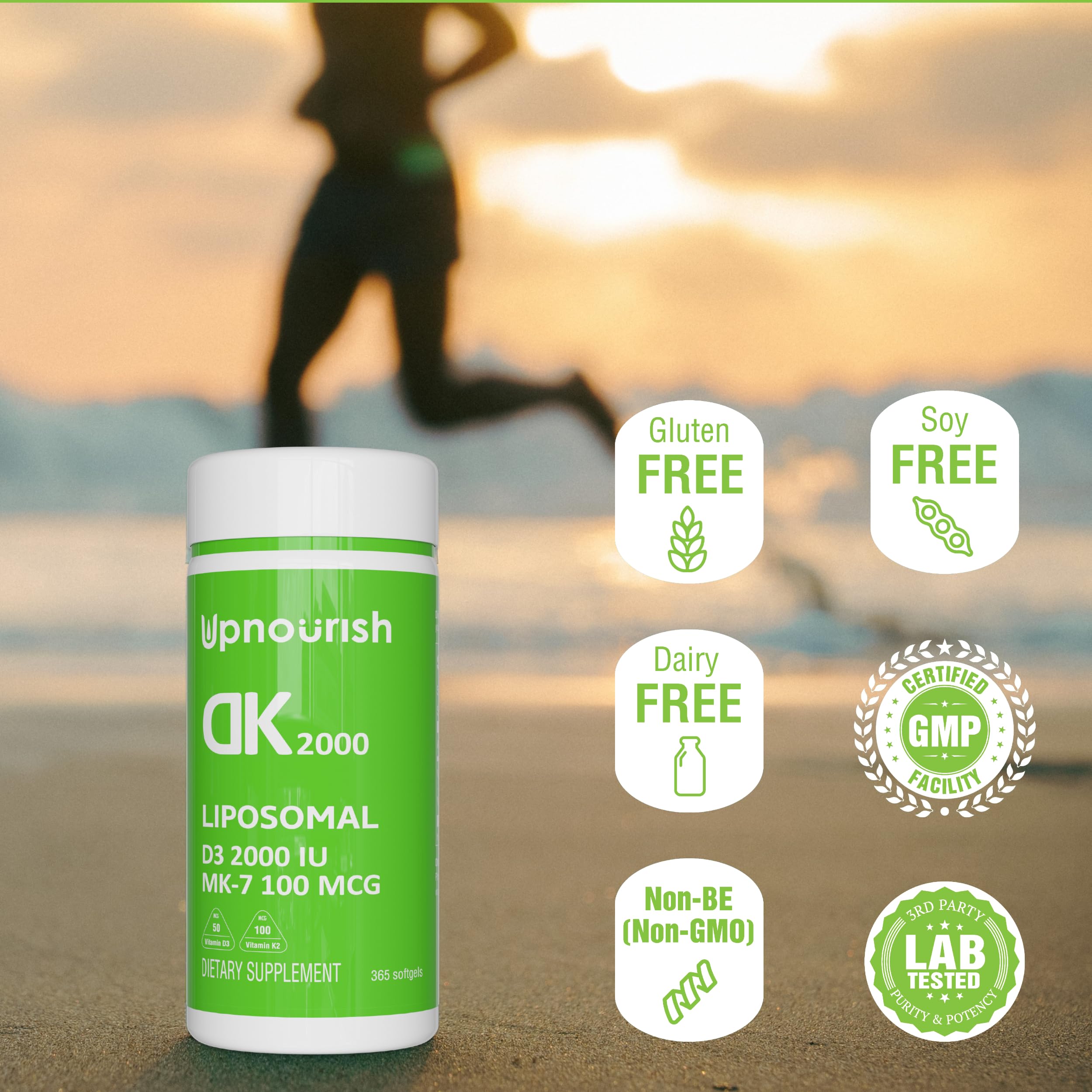 Vitamin D 2000IU K2 100 mcg: D3 and K2 are essential vitamins for the body. One UpNourish Liposomal vitamin D3 2000 IU softgel is packed with 2000IU vitamin D3 cholecalciferol and 100mcg vitamin K2 as MK-7.