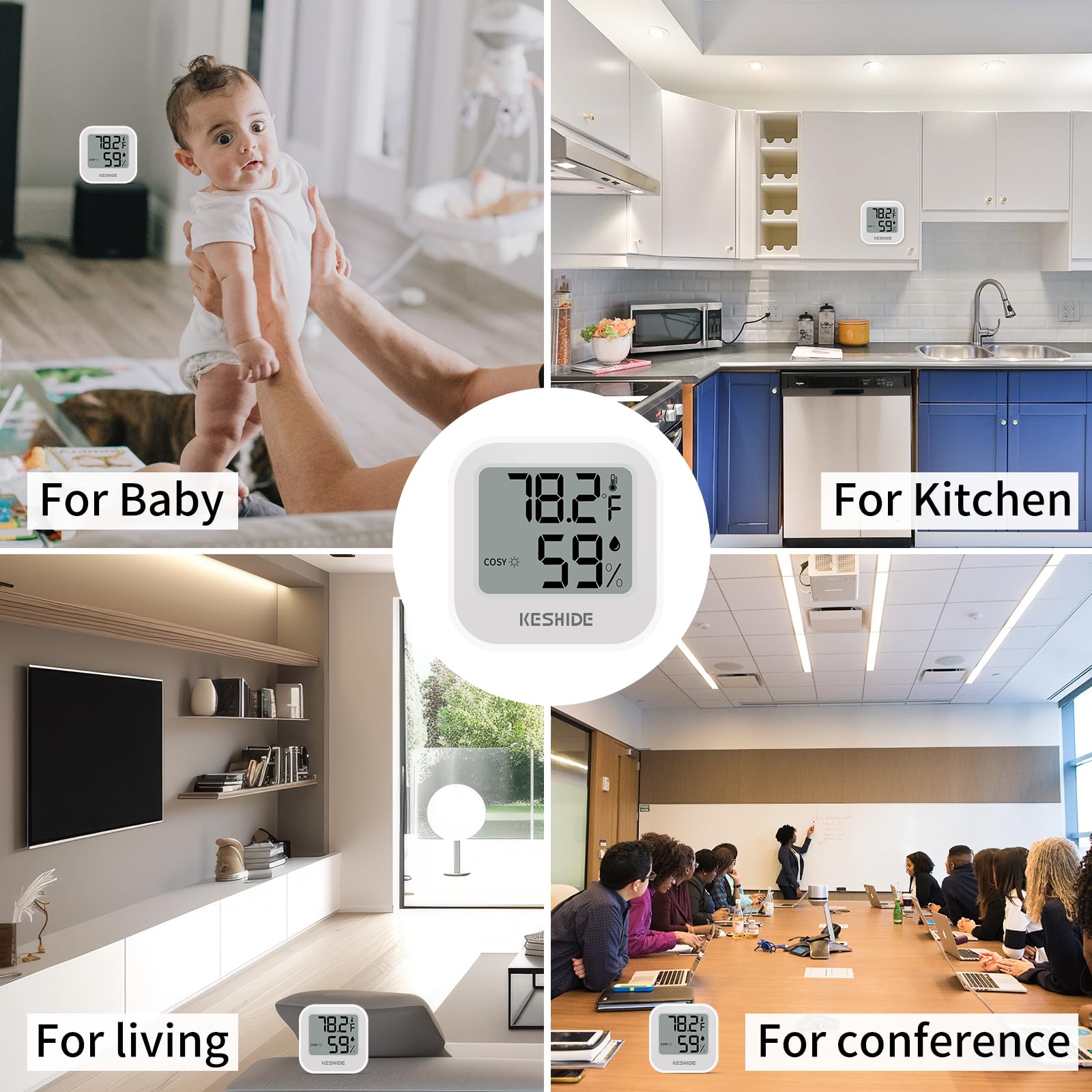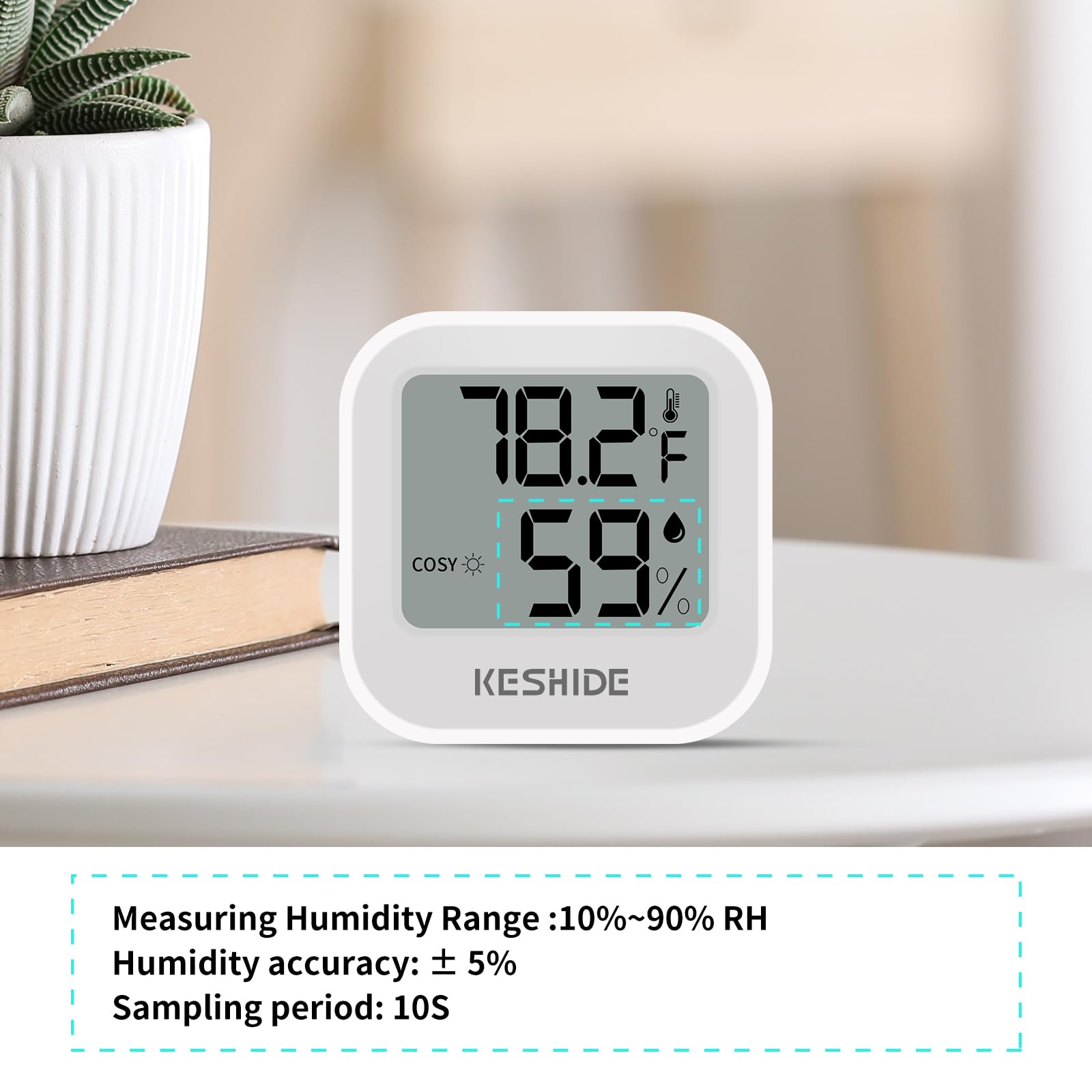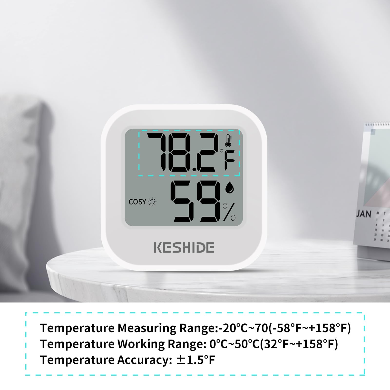 [Air Comfort Indicator]: KESHIDE humidity meter features 3 different face icons to indicate DRY/COMFORT/WET air condition. Remind you to adjust your humidifier or dehumidifier accordingly and help you will always live in the most comfortable environment