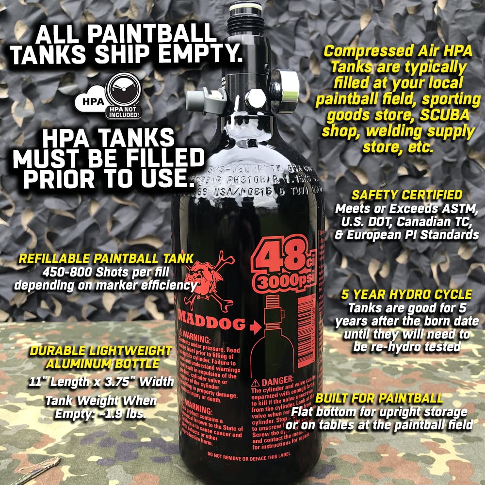 BUILT FOR PAINTBALL, AIRSOFT, AIRGUNS, PCP RIFLES, ETC! Maddog 5 Year 48ci 3000psi Compressed Air HPA Paintball Tank is Perfect for your Paintball Gun Marker, Airsoft, Airgun, PCP Rifle, etc! Enhanced accuracy, more consistent velocity, and higher performance in all weather conditions over CO2! All Compressed Air HPA Tanks are Shipped EMPTY and must be filled prior to use.