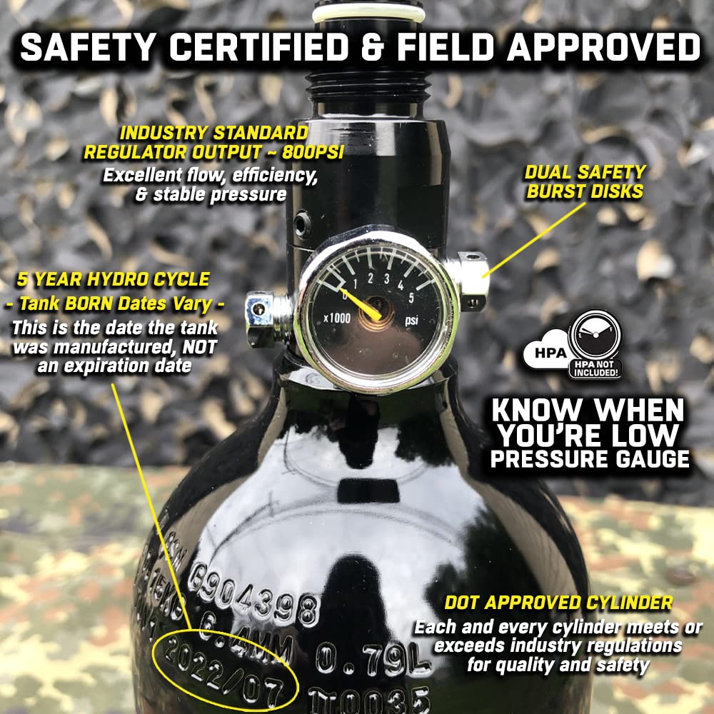 All Compressed Air HPA tanks are shipped EMPTY to comply with Department of Transportation laws. Tanks Must Be Filled Prior to Use. | Designed w/ Safety as a top Priority!