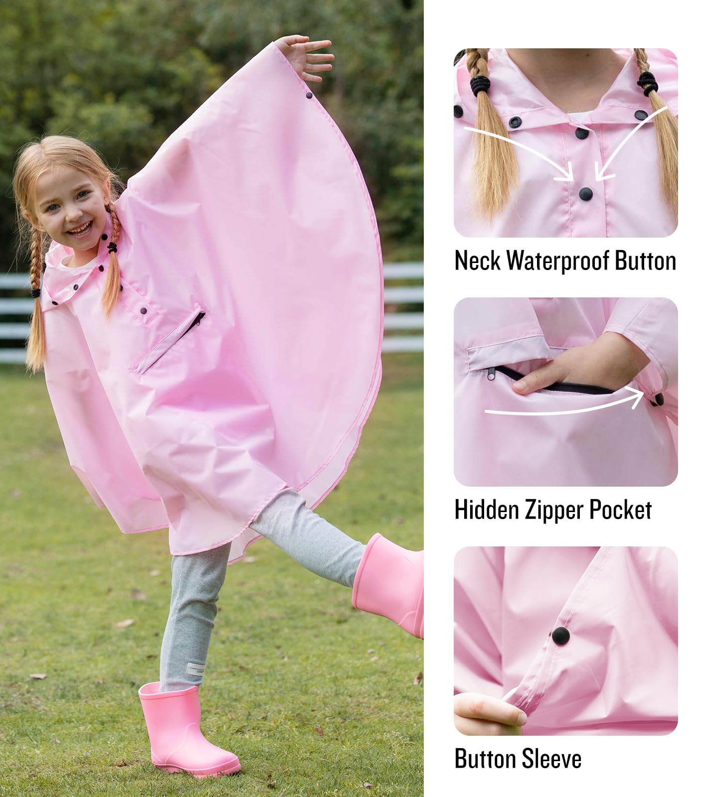 [Design]: Full rain poncho cover, with snaps on hood / Zippered front pocket, for daily necessities items / Various colors and cartoon patterns, bring joy to kids