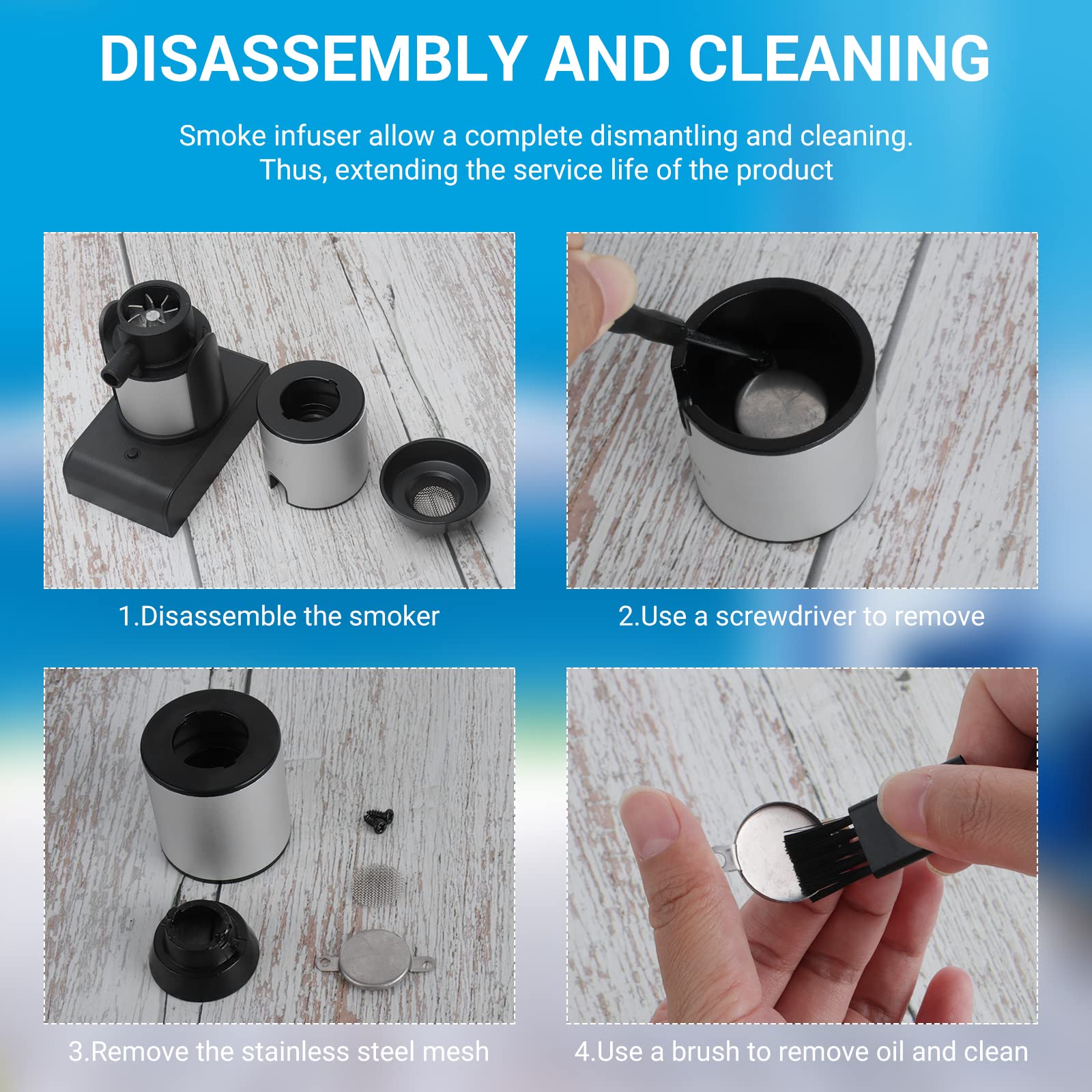 How to Maintain the Smoker Gun : To preserve its durability and life, please frequently empty the burn chamber of the portable smoking gun, wipe with a damp rag and dry it properly. We provide 30-day money back and 1 year free warranty for the smoking gun