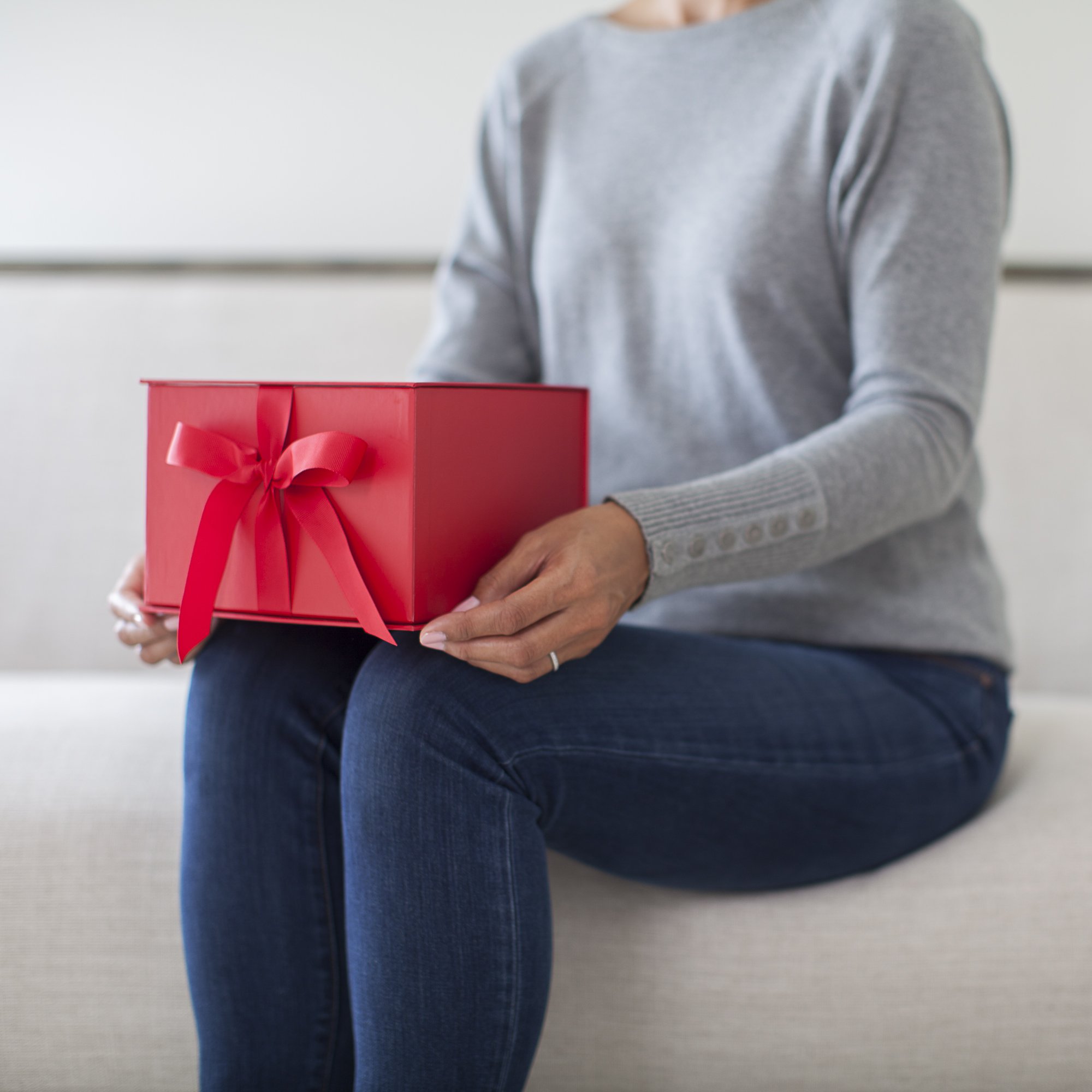 SIMPLE DESIGN: Impress any gift recipient with this solid red gift box, complete with a matching ribbon to tie the box closed and red shredded paper on the inside.
