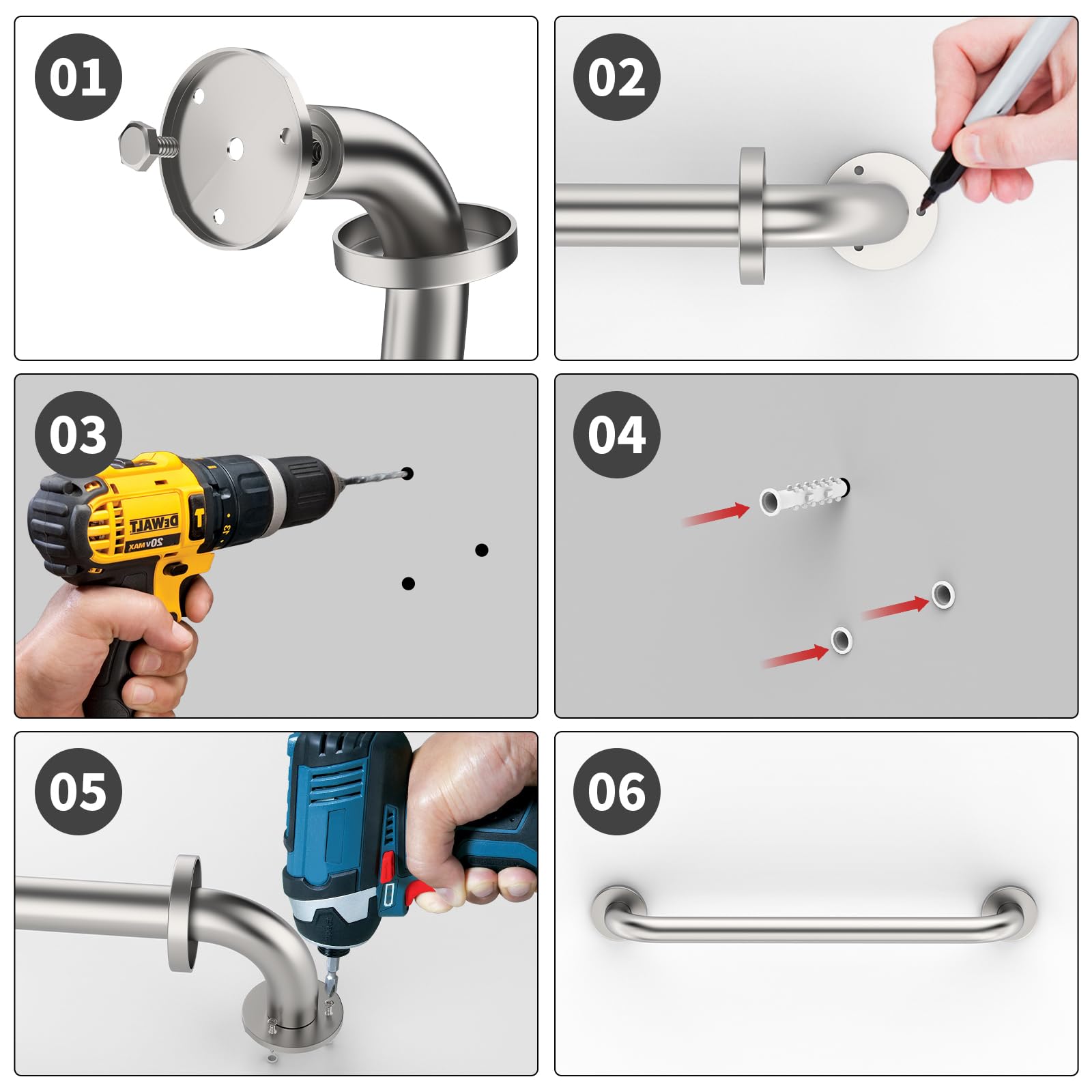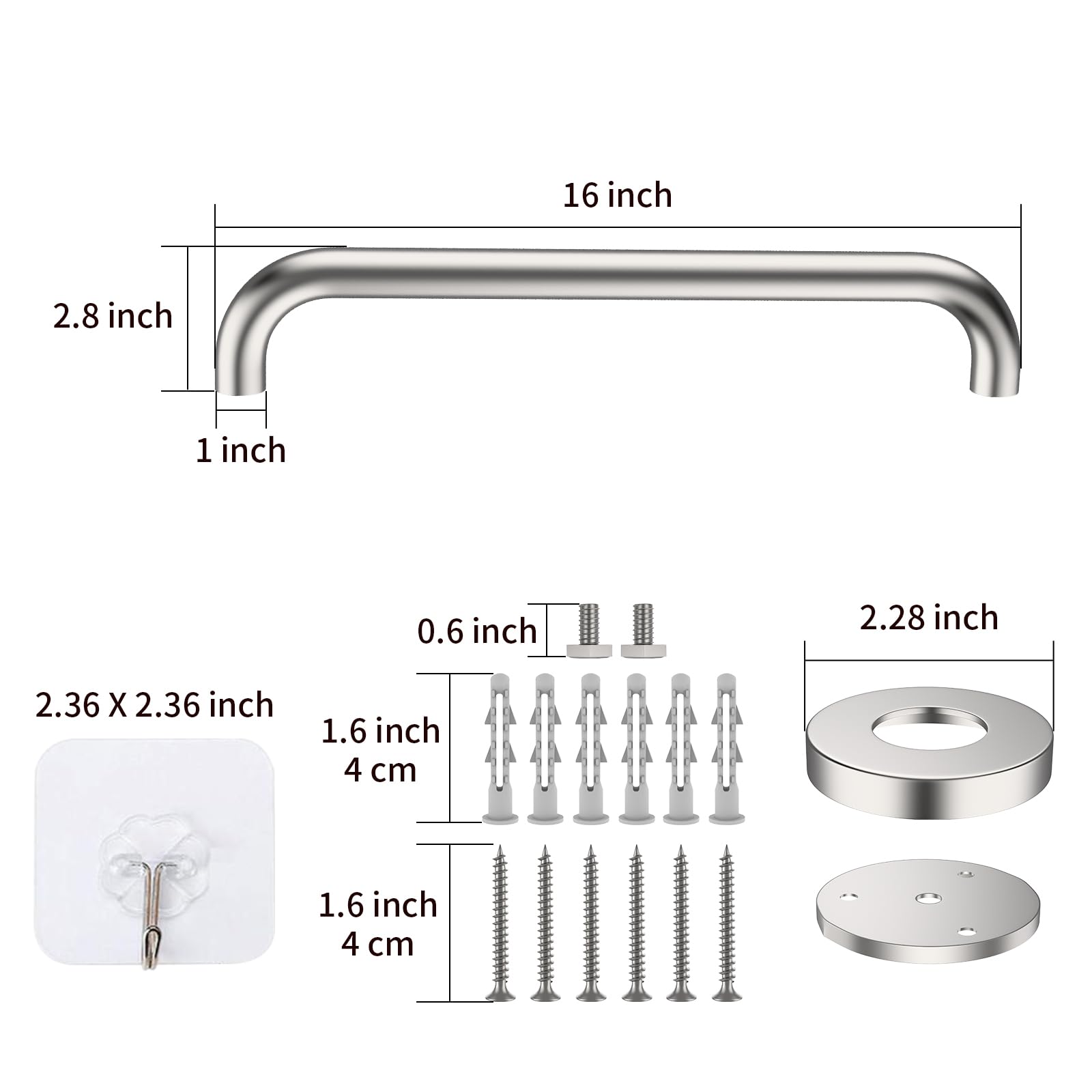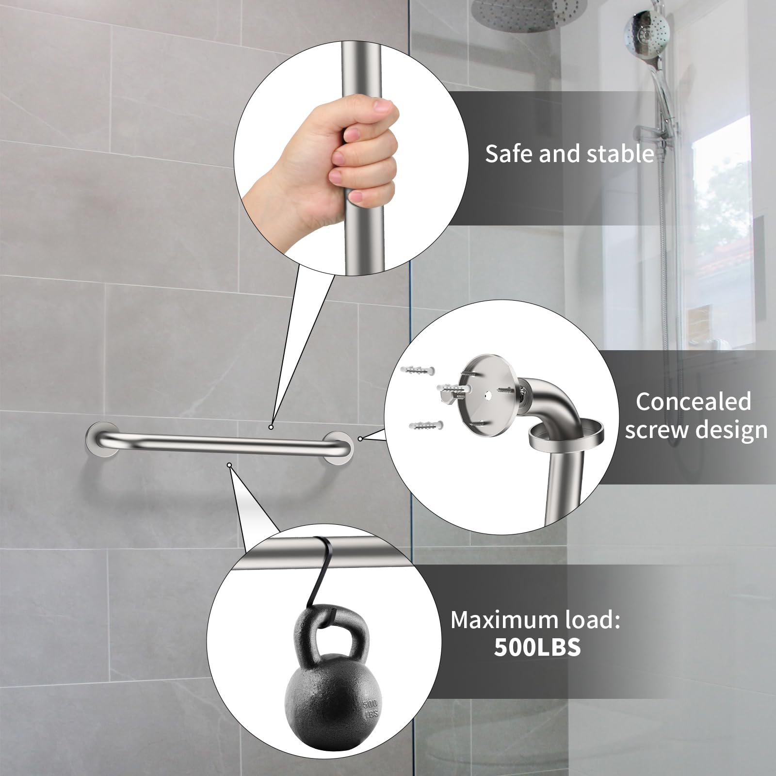 ZUEXT 16 inch Satin Brushed Nickel Finished Bathroom Grab Bars are able to support up to 500 lbs of pull force to provide a stable, reliable handhold; Screw Length 1.6 inch/ 4.0cm. Made of anti-rust stainless steel for a lasting strength and quality.