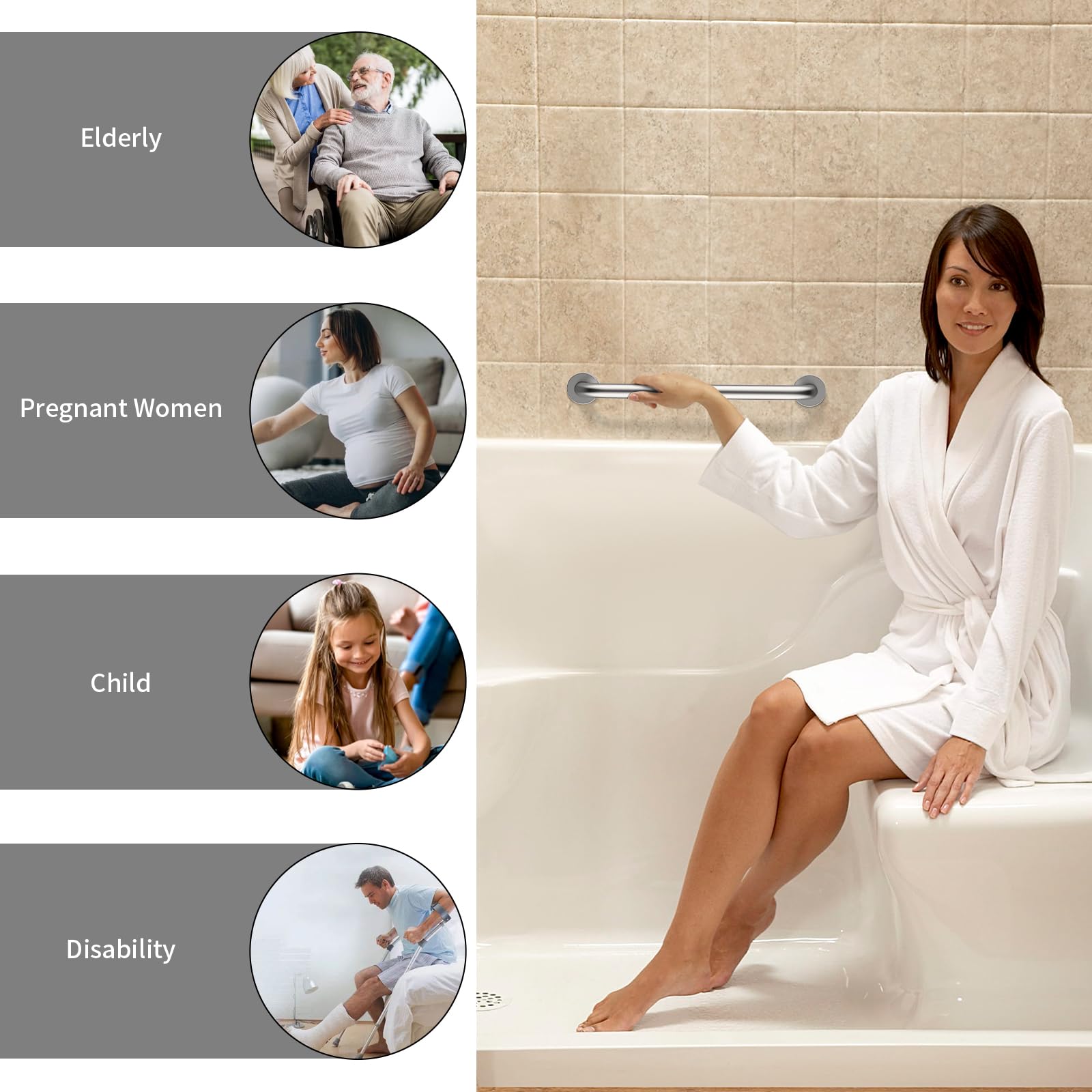 Use ZUEXT 16 inch satin brushed nickel safety grab bars in the bathroom, kitchen, along stairways, or in the laundry room for additional fall prevention, especially for the handicap, elderly, pregnant women, and children. Not only apply to use as bath shower grab handle, but also can hold clothing,etc.