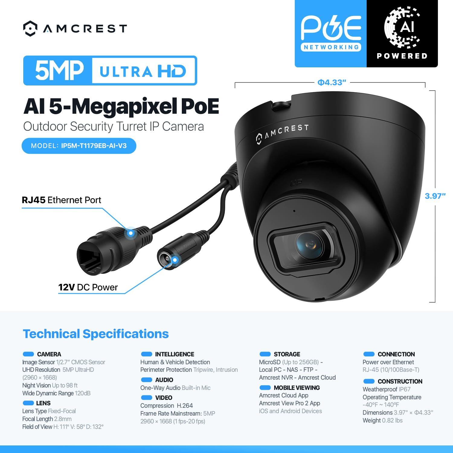 DAY OR NIGHT, RAIN OR SHINE – Built to weather any storm and the darkest of nights, this 5-Megapixel Turret PoE IP Camera features a heavy-duty weatherproof IP67 housing as well as a CMOS technology image sensor to achieve night-vision up to 98 feet. AI Features include IVS: Tripwire & Intrusion. Smart Motion Detection includes Human & Vehicle Detection. H.264 compression allows for maximum encryption with the latest technology.