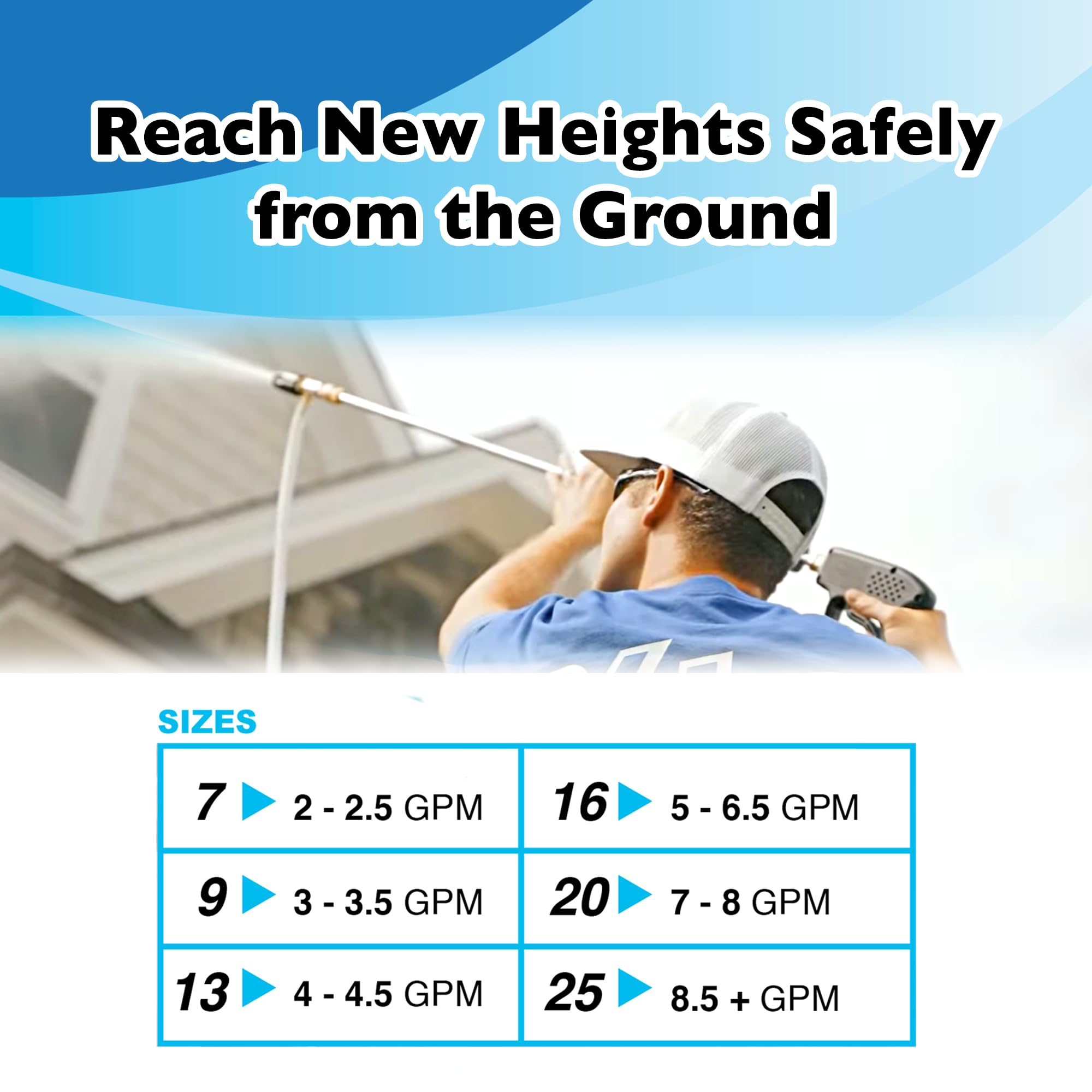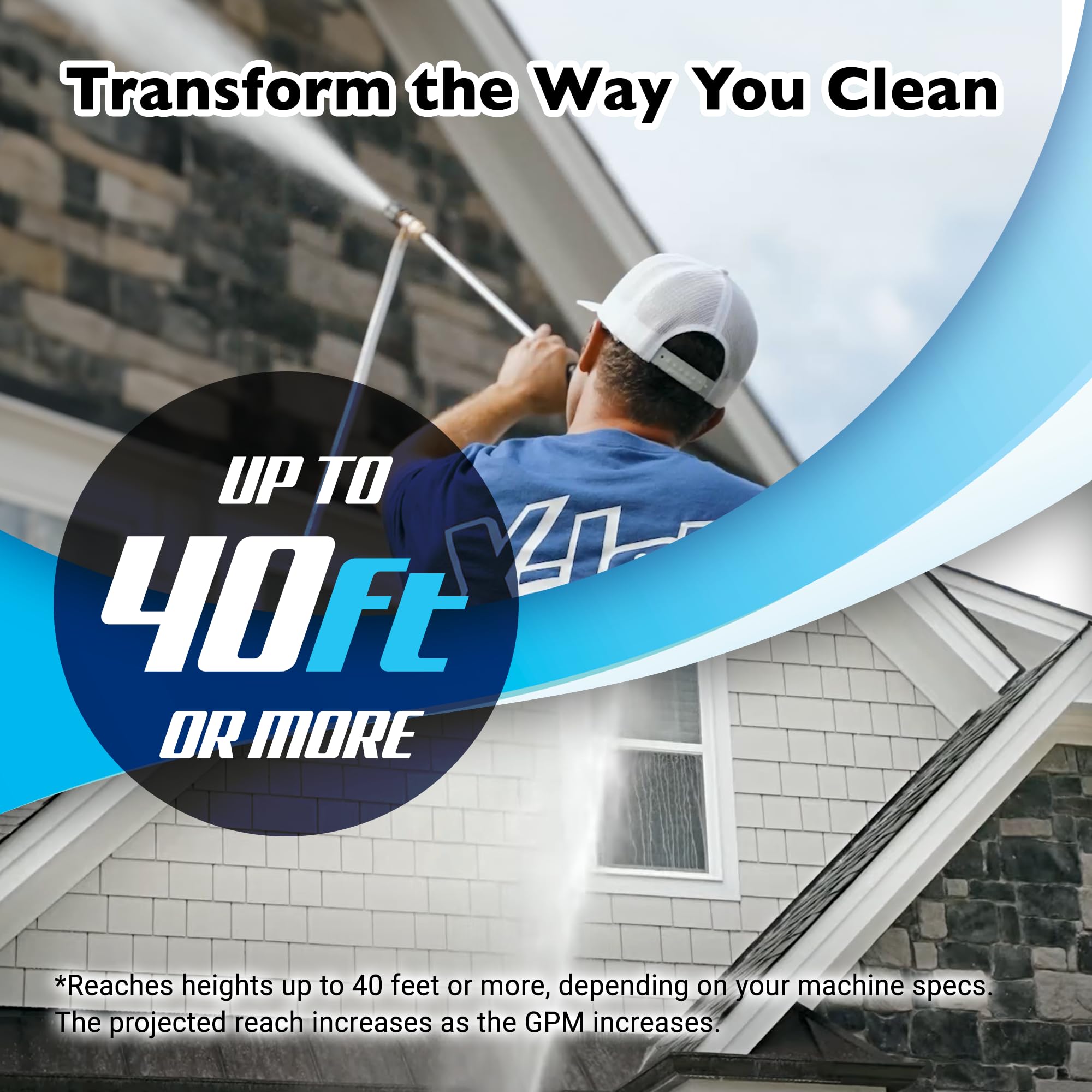 Safe and Convenient Cleaning from the Ground: The X-Jet M5 allows you to wash surfaces from the ground, reaching heights of up to 40ft or more, depending on your machine's specifications. With no need for ladders or lifts, you can clean high places with confidence. (The higher the GPM the higher the reach expected)