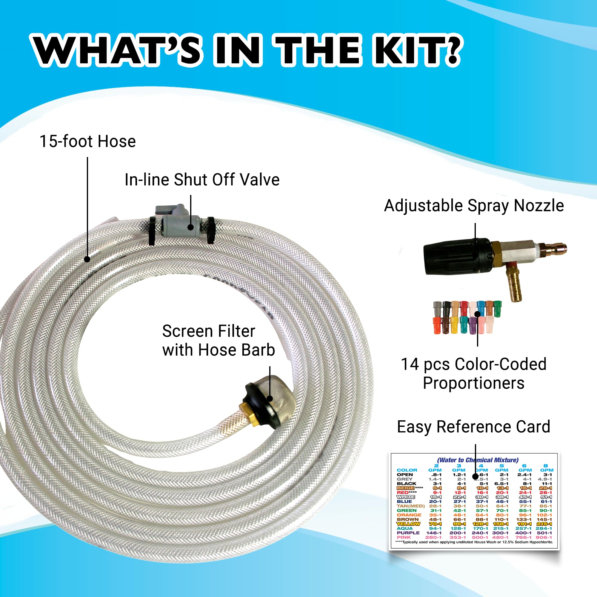 Cleaning Solution Mixing for Optimal Cleaning Results: The X-Jet M5 comes with a 15-color coded proportioner set and a 15ft hose assembly with an inline shut off valve and tank screen filter, making accurate cleaning solution mixing effortless. Clean like a pro with optimal cleaning results.