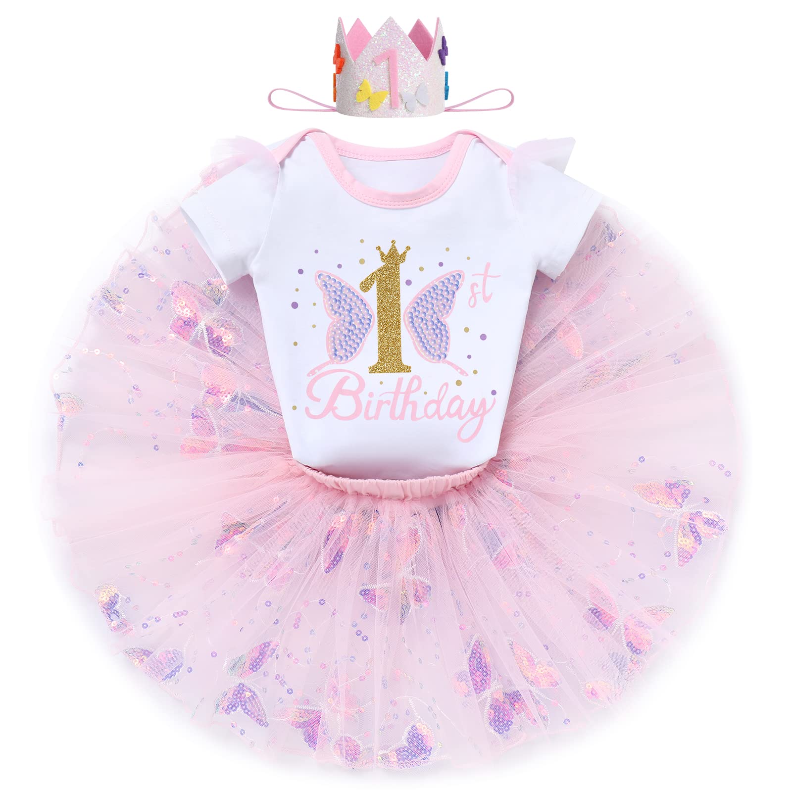 Matching Butterfly Crown Headwear: Beautiful sequins butterfly fairy theme party outfits, infant princess butterfly costume with butterfly romper tutu dress clothes set. The matching crown headband headwear, cute and adorable colorful butterflies and No. 1 for first birthday, shiny and lovely on baby's head. You can change it with a butterfly smash cake topper or butterfly party hat, complete it a full butterfly look for theme party.