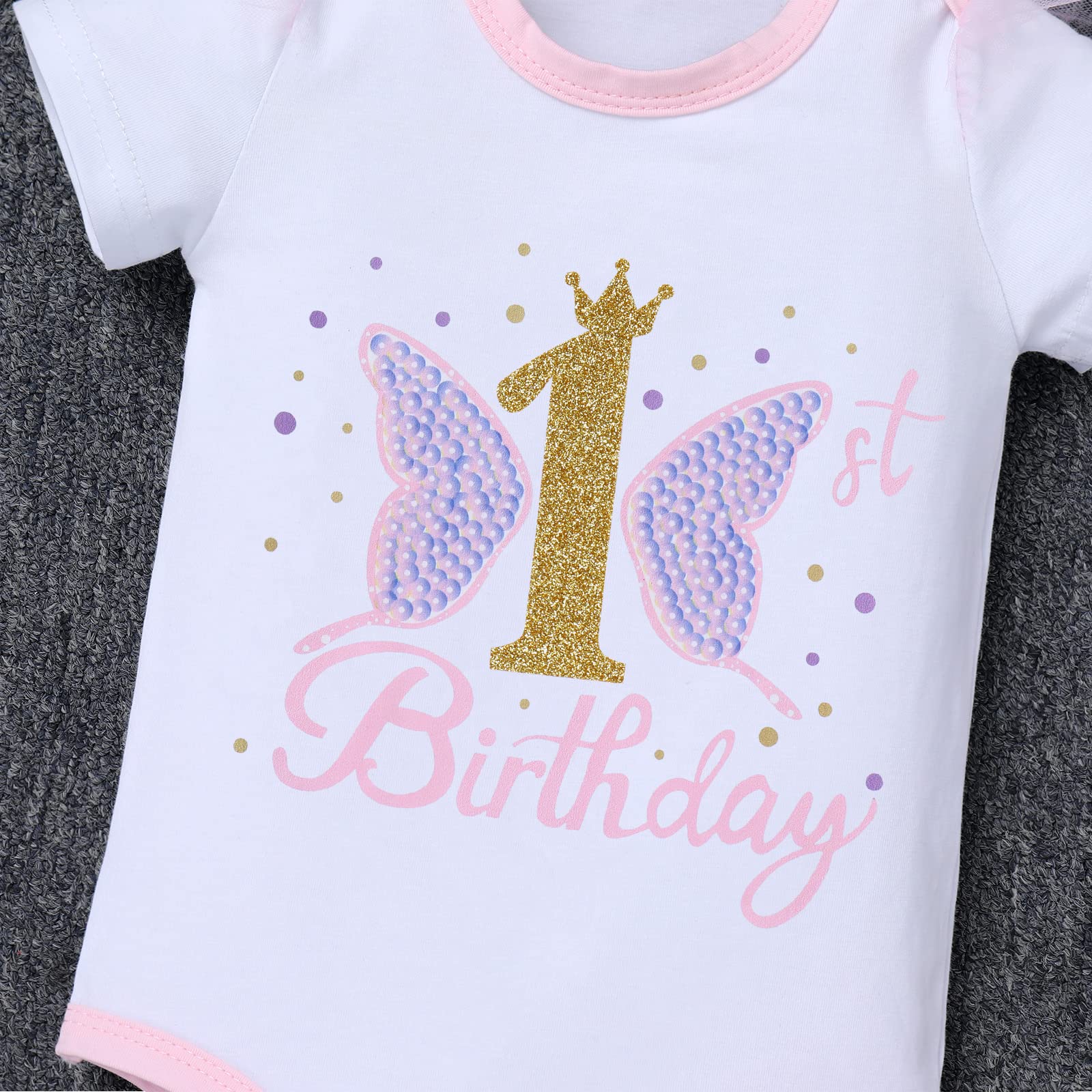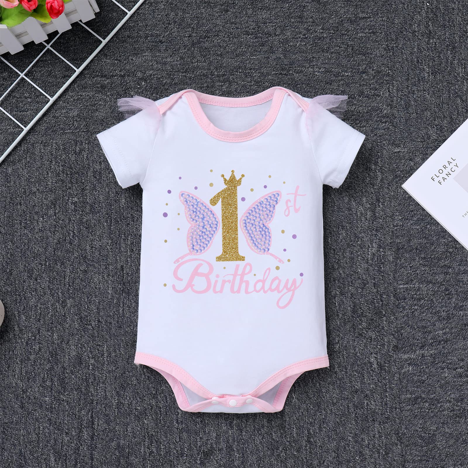 1st Birthday Butterfly Theme Outfit: Baby girls butterfly 1st birthday tutu outfit sequins butterfly romper tutu skirt headband princess dress up costume outfits. White flutter ruffle short sleeve o-neck romper, designed 1st birthday butterfly sequins wings and gold crown "1", glitter My 1st Birthday One letters, special for baby butterfly theme birthday party supplies. Bodysuit lapped shoulder with flying mesh, cute and lovely. Open crotch with 3 snaps for changing diaper conveniently.