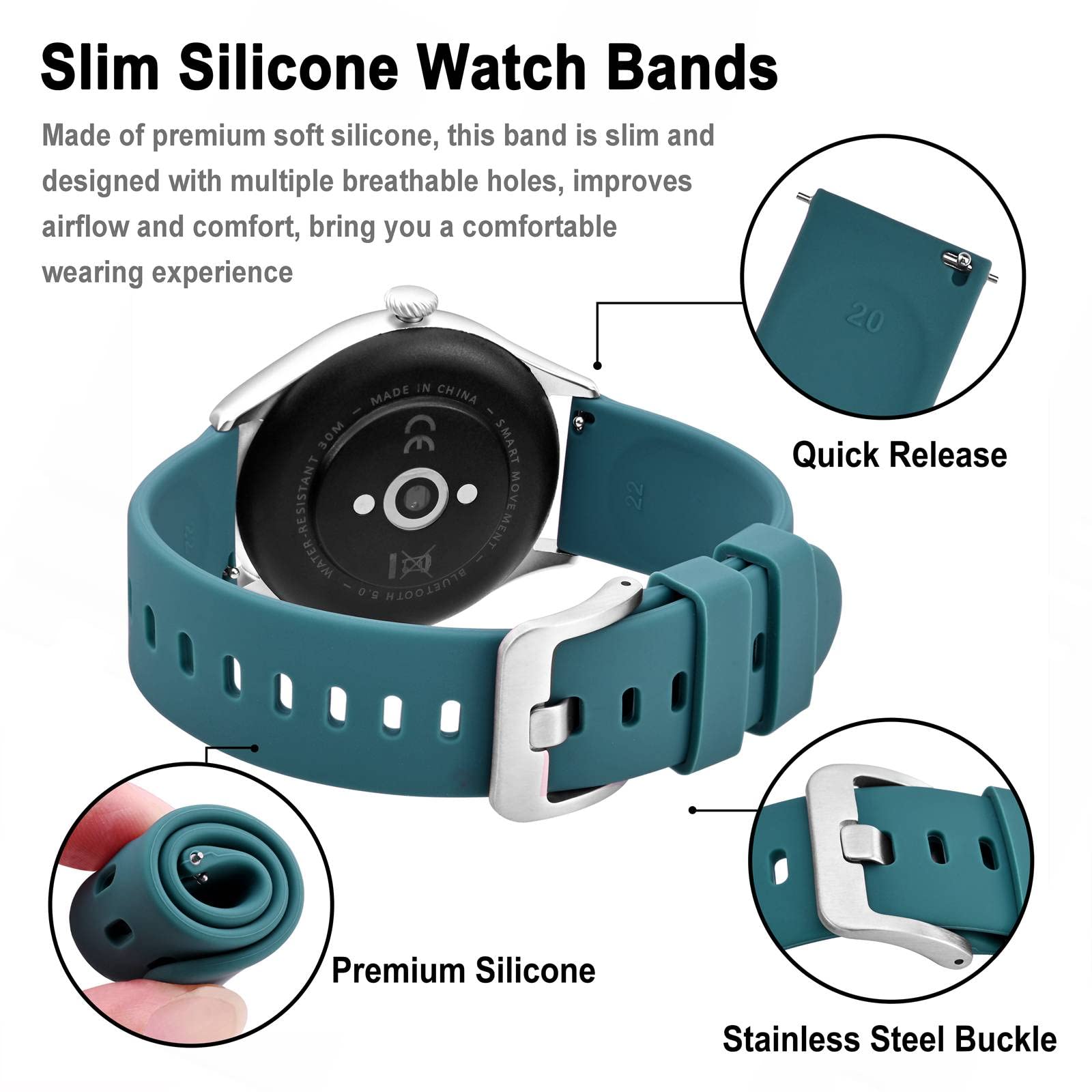 Band Material: Made of premium soft silicone, this watch strap is durable, flexible, sweat-resistant, skin-friendly, washable, odorless, no fading