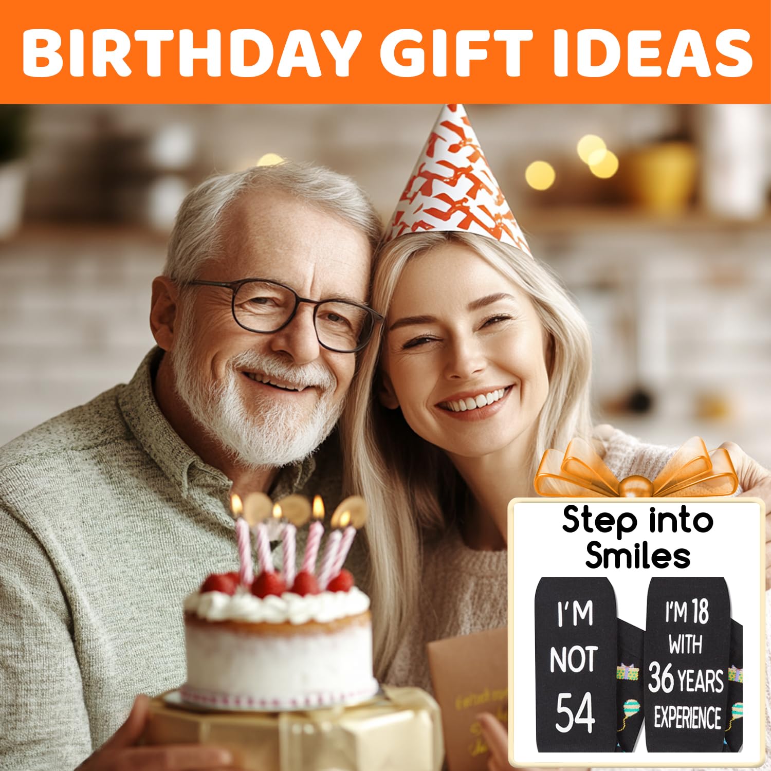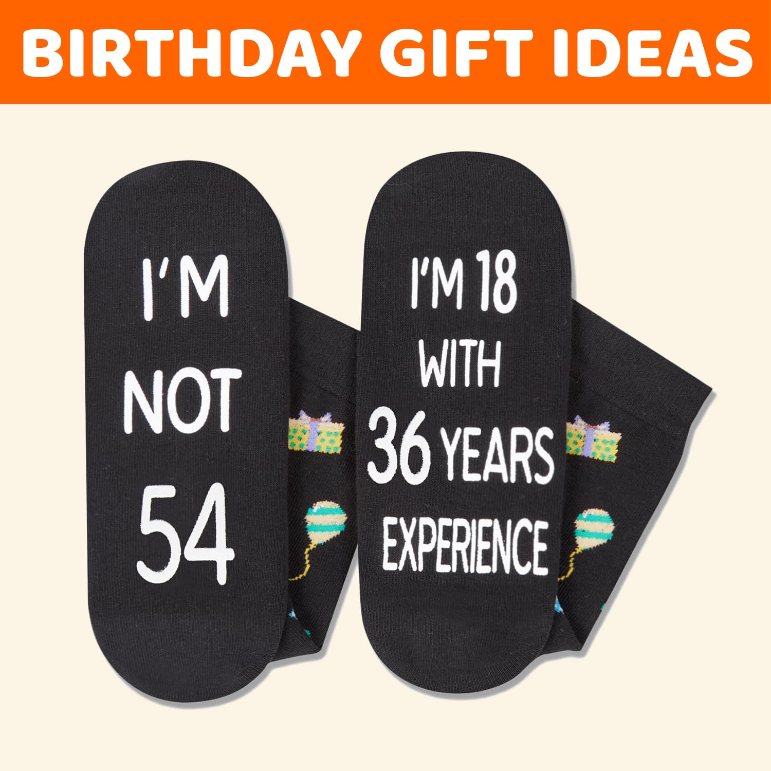 54 BIRTHDAY GIFT IDEAS: "I'M NOT 54, I'M 18 WITH 36 YEARS EXPERIENCE." These birthday socks feature a funny saying that reads These are suitable for any holiday gifts, like Birthday gifts, Christmas gifts, or White Elephant gifts.