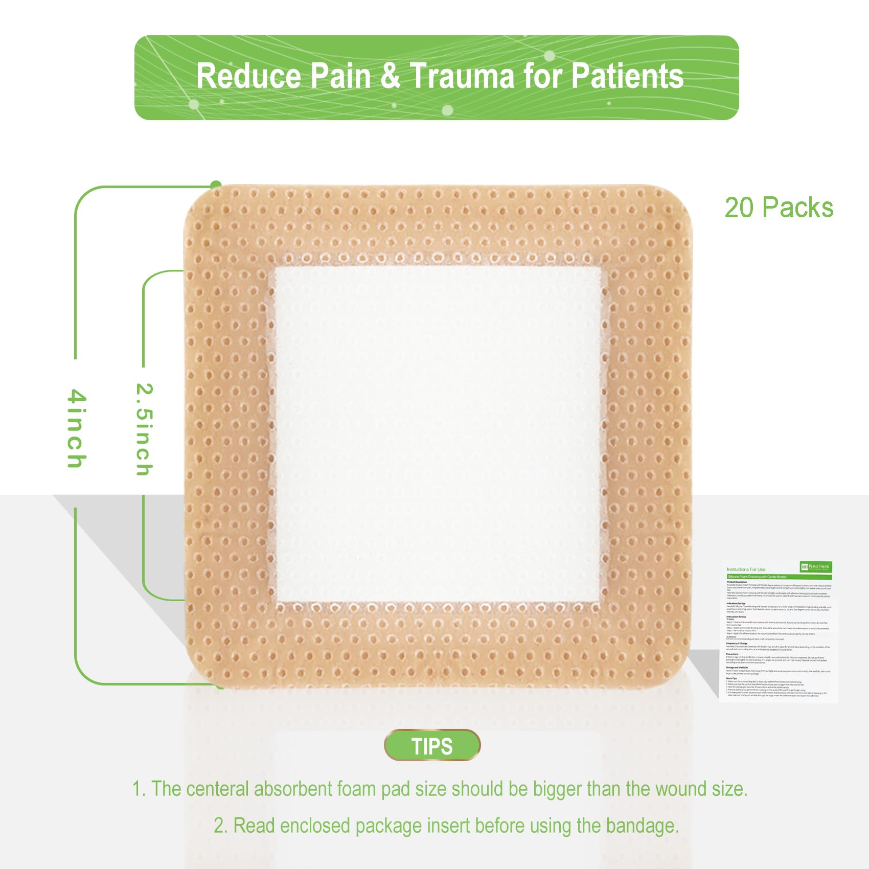 ✅ Individual package, dressing size is 4 in. x 4 in., absorbent pad size is 2.5 in. x 2.5 in., 20 packs each box. Not made with natural rubber latex. Relieve pain and suffering, enable to move easily, add comfort and enhanced healing.